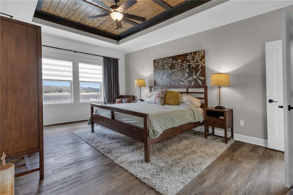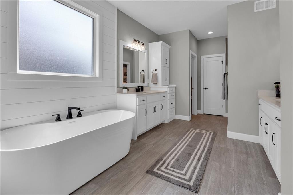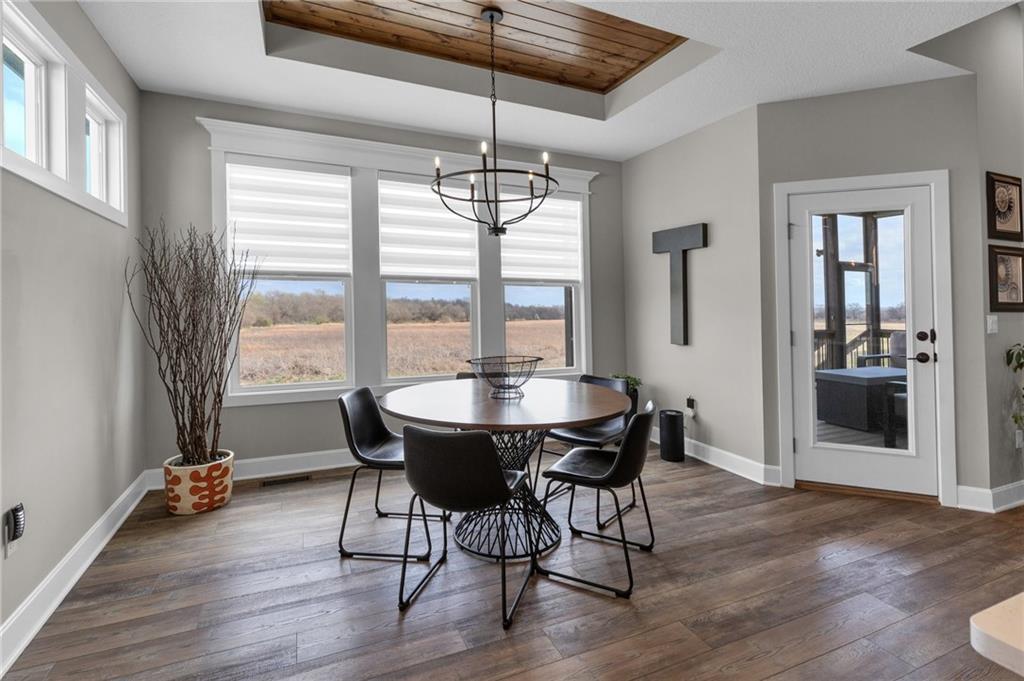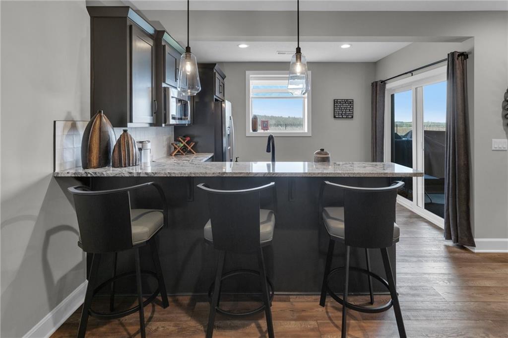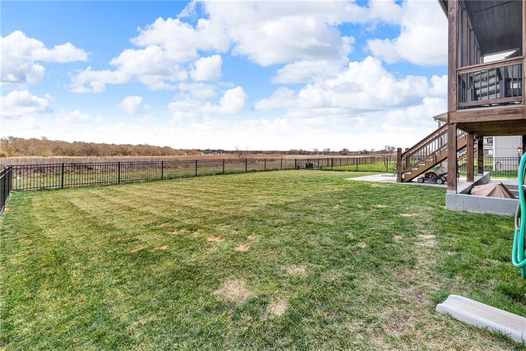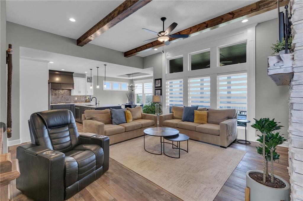 Welcome to 17701 Crystal St in the highly desirable Wolf Run Development! This fully upgraded home offers the option of attending Spring Hill OR Blue Valley School District (open enrollment available per KS House Bill 2567), with schools just 0.7 to 1.7 miles away. This home features 4 or 5 bedrooms (one used as an office) and 3.5 baths, with LVP flooring throughout, plus upgraded carpet in two lower-level bedrooms. The kitchen shines with quartz countertops, a touch-screen oven with built-in air fryer, professional gas cooktop with vented hood, and a vaulted dining area ceiling. Modern window treatments balance privacy and natural light. Step into a fully screened outdoor living space, equipped with professionally installed Sun Shades. The lower-level bath has a glass-enclosed shower, and a tankless water heater ensures endless hot water. The zero-entry master shower boasts two heads and a bench seat for stress relief. The master bedroom features a wood-vault ceiling and private porch access, while the closet offers pull-down rods to maximize storage. The entryway features stunning shiplap and a handcrafted vaulted ceiling, leading to the great room, where wood beams, a vented gas fireplace, and a mantle add warmth and charm. The lower level offers a half kitchen with granite countertops, ample storage, and space for entertainment or game tables. The expanded office includes soundproofing, extra outlets, and an ideal work-from-home environment. The 3-car garage easily fits large vehicles and includes overhead storage for optimal space use. The fully fenced backyard ensures safety for children and pets. A sprinkler system covers all beds and grassy areas, with an easy-to-use programmable system in the garage.