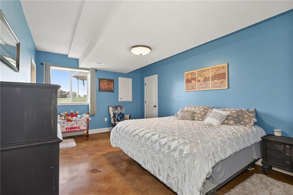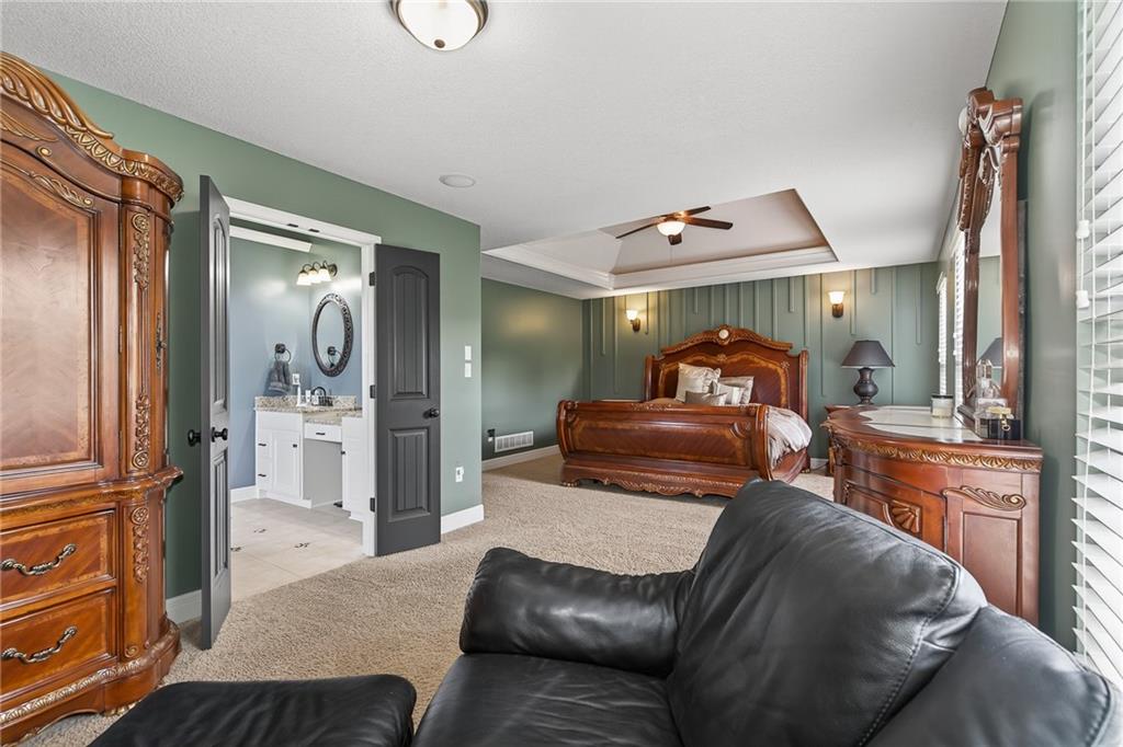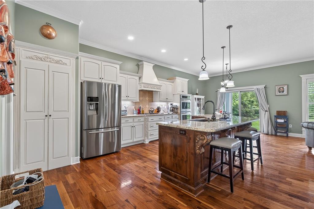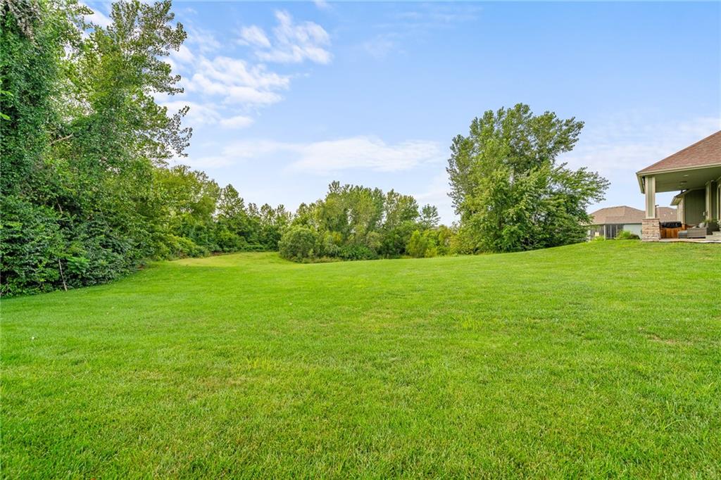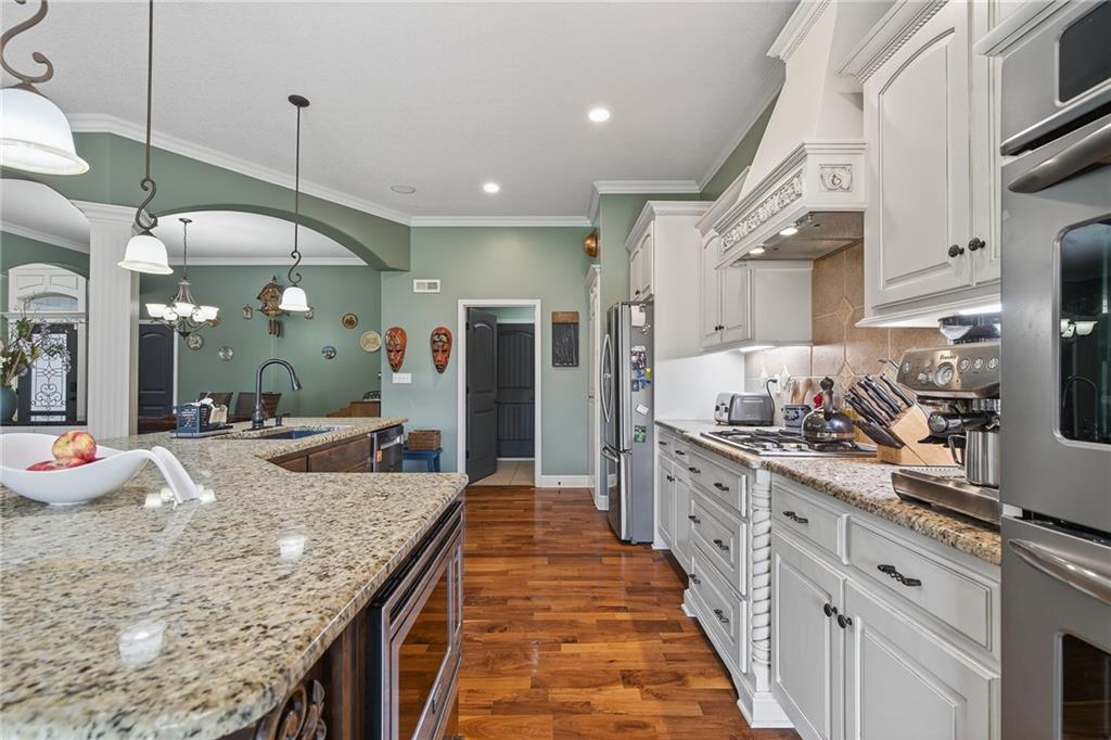 Stunning 5 bedroom, 3.5 bath true ranch home with a 3-car garage, offering an ideal blend of elegance and functionality. The open concept great room features gleaming hardwood floors, a cozy fireplace, built-ins, and a ceiling fan for year-round comfort. The gourmet kitchen is a chef’s dream, complete with custom cabinetry, built-in stainless steel appliances—including a gas cooktop, double ovens, microwave, hood, and dishwasher, an island, hardwood flooring, and a generous walk-in pantry with a convenient pass-through door from the garage. A formal dining room with hardwood floors provides the perfect space for entertaining. Bedroom #3 with French doors and hardwood floors, offers a flexible space ideal for a home office. The spacious primary suite boasts vaulted ceilings, a sitting room, walk-in closet, and a luxurious en-suite bath with double vanities, a jetted tub, separate shower, and tile flooring. The full finished basement expands the living space with a large family room, rec room, wet bar, gym, two additional bedrooms, and 1.5 baths. Outdoor living is equally impressive with a covered patio featuring a built-in kitchen and sun shades are perfect for relaxing or entertaining (Grill/Egg Not Included). Security System, Speaker System, Sprinkler System! Blue Springs School District!