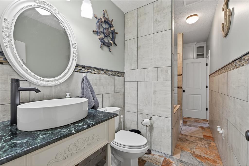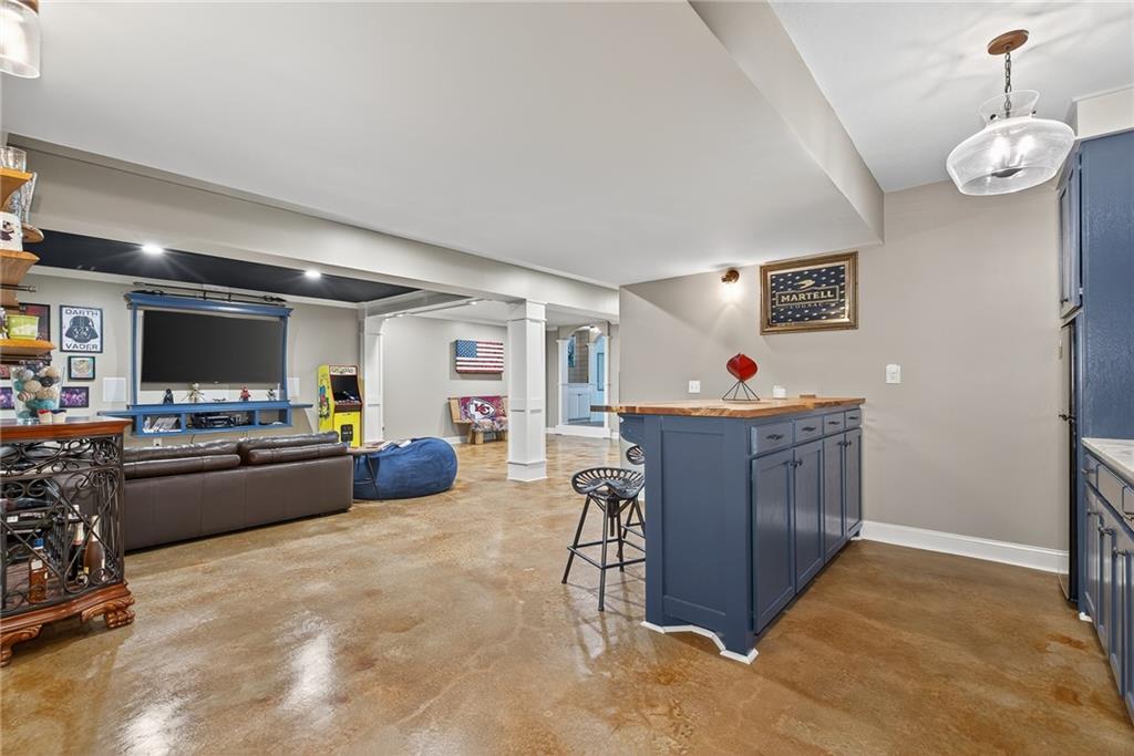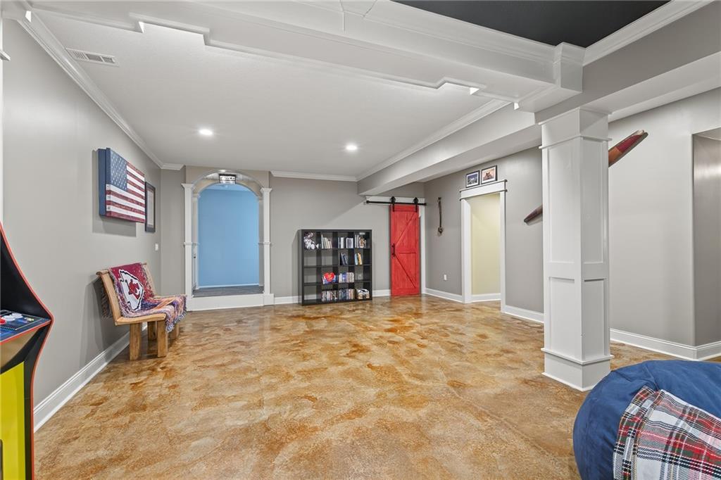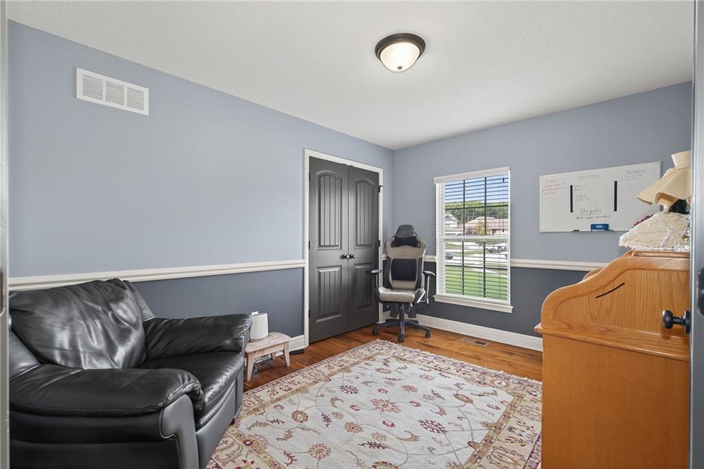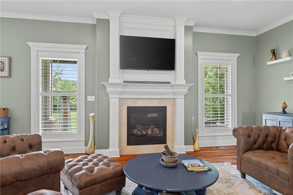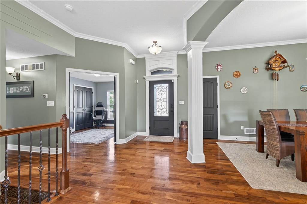 Stunning 5 bedroom, 3.5 bath true ranch home with a 3-car garage, offering an ideal blend of elegance and functionality. The open concept great room features gleaming hardwood floors, a cozy fireplace, built-ins, and a ceiling fan for year-round comfort. The gourmet kitchen is a chef’s dream, complete with custom cabinetry, built-in stainless steel appliances—including a gas cooktop, double ovens, microwave, hood, and dishwasher, an island, hardwood flooring, and a generous walk-in pantry with a convenient pass-through door from the garage. A formal dining room with hardwood floors provides the perfect space for entertaining. Bedroom #3 with French doors and hardwood floors, offers a flexible space ideal for a home office. The spacious primary suite boasts vaulted ceilings, a sitting room, walk-in closet, and a luxurious en-suite bath with double vanities, a jetted tub, separate shower, and tile flooring. The full finished basement expands the living space with a large family room, rec room, wet bar, gym, two additional bedrooms, and 1.5 baths. Outdoor living is equally impressive with a covered patio featuring a built-in kitchen and sun shades are perfect for relaxing or entertaining (Grill/Egg Not Included). Security System, Speaker System, Sprinkler System! Blue Springs School District!