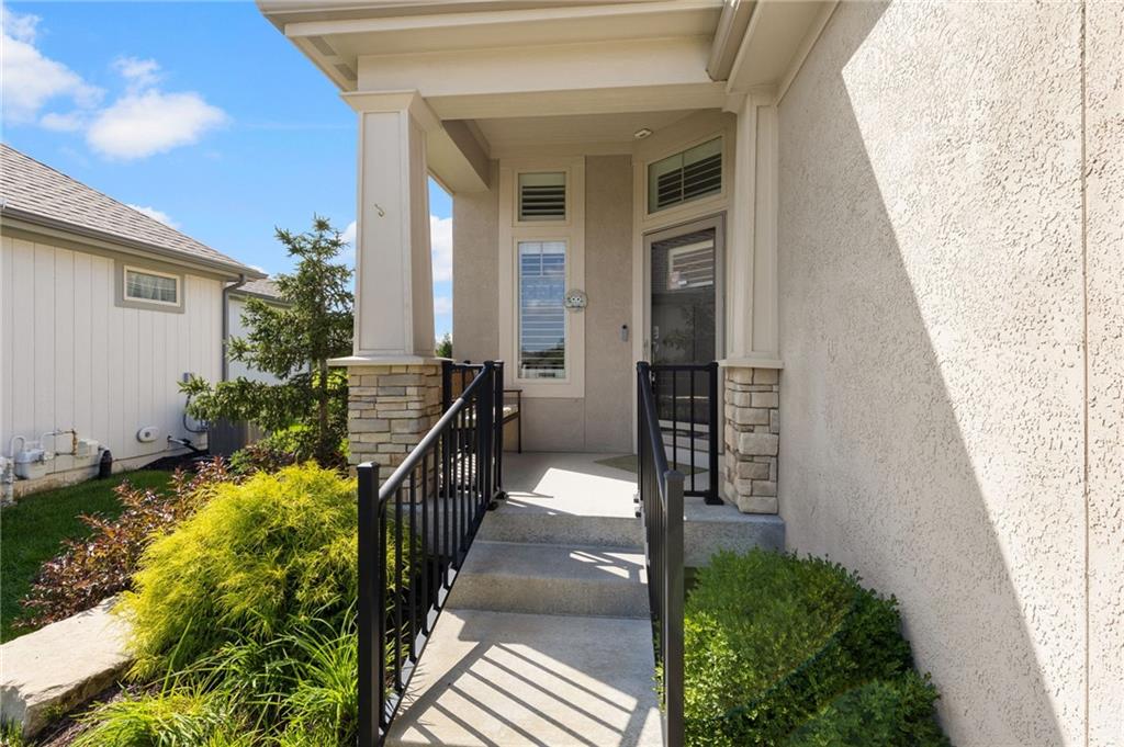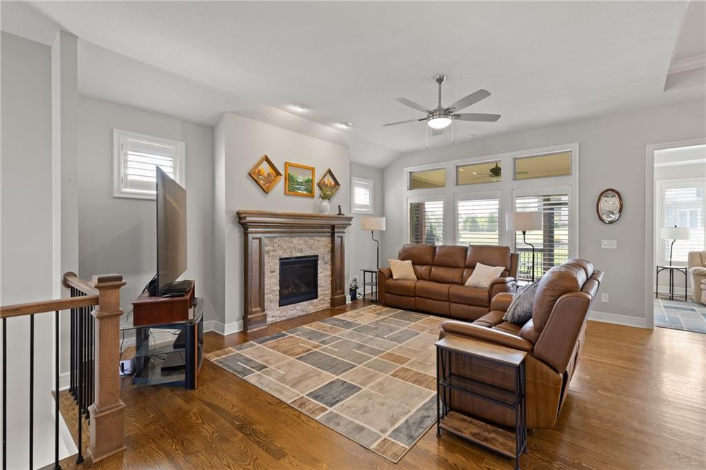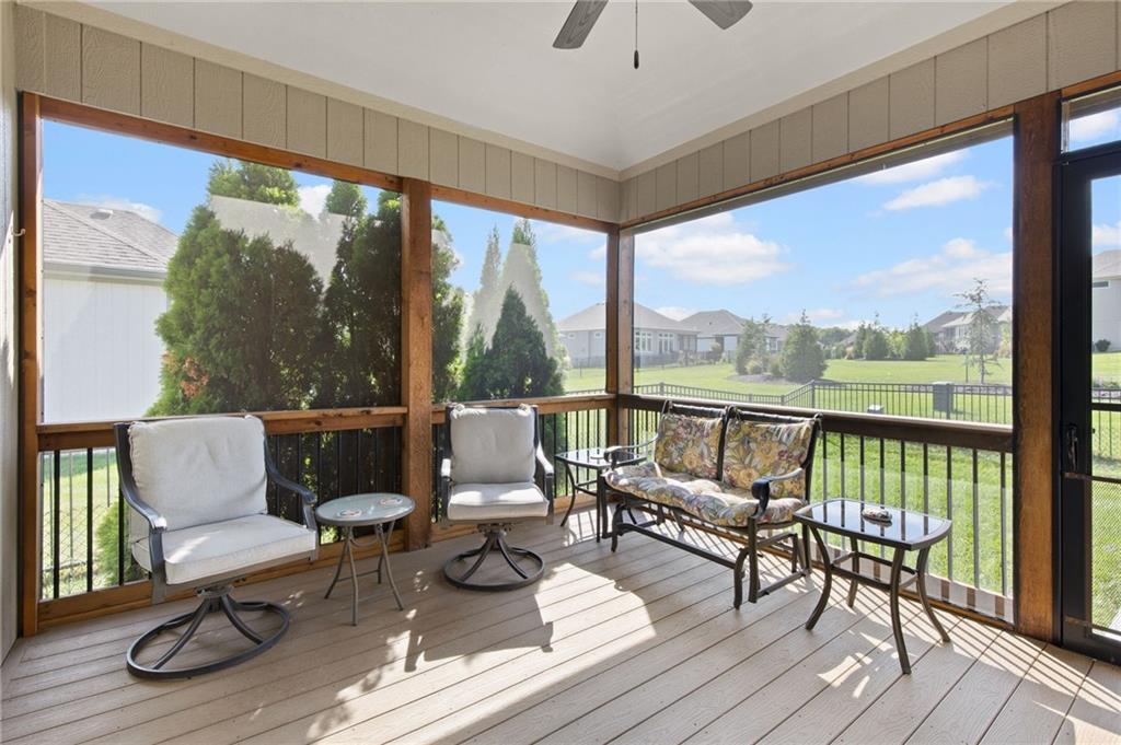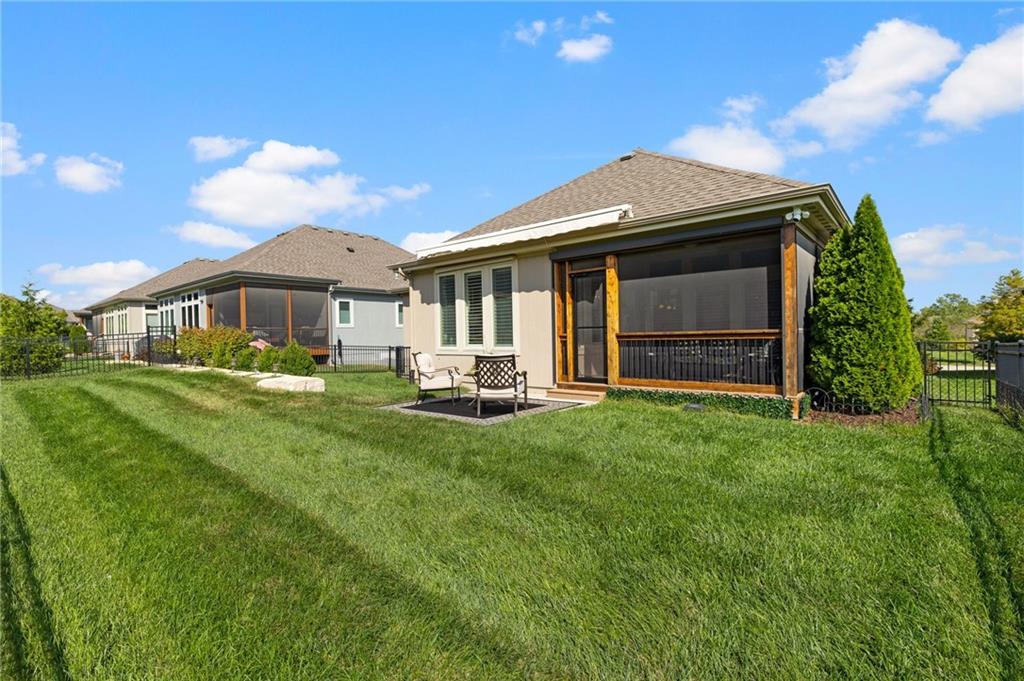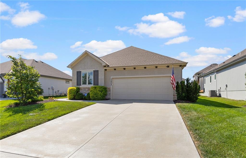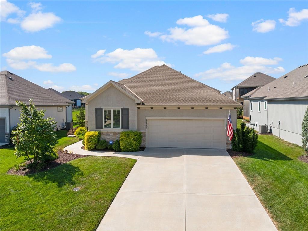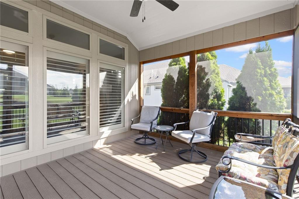 Nearly new patio villa in highly sought-after Solera Reserve! Enjoy maintenance-provided living in a friendly, walkable community surrounded by lush lawns and beautifully manicured landscaping. The inviting stucco exterior with stone ledge accents and cedar shutters welcomes you to a covered front porch and angled full-glass storm door. Inside, hardwood floors flow through the hallway and main living areas, complemented by classic plantation shutters for timeless character. A vaulted secondary bedroom and nearby full bath with granite counters, tile flooring, and a shower/tub combo offer the perfect space for guests or a home office. The open-concept great room features hardwoods, a stone-surround gas fireplace, and large windows overlooking the covered, screened-in deck. The kitchen is a showstopper—granite island with breakfast bar, stainless steel appliances including a gas range and refrigerator, vent hood, coffee bar, under-cabinet lighting, and walk-in pantry, with direct access to the laundry room. The sunny breakfast nook opens to a four-season sunroom that flows seamlessly to the screened-in deck—ideal for entertaining or relaxing evenings at home. The primary suite offers a stepped ceiling, plush carpet, and a spa-like bath with granite counters and an oversized Euro shower. The expansive walk-in closet connects conveniently to the laundry. The finished lower level adds a spacious rec room with granite wet bar, egress window, two additional bedrooms, and a full bath. Extras include washer/dryer, sprinkler system, security system, radon mitigation, sump pump with battery backup, SunSetter awning, tankless water heater, whole-house water filter, and Generac generator. Enjoy resort-style living with a community pool, clubhouse, lawn care, trimming, snow removal, and sprinkler winterization all included!
