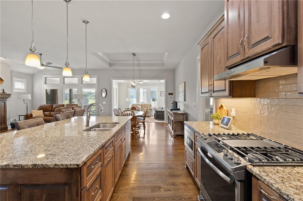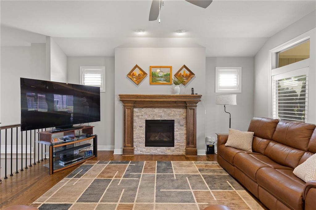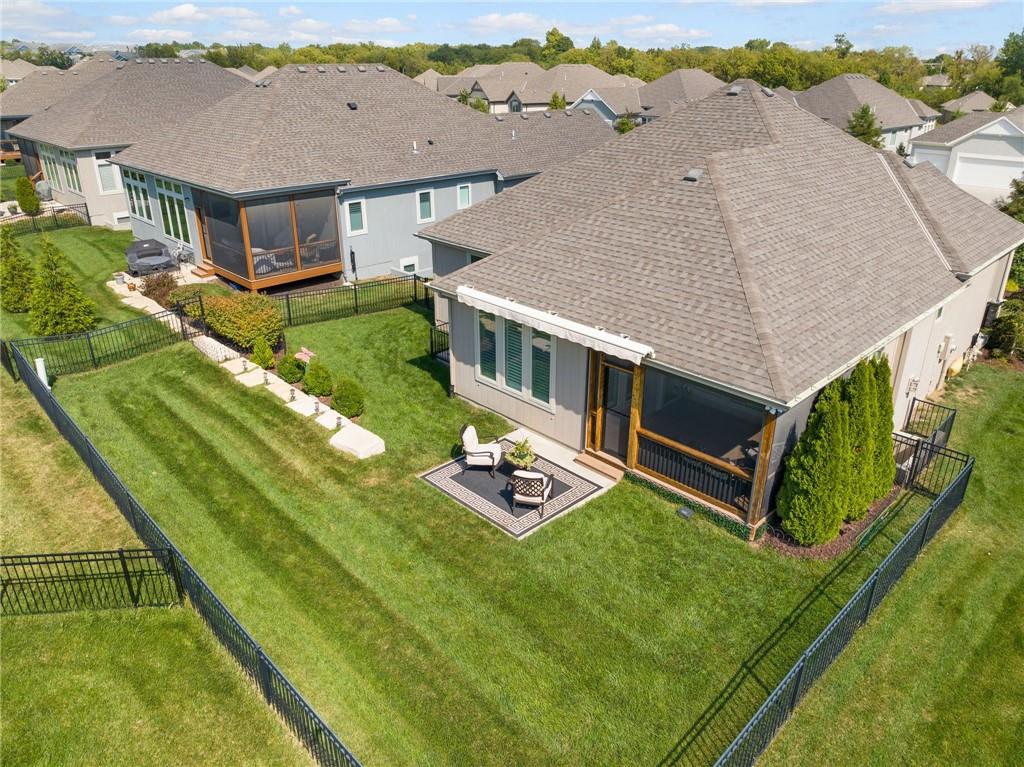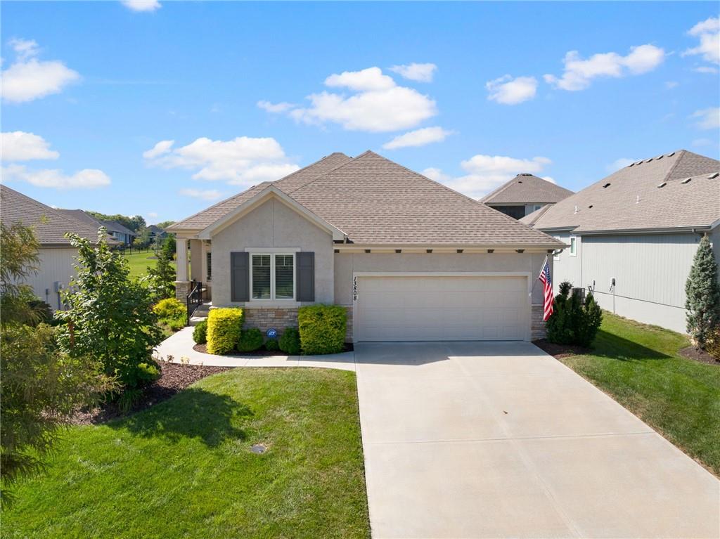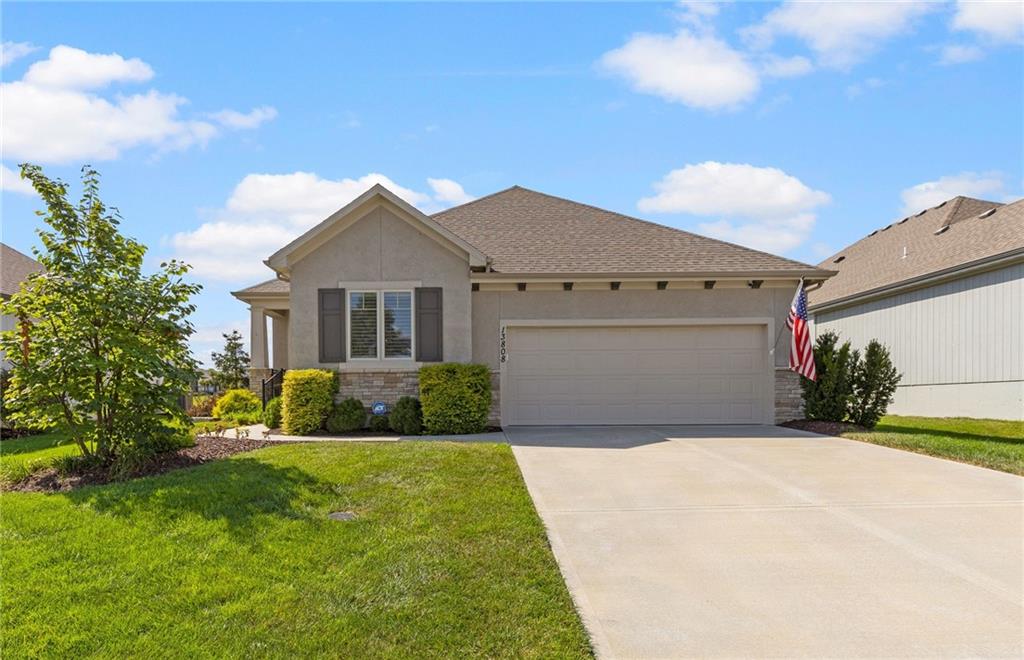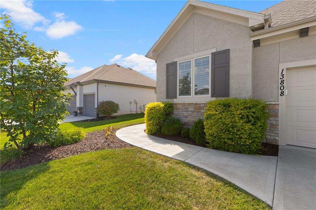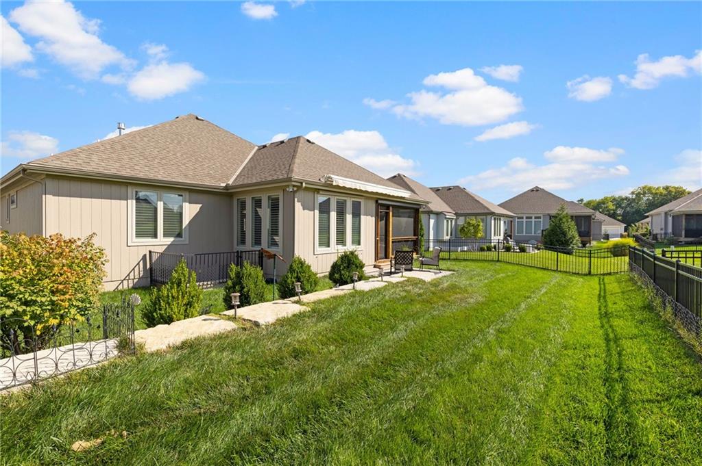 Nearly new patio villa in highly sought-after Solera Reserve! Enjoy maintenance-provided living in a friendly, walkable community surrounded by lush lawns and beautifully manicured landscaping. The inviting stucco exterior with stone ledge accents and cedar shutters welcomes you to a covered front porch and angled full-glass storm door. Inside, hardwood floors flow through the hallway and main living areas, complemented by classic plantation shutters for timeless character. A vaulted secondary bedroom and nearby full bath with granite counters, tile flooring, and a shower/tub combo offer the perfect space for guests or a home office. The open-concept great room features hardwoods, a stone-surround gas fireplace, and large windows overlooking the covered, screened-in deck. The kitchen is a showstopper—granite island with breakfast bar, stainless steel appliances including a gas range and refrigerator, vent hood, coffee bar, under-cabinet lighting, and walk-in pantry, with direct access to the laundry room. The sunny breakfast nook opens to a four-season sunroom that flows seamlessly to the screened-in deck—ideal for entertaining or relaxing evenings at home. The primary suite offers a stepped ceiling, plush carpet, and a spa-like bath with granite counters and an oversized Euro shower. The expansive walk-in closet connects conveniently to the laundry. The finished lower level adds a spacious rec room with granite wet bar, egress window, two additional bedrooms, and a full bath. Extras include washer/dryer, sprinkler system, security system, radon mitigation, sump pump with battery backup, SunSetter awning, tankless water heater, whole-house water filter, and Generac generator. Enjoy resort-style living with a community pool, clubhouse, lawn care, trimming, snow removal, and sprinkler winterization all included!