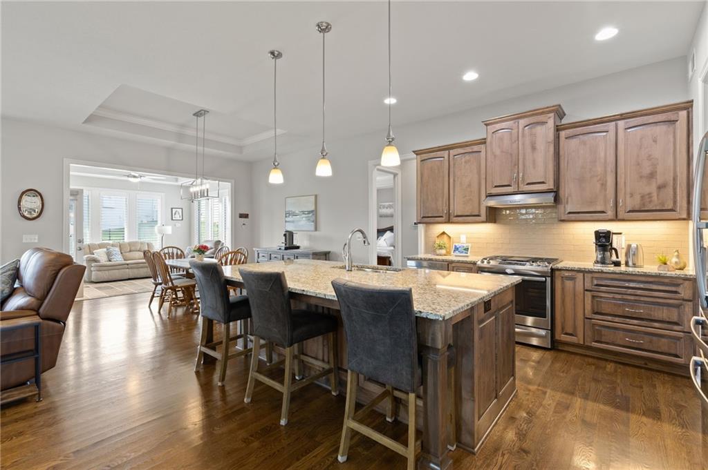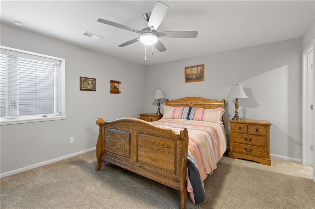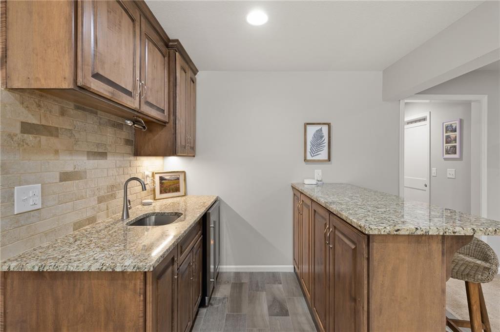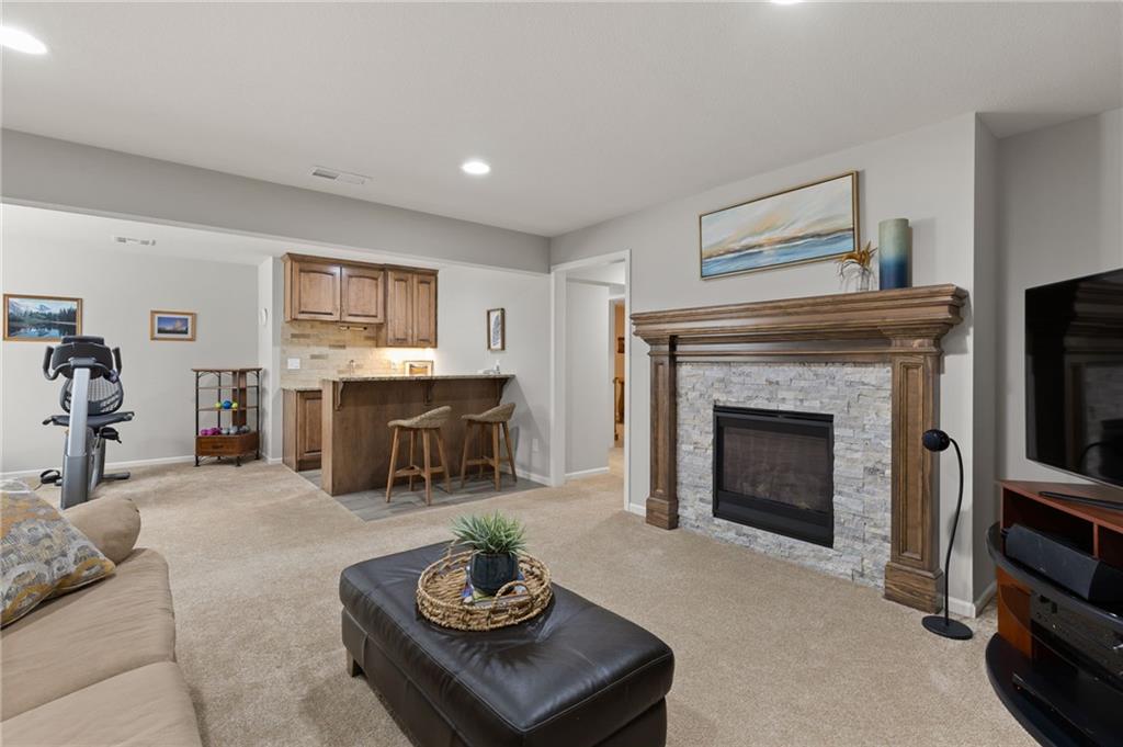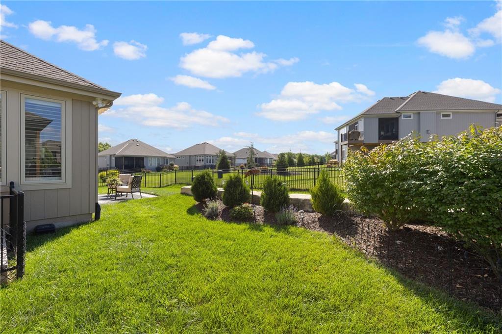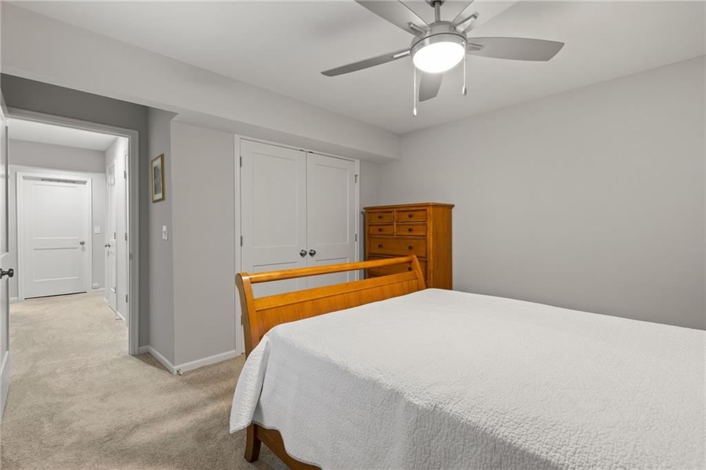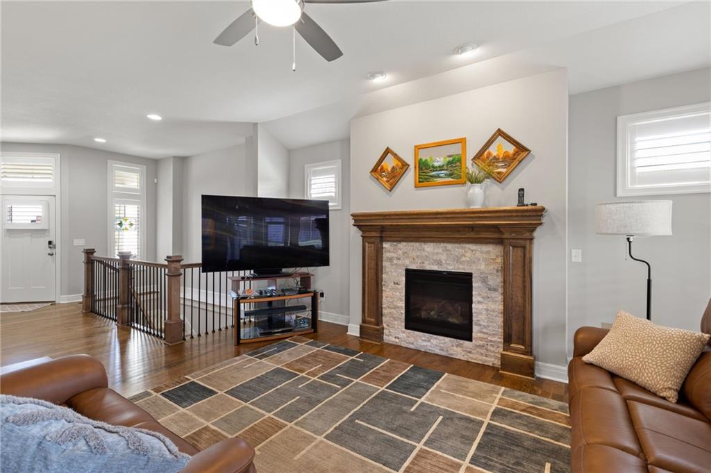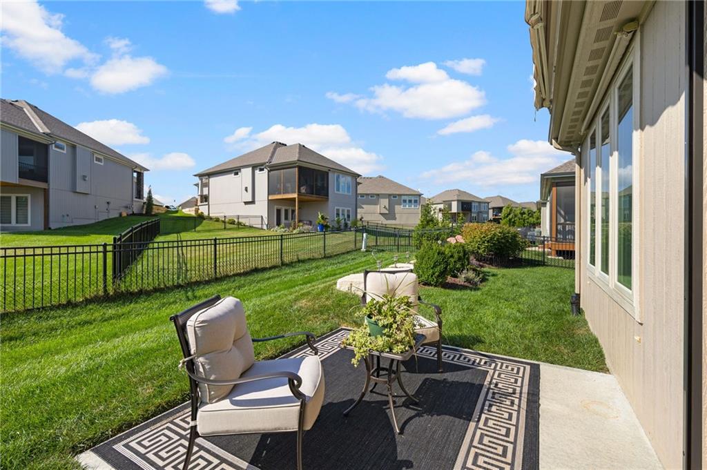 Nearly new patio villa in highly sought-after Solera Reserve! Enjoy maintenance-provided living in a friendly, walkable community surrounded by lush lawns and beautifully manicured landscaping. The inviting stucco exterior with stone ledge accents and cedar shutters welcomes you to a covered front porch and angled full-glass storm door. Inside, hardwood floors flow through the hallway and main living areas, complemented by classic plantation shutters for timeless character. A vaulted secondary bedroom and nearby full bath with granite counters, tile flooring, and a shower/tub combo offer the perfect space for guests or a home office. The open-concept great room features hardwoods, a stone-surround gas fireplace, and large windows overlooking the covered, screened-in deck. The kitchen is a showstopper—granite island with breakfast bar, stainless steel appliances including a gas range and refrigerator, vent hood, coffee bar, under-cabinet lighting, and walk-in pantry, with direct access to the laundry room. The sunny breakfast nook opens to a four-season sunroom that flows seamlessly to the screened-in deck—ideal for entertaining or relaxing evenings at home. The primary suite offers a stepped ceiling, plush carpet, and a spa-like bath with granite counters and an oversized Euro shower. The expansive walk-in closet connects conveniently to the laundry. The finished lower level adds a spacious rec room with granite wet bar, egress window, two additional bedrooms, and a full bath. Extras include washer/dryer, sprinkler system, security system, radon mitigation, sump pump with battery backup, SunSetter awning, tankless water heater, whole-house water filter, and Generac generator. Enjoy resort-style living with a community pool, clubhouse, lawn care, trimming, snow removal, and sprinkler winterization all included!