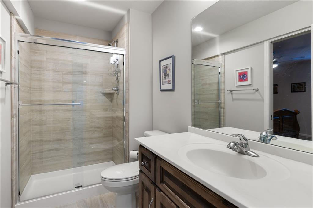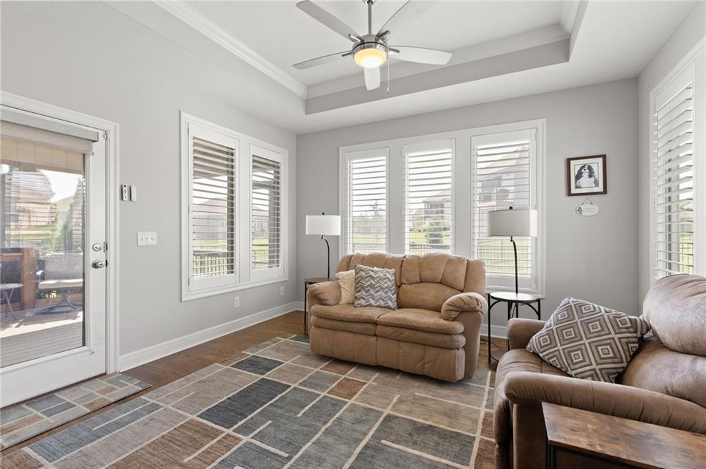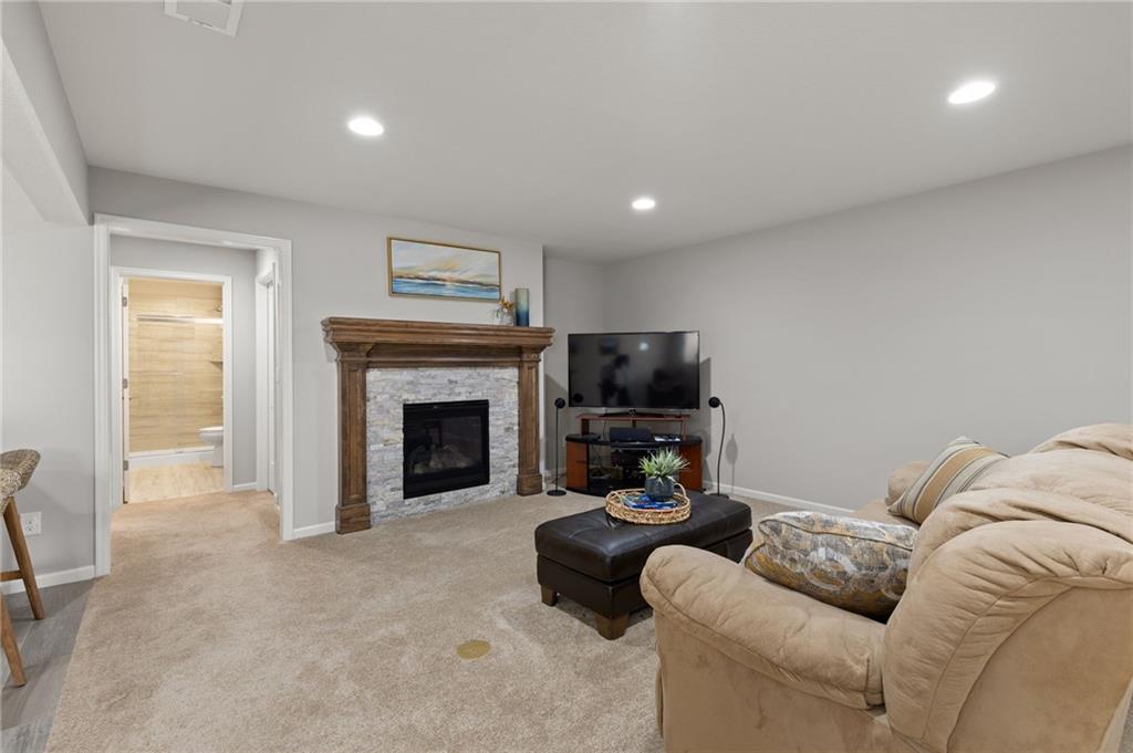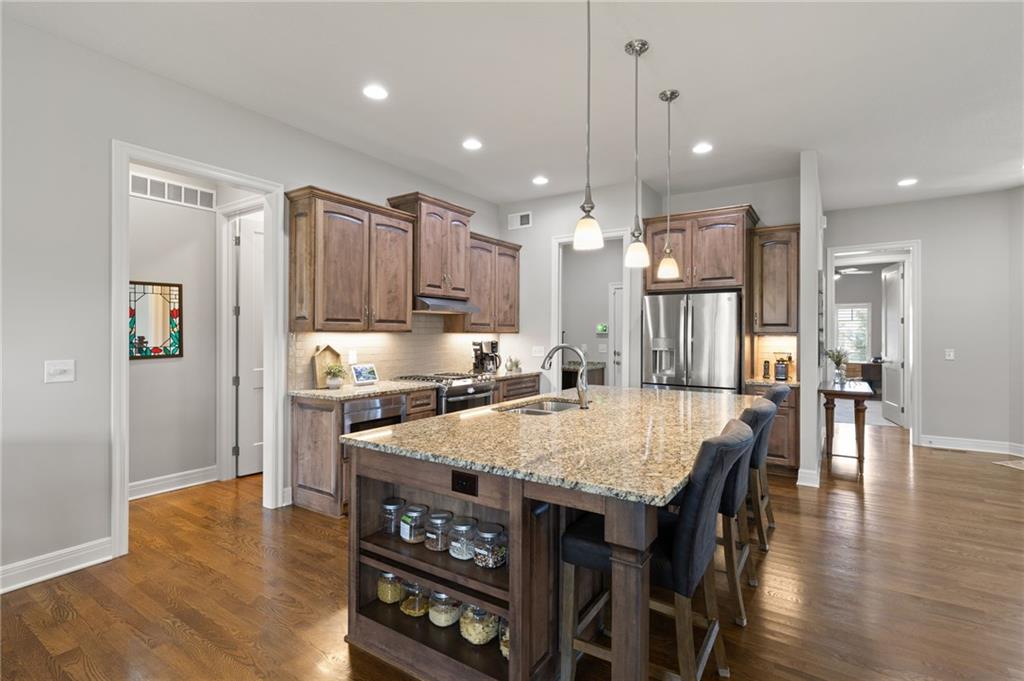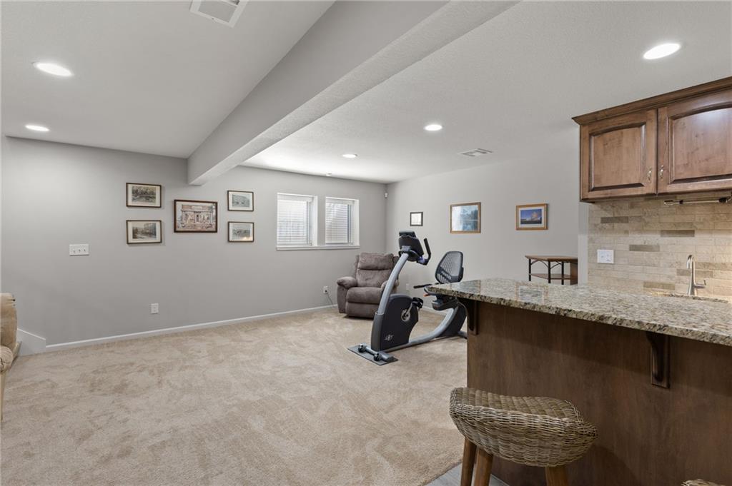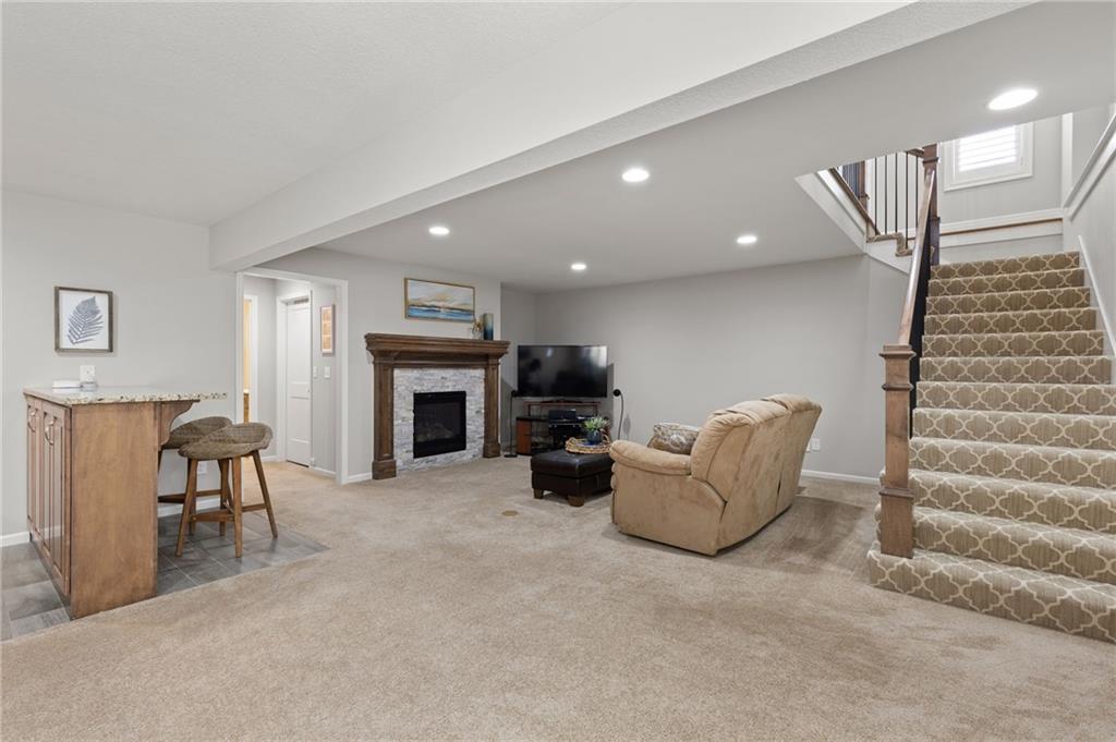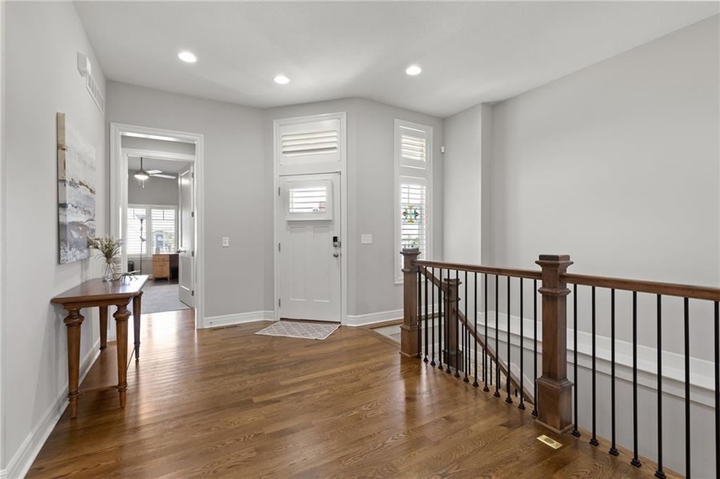 Nearly new patio villa in highly sought-after Solera Reserve! Enjoy maintenance-provided living in a friendly, walkable community surrounded by lush lawns and beautifully manicured landscaping. The inviting stucco exterior with stone ledge accents and cedar shutters welcomes you to a covered front porch and angled full-glass storm door. Inside, hardwood floors flow through the hallway and main living areas, complemented by classic plantation shutters for timeless character. A vaulted secondary bedroom and nearby full bath with granite counters, tile flooring, and a shower/tub combo offer the perfect space for guests or a home office. The open-concept great room features hardwoods, a stone-surround gas fireplace, and large windows overlooking the covered, screened-in deck. The kitchen is a showstopper—granite island with breakfast bar, stainless steel appliances including a gas range and refrigerator, vent hood, coffee bar, under-cabinet lighting, and walk-in pantry, with direct access to the laundry room. The sunny breakfast nook opens to a four-season sunroom that flows seamlessly to the screened-in deck—ideal for entertaining or relaxing evenings at home. The primary suite offers a stepped ceiling, plush carpet, and a spa-like bath with granite counters and an oversized Euro shower. The expansive walk-in closet connects conveniently to the laundry. The finished lower level adds a spacious rec room with granite wet bar, egress window, two additional bedrooms, and a full bath. Extras include washer/dryer, sprinkler system, security system, radon mitigation, sump pump with battery backup, SunSetter awning, tankless water heater, whole-house water filter, and Generac generator. Enjoy resort-style living with a community pool, clubhouse, lawn care, trimming, snow removal, and sprinkler winterization all included!