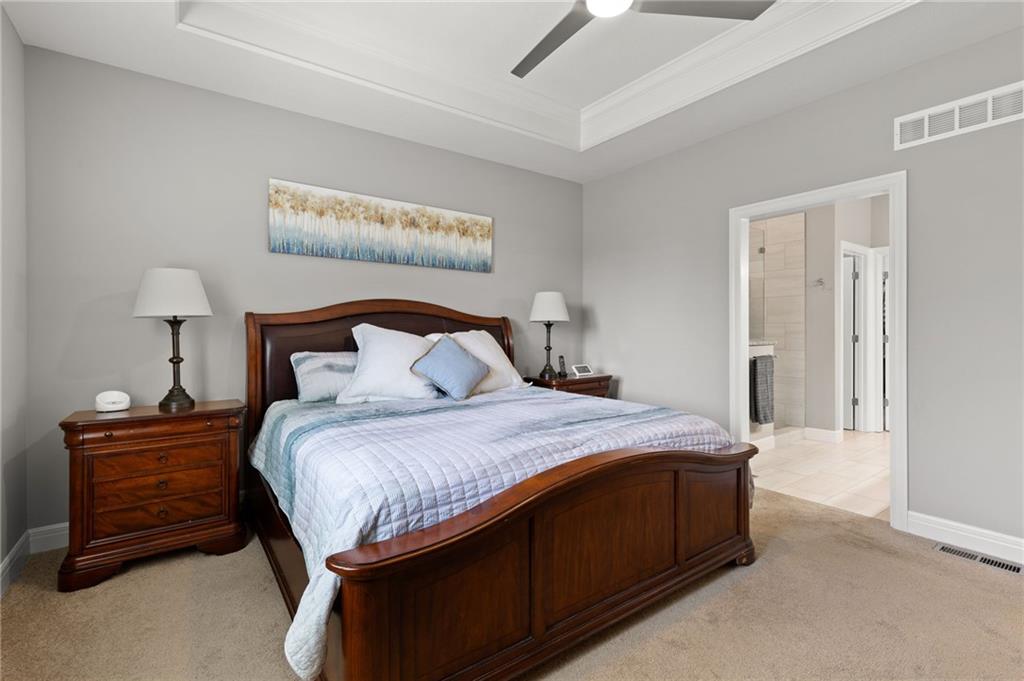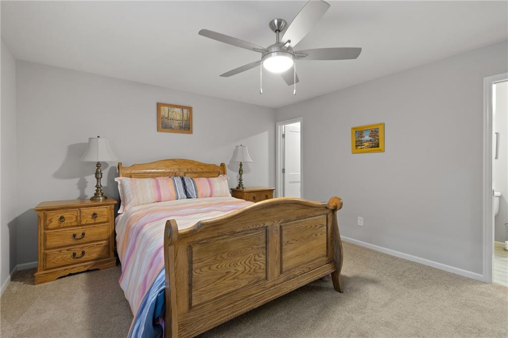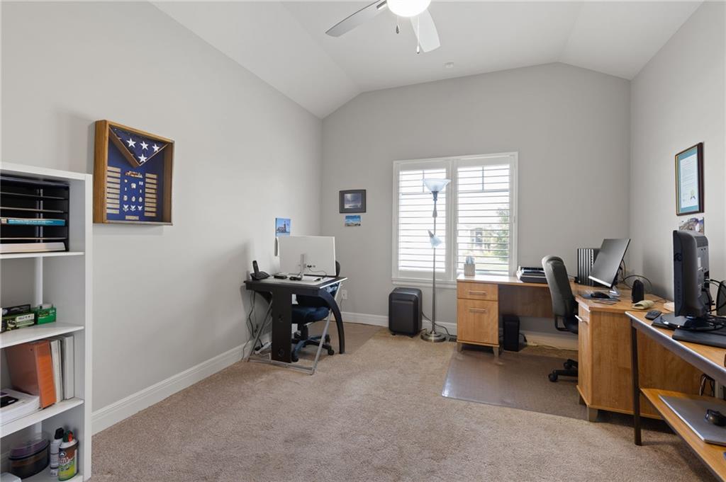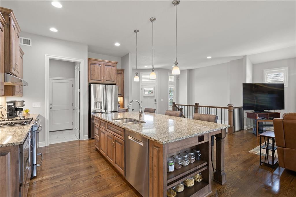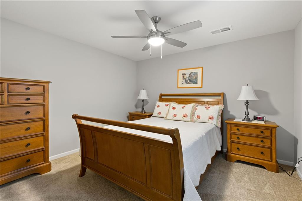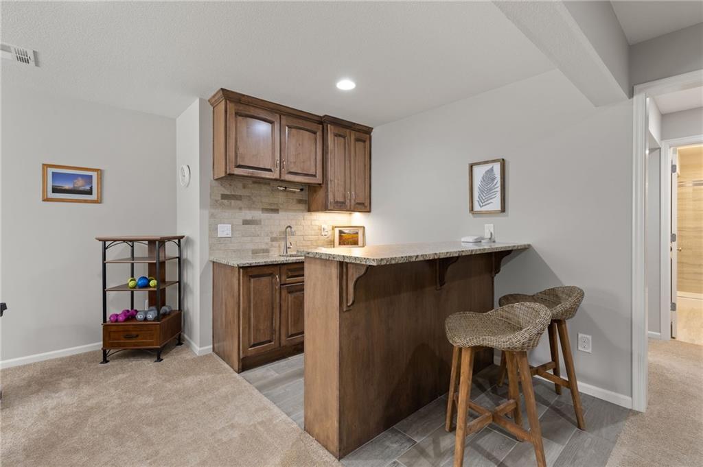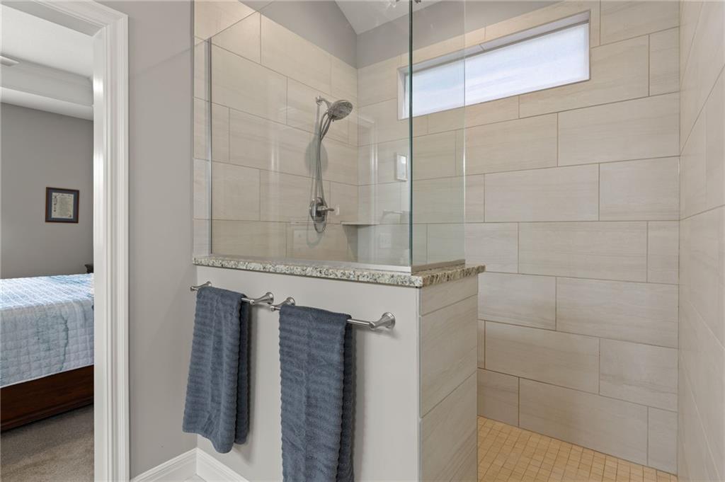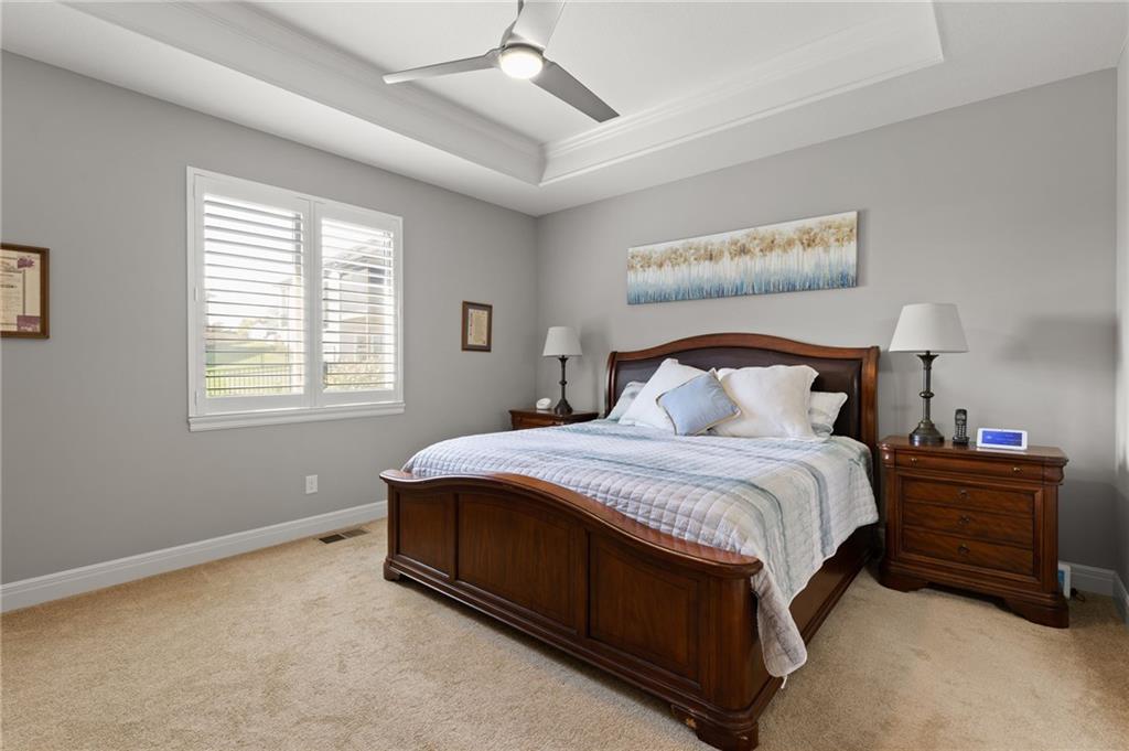 Nearly new patio villa in highly sought-after Solera Reserve! Enjoy maintenance-provided living in a friendly, walkable community surrounded by lush lawns and beautifully manicured landscaping. The inviting stucco exterior with stone ledge accents and cedar shutters welcomes you to a covered front porch and angled full-glass storm door. Inside, hardwood floors flow through the hallway and main living areas, complemented by classic plantation shutters for timeless character. A vaulted secondary bedroom and nearby full bath with granite counters, tile flooring, and a shower/tub combo offer the perfect space for guests or a home office. The open-concept great room features hardwoods, a stone-surround gas fireplace, and large windows overlooking the covered, screened-in deck. The kitchen is a showstopper—granite island with breakfast bar, stainless steel appliances including a gas range and refrigerator, vent hood, coffee bar, under-cabinet lighting, and walk-in pantry, with direct access to the laundry room. The sunny breakfast nook opens to a four-season sunroom that flows seamlessly to the screened-in deck—ideal for entertaining or relaxing evenings at home. The primary suite offers a stepped ceiling, plush carpet, and a spa-like bath with granite counters and an oversized Euro shower. The expansive walk-in closet connects conveniently to the laundry. The finished lower level adds a spacious rec room with granite wet bar, egress window, two additional bedrooms, and a full bath. Extras include washer/dryer, sprinkler system, security system, radon mitigation, sump pump with battery backup, SunSetter awning, tankless water heater, whole-house water filter, and Generac generator. Enjoy resort-style living with a community pool, clubhouse, lawn care, trimming, snow removal, and sprinkler winterization all included!