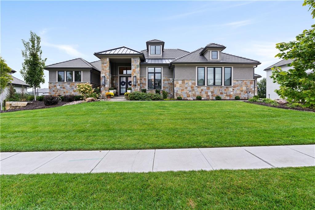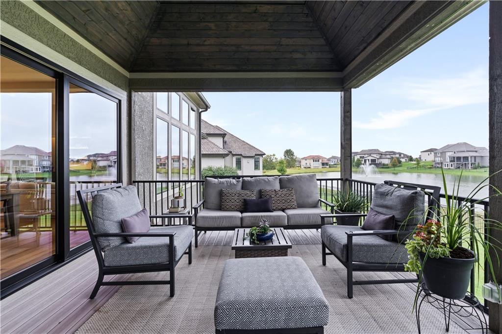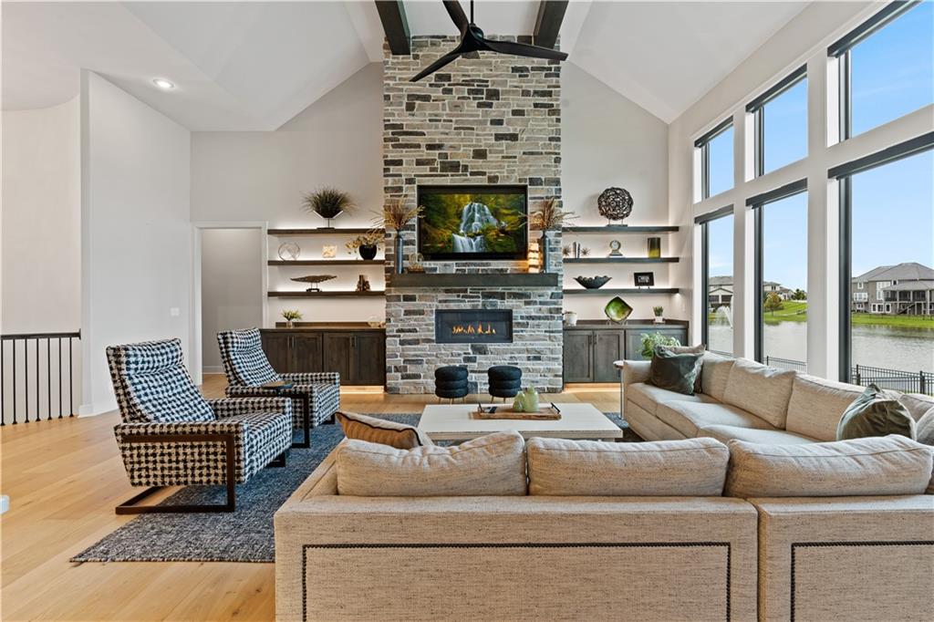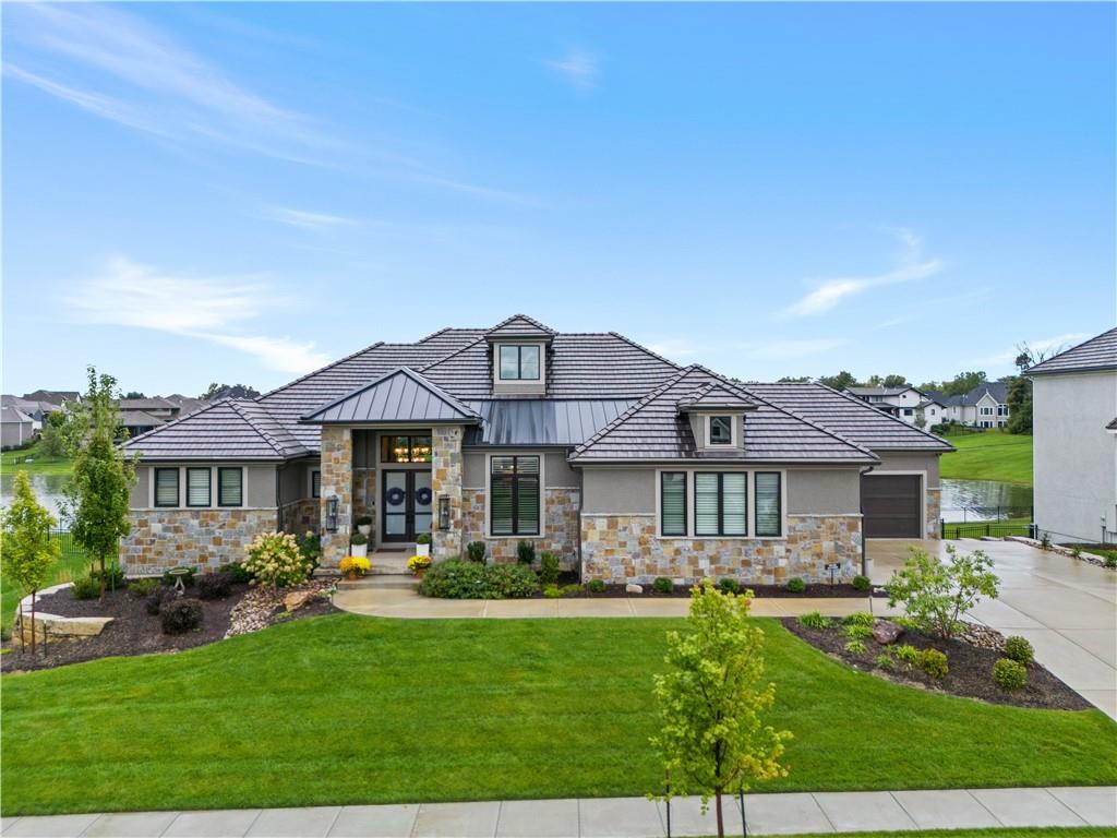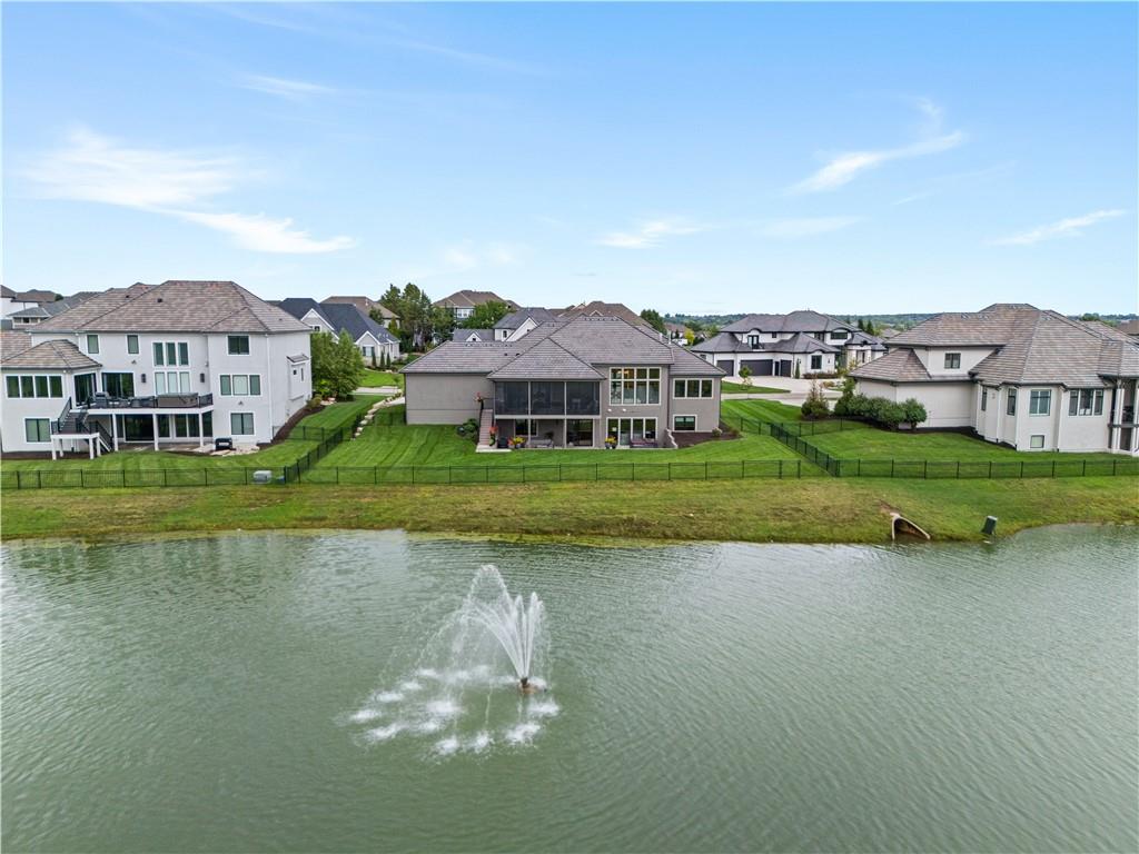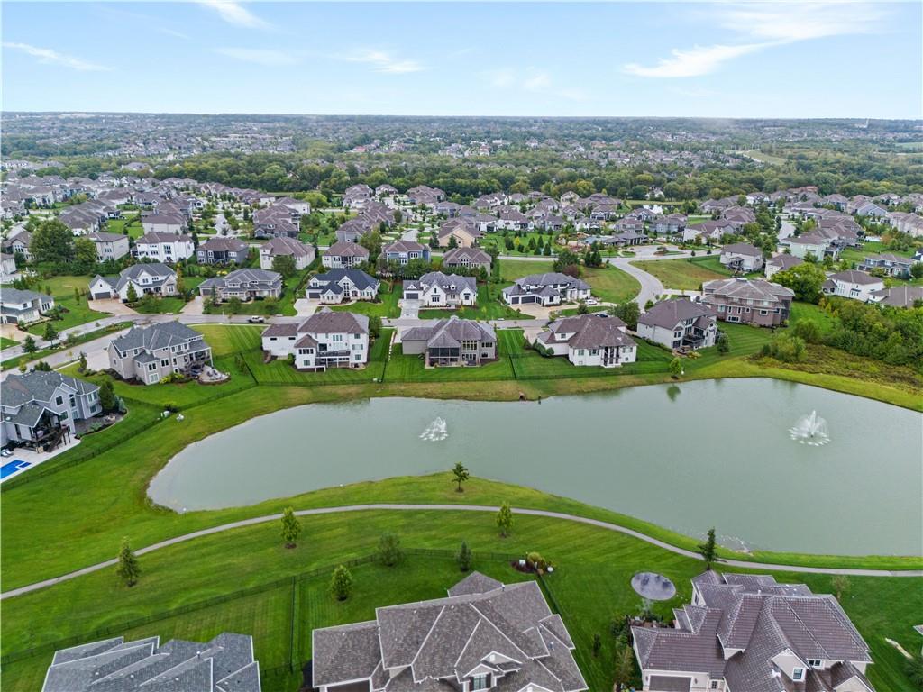 Poised within the prestigious Blue Valley School District, this award-winning Don Julian custom estate embodies the pinnacle of luxury living. Overlooking serene waters and dancing fountains, the residence offers a rare harmony of architectural excellence and natural beauty. The tranquil setting is best savored from the expansive main-level heated covered deck that connects the stunning four-seasons room. Every detail within reflects masterful craftsmanship and thoughtful design. With architectural LED lighting both interior and exterior, highlights the home's contemporary elegance. On the main level, the entrance meets you with glowing hardwoods that flow throughout both levels. The gourmet kitchen, appointed with Wolf appliances and luxurious finishes, anchors the open-concept living area—ideal for both intimate gatherings and grand entertaining. In the great room, remote-controlled window treatments reveal breathtaking lake views framed by cascading fountains.A graceful staircase leads to the lower level, designed as a private retreat and entertainment haven. Here, three ensuite bedrooms with walk-in closets complement an elegant wet bar, family recreation space, and a private music room—perfectly suited to transform into a wine cellar or recording studio. The suspended garage's unfinished space below offers endless possibilities like a home theater. Basement walkout access extends the living experience outdoors connecting to the patio and water views. Advanced home technology with a dedicated network hub with LUXUL gigabit switches, a PANAMAX MR4000 system, pre-wired for security system and in-ceiling Sonos speakers that encompasses the home in sound on both levels and the master bedroom.Enjoy year round energy efficiency with upgraded insulation and two laundry rooms for time efficiency. Blending timeless sophistication with modern innovation, this remarkable estate is more than a home—it is a statement of artistry and lifestyle in Terrybrook Farms.