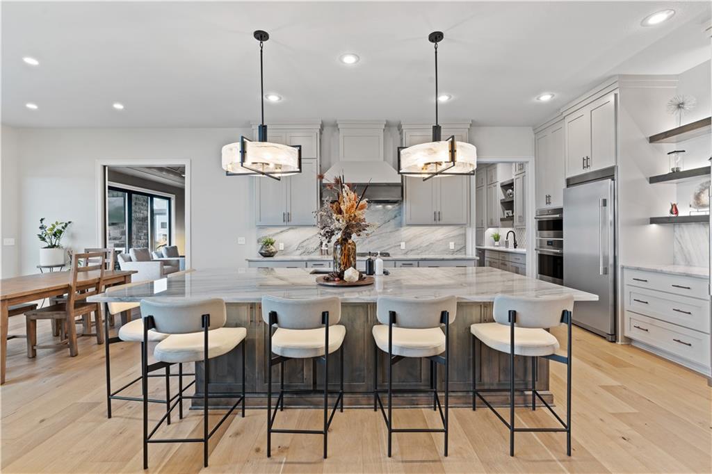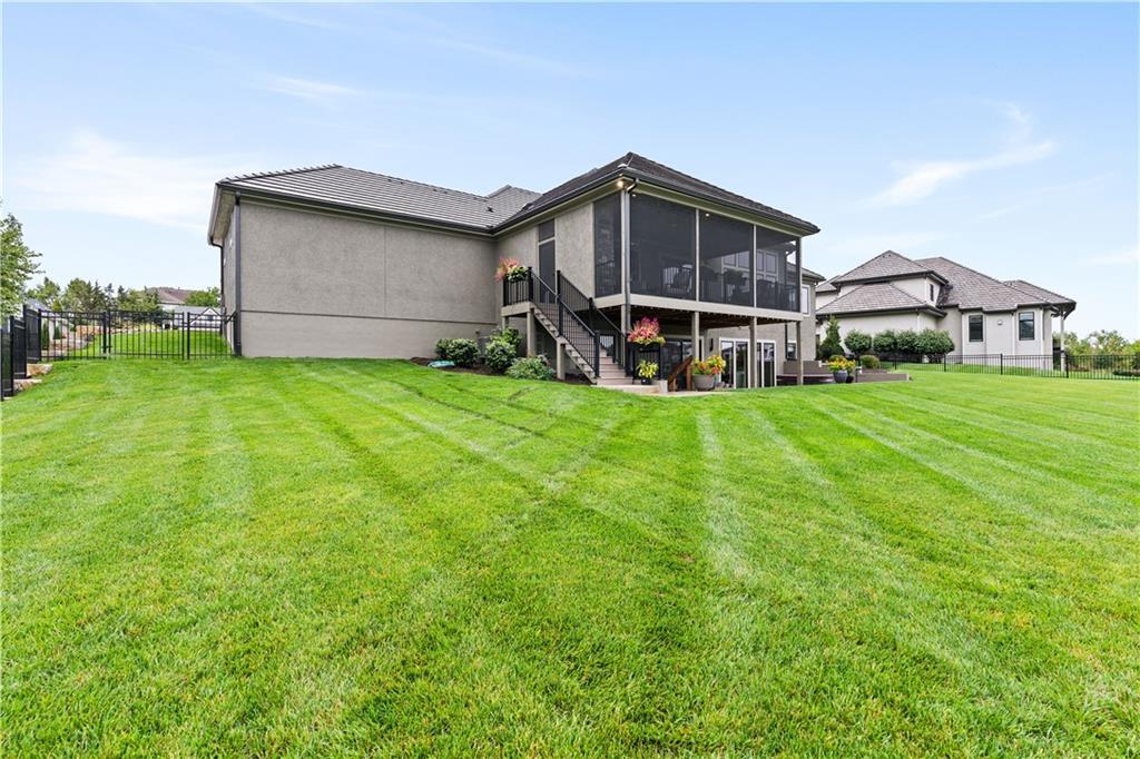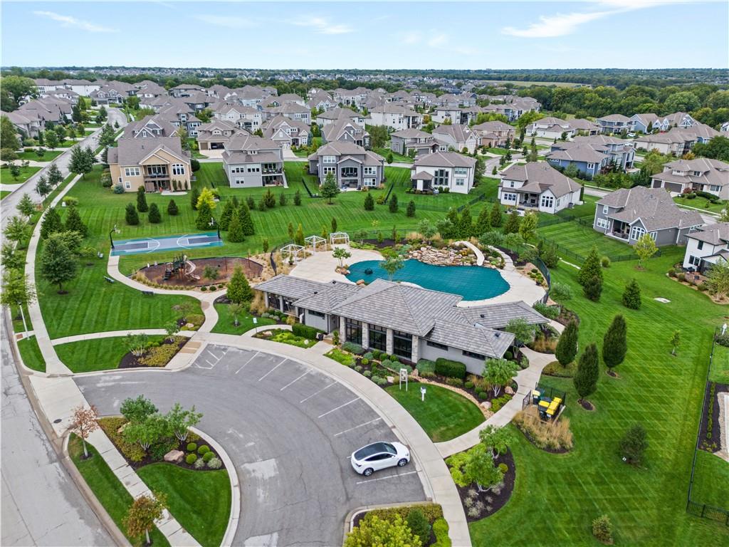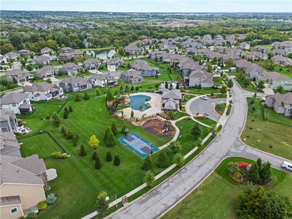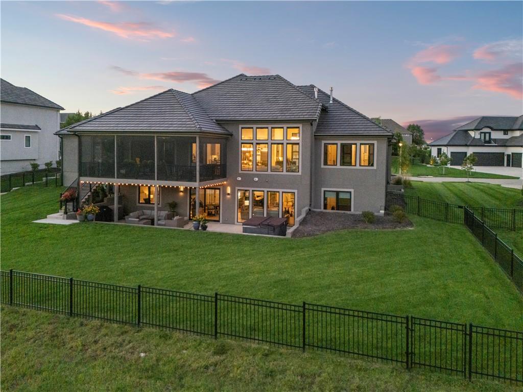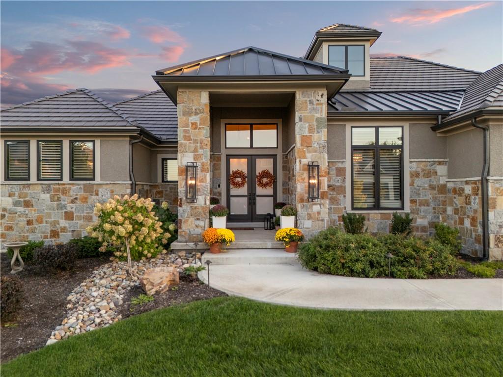 Poised within the prestigious Blue Valley School District, this award-winning Don Julian custom estate embodies the pinnacle of luxury living. Overlooking serene waters and dancing fountains, the residence offers a rare harmony of architectural excellence and natural beauty. The tranquil setting is best savored from the expansive main-level heated covered deck that connects the stunning four-seasons room. Every detail within reflects masterful craftsmanship and thoughtful design. With architectural LED lighting both interior and exterior, highlights the home's contemporary elegance. On the main level, the entrance meets you with glowing hardwoods that flow throughout both levels. The gourmet kitchen, appointed with Wolf appliances and luxurious finishes, anchors the open-concept living area—ideal for both intimate gatherings and grand entertaining. In the great room, remote-controlled window treatments reveal breathtaking lake views framed by cascading fountains.A graceful staircase leads to the lower level, designed as a private retreat and entertainment haven. Here, three ensuite bedrooms with walk-in closets complement an elegant wet bar, family recreation space, and a private music room—perfectly suited to transform into a wine cellar or recording studio. The suspended garage's unfinished space below offers endless possibilities like a home theater. Basement walkout access extends the living experience outdoors connecting to the patio and water views. Advanced home technology with a dedicated network hub with LUXUL gigabit switches, a PANAMAX MR4000 system, pre-wired for security system and in-ceiling Sonos speakers that encompasses the home in sound on both levels and the master bedroom.Enjoy year round energy efficiency with upgraded insulation and two laundry rooms for time efficiency. Blending timeless sophistication with modern innovation, this remarkable estate is more than a home—it is a statement of artistry and lifestyle in Terrybrook Farms.
