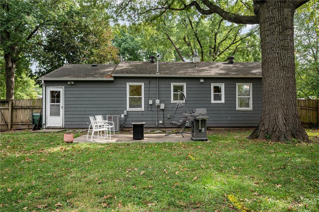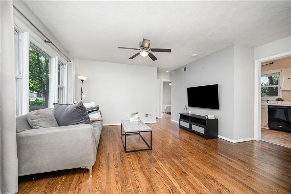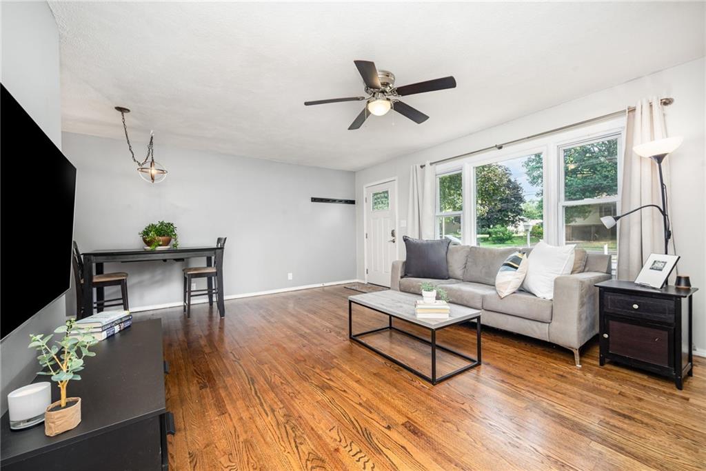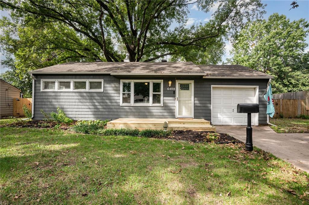 Welcome to this ranch-style home featuring a brand-new front porch and a spacious fenced lot. Inside, refinished hardwood floors flow through the living room and bedrooms. A foyer opens to the dining and living rooms for an easy, comfortable layout. The kitchen offers space for casual meals, and both bedrooms include ceiling fans and closet storage. The updated bathroom adds a fresh touch. Downstairs, the full basement provides plenty of additional storage with built-in shelving. Newer HVAC & water heater. Outside, the backyard is ideal for outdoor activities. Conveniently located near shopping, dining, and highways. This home blends comfort with everyday convenience. New in 2025 - Roof, Backyard storm-door, Halo Water Filtration. New in 2024 - HVAC & water heater.