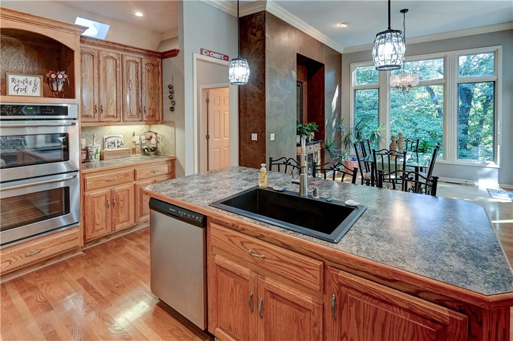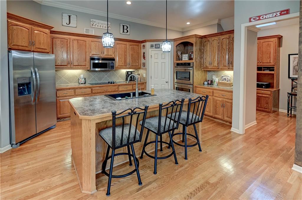 Welcome to 7835 N. Cosby Ave! Enjoy Main Level Living In this Stunning Reverse 1.5 Sty Home! 3 Bd-3 Full Bath-2 Half Bath-3-Car Garage Beauty! Step into seamless open concept living where living, kitchen & dining flow effortlessly together to create a spacious and inviting heart of the home. Wide entry to living room showcasing the gas fireplace, custom built-in bookshelves & crown molding. Big kitchen equipped with huge island, double oven, composite sink, loads of cabinets & walk-in pantry. All immersed in natural light. Relaxing very spacious primary bedroom leads to en suite bathroom & 11'x13' walk-in closet. Bathroom features double vanity, corner whirlpool tub, walk-in shower & tile flooring. Both levels of the home overlook the serene treed backyard and massive 15’x30’ deck-perfect for relaxing and entertaining. 3-Car garage enters to a drop zone and great office area featuring a built-in desk & custom cabinets. This leads to a laundry room & half bath. Walkout lower level boasts cozy welcoming open family room w/gas fireplace, custom bookshelves & wet bar w/mini fridge, custom cabinets, half bath & ample storage room. Also, 2 generous bedrooms each with its own en suite full bathroom & big walk-in closet. Enjoy Embassy Park amenities-swimming pool, tennis courts, play area & clubhouse. All this with a very sought after & convenient Platte County location and all that it offers. Top Rated Park Hill Schools. Zona Rosa shopping and restaurants nearby. Just 14 minutes from KCI Airport.