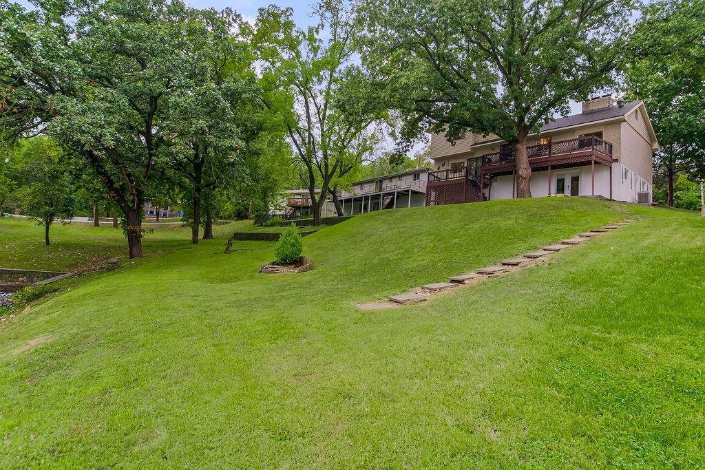 Welcome to your first Lake Waukomis home—where lake living and everyday comfort meet! This 3-bedroom, 2-bathroom home is filled with character and lake views. The double-door entry leads into a spacious living room featuring wood floors, vaulted ceilings with wood beams, a bay window, and a see-through fireplace connecting to the kitchen. The kitchen is equipped with stainless steel appliances, a pantry, and a lake view from the sink, plus walkout access to a double deck that spans the length of the home—perfect for entertaining or simply enjoying the peaceful water. A main-floor laundry room, full bath, and office area add convenience and flexibility. Upstairs, you’ll find three bedrooms with wood floors and a full bath with double vanity. The finished walk-out basement offers a cozy fireplace, a huge workshop, and direct access to a covered patio. From here, steps lead down through a shady backyard to your private dock. Experience the charm of Lake Waukomis living with fishing, boating, and community events right at your doorstep!