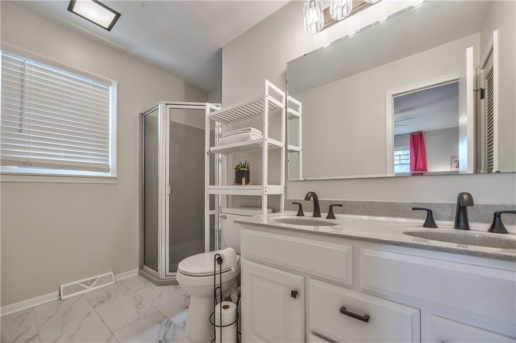 Stunning remodeled 1.5 story home featuring 4 bedrooms, 4 full bathrooms and a finished, walkout lower level. This charming home is situated on a half acre corner lot, near the Blue Hills Country Club and close to all of the best Leawood shopping and restaurants. Bright & open completely remodeled kitchen featuring quartz countertops, composite under mount sink, an abundance of new cabinetry - including pantry cabinets, soft close drawers/doors, stainless steel appliances and tiled floor. The gorgeous kitchen is adjacent to the cozy family room featuring a fireplace and steps out to the large deck and fantastic backyard...perfect for entertaining. Beautiful, refinished hardwood floors in the spacious formal living room, formal dining room, family room & main level bedrooms. This home features 2 primary suites - one on the main level and one on the second level. Both feature private, en-suite bathrooms with double vanities and showers. The second level primary bedroom features double walk-in closets. Huge, finished, walk-out lower level rec room with so many possibilities + additional full bathroom. All bathrooms completely updated with newer cabinetry, quartz countertops and modern tile. The bonus, attached greenhouse and adjacent garden area are waiting for your creativity and ideas. This space would be perfect for keeping plants green all year around. Newer roof and HWH's. This home is the perfect blend of modern living, finishes and comfort!