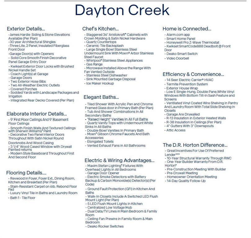 Experience modern elegance in Dayton Creek with this large corner lot, D.R. Horton home. This home is equipped with a 3-car garage, James Hardie® siding with stone accents, 9’ ceilings, and RevWood flooring throughout the main living areas. The chef’s kitchen features quartz countertops, tile backsplash, and Whirlpool® stainless steel appliances. Retreat to a luxurious primary suite with tiled shower and double quartz vanity. Cutting-edge Smart Home technology makes daily living effortless. Energy-efficient systems, garage door openers and a covered porch with landscaped yard make this home the perfect blend of comfort, technology, and style. Community amenities include playground, fitness center, pool, splash pad, pickleball court, basketball court, putting green, and walking trails. With D.R. Horton, you get a home warranty, the most recent building codes, more energy efficiency and lower maintenance. Don’t forget to ask about current incentives! Photos, renderings, and 3D Walkthrough's maybe of a different home but on the same floor plan to show finish quality only.** Don’t miss your chance—schedule a tour today and see why this home is the perfect mix of luxury and convenience!