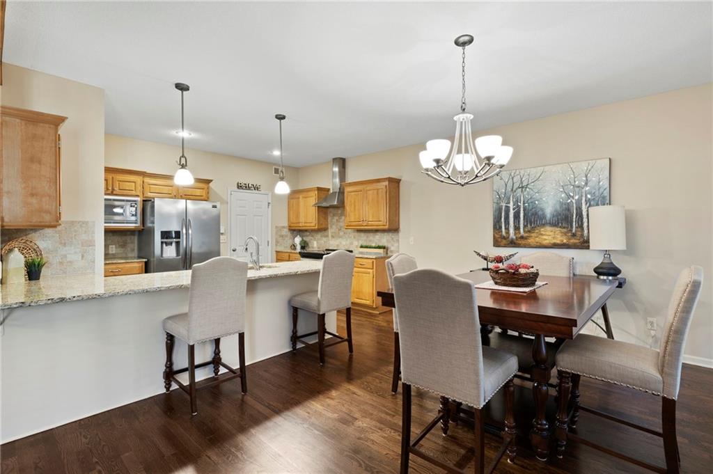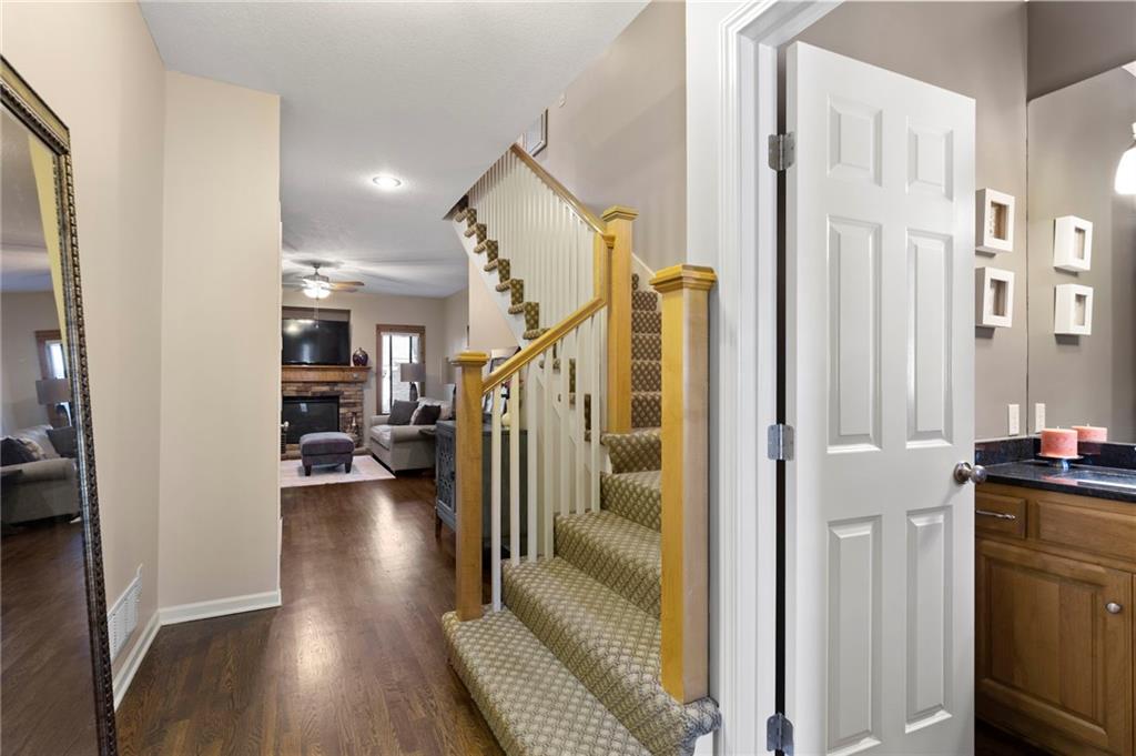 Maintenance provided living at its best in this stunning Tom French–designed Winston plan townhome, perfectly located in the highly sought-after Villages of Quail Park. This gorgeous neighborhood is known for its lush, manicured landscaping and inviting curb appeal, and this home is tucked onto a quiet cul-de-sac with a shared driveway, creating both privacy and charm. The ledge stone and stucco exterior welcome you to a covered front porch and storm door entry. Inside, gleaming hardwood floors set the tone, flowing past a stately half bath with granite vanity and into the spacious great room. Centered by a stone fireplace flanked by large windows, the great room creates a warm and inviting space that seamlessly connects to the breakfast area. From here, step through French doors to the screened-in deck with access to a flagstone patio and small yard—an ideal spot for morning coffee or evening relaxation. The kitchen offers a granite breakfast peninsula, stainless steel appliances, and two access points to the laundry room, one leading directly to from the kitchen and the other from the main entry hallway. Upstairs, a versatile loft/office area provides additional living space, perfect for working from home or relaxing with a book. The owner’s suite is a true retreat with plush carpet, ceiling fan, and French doors that open to a spa-like en suite bath featuring a jetted tub with tile surround, separate shower with ledge, double granite vanity, and large walk-in closet. Two additional bedrooms, each with ceiling fans, blinds, and soft carpet, share a hall bath with tile flooring, an extended granite vanity, and shower. The daylight, unfinished lower level is stubbed for a bath and offers excellent storage now with the opportunity to expand living space in the future. Blue Valley Schools add to the value of this thoughtfully designed home in a community where comfort, convenience, and timeless style come together.