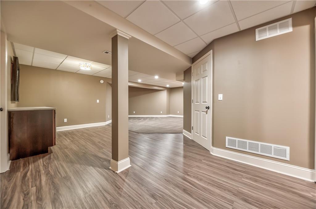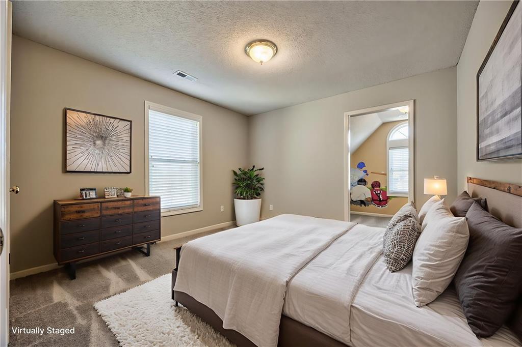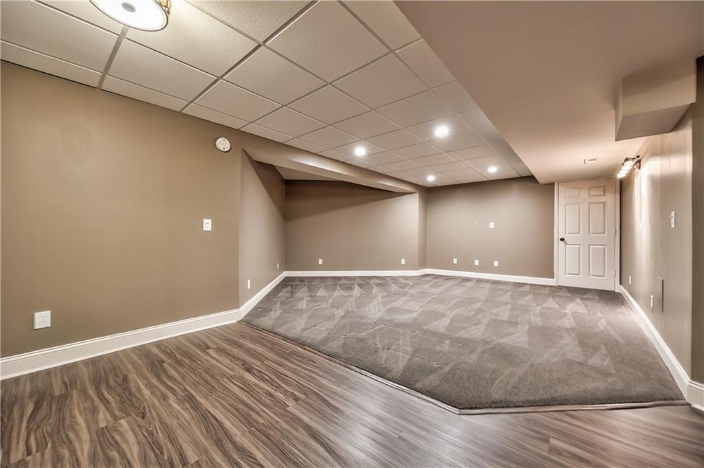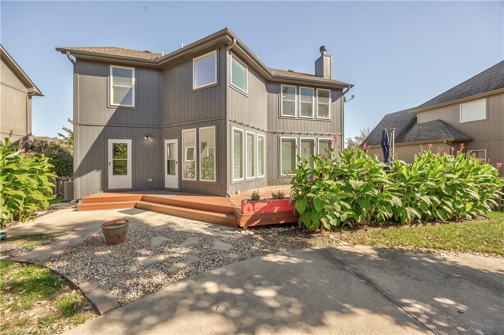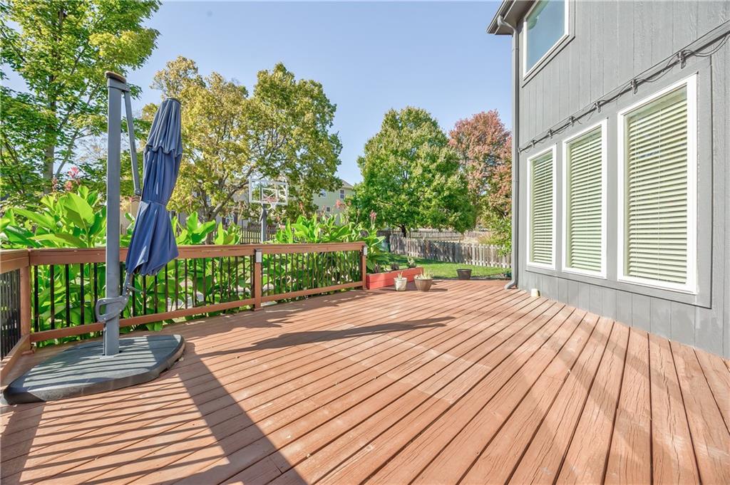 Beautiful 2-story home on a cul-de-sac in Olathe! Step inside to find a flexible front room, perfect as a formal dining space or a home office. Brand new carpet and fresh interior paint throughout! The inviting great room features a cozy gas fireplace with elegant, fluted trim and mantle. The eat-in kitchen offers hardwood floors, a large island, granite countertops, subway tile backsplash, stainless steel appliances, a pantry, and a spacious breakfast area that easily fits a full-size dining table. Upstairs, the spacious primary suite impresses with a vaulted ceiling, soaker tub, separate shower, dual vanities, and walk-in closet. Additionally, the secondary bedrooms are generously sized and there is a second full bath. The finished lower level is made for entertaining with a large rec room, sleek bar featuring quartz countertops, a beverage fridge plus a convenient half bath. Unfinished space offers plenty of room for storage. Additional main-floor perks include a half bath and a laundry/mudroom with exterior access to the backyard. Recent updates include comfort-height toilets, kitchen backsplash, primary shower tile, and a fully finished basement. Enjoy outdoor living on the expansive deck with private basketball court and landscaped, treed yard. The two-car garage features built-in shelving and a workbench. Radon mitigation system in place.