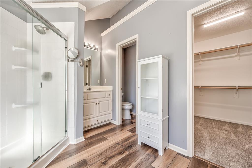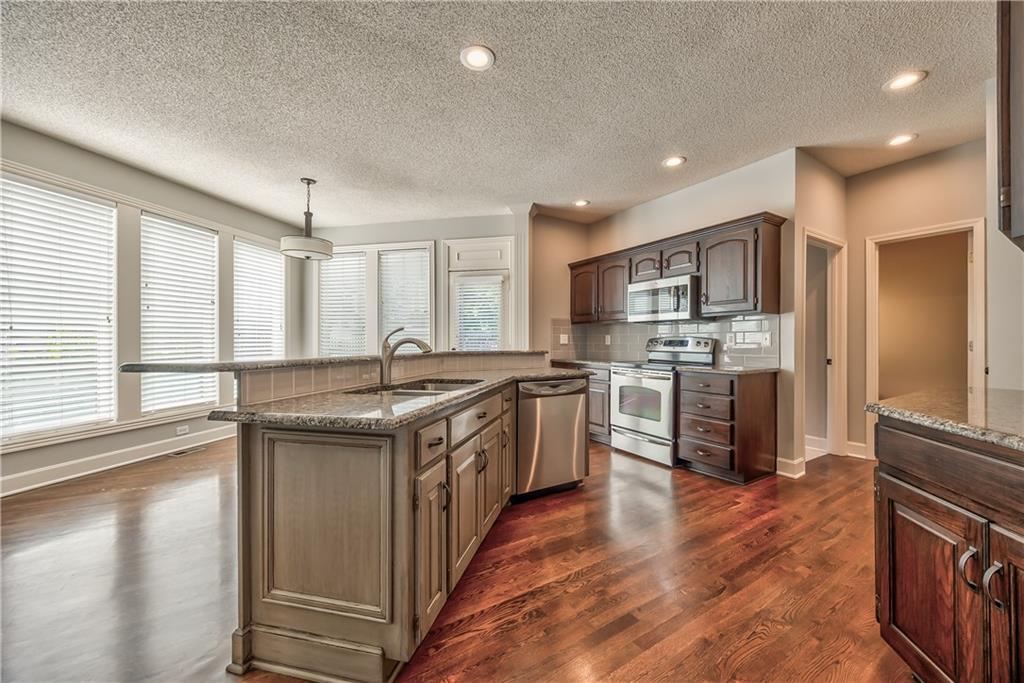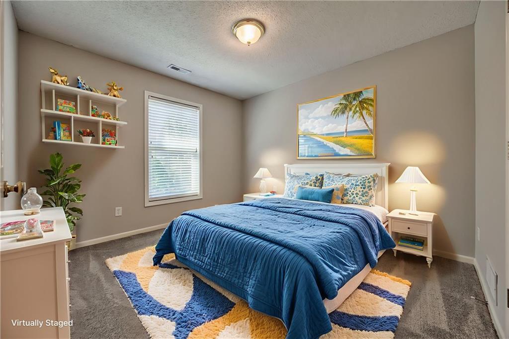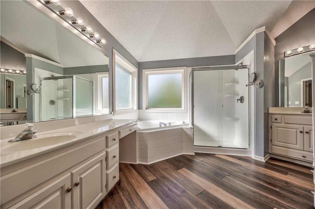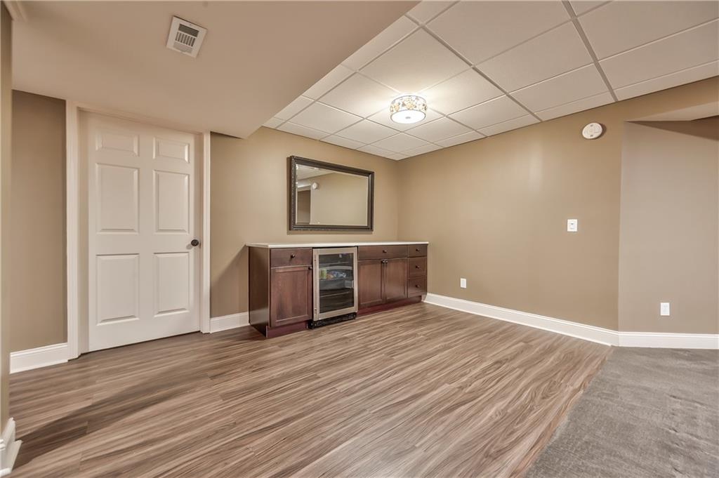 Beautiful 2-story home on a cul-de-sac in Olathe! Step inside to find a flexible front room, perfect as a formal dining space or a home office. Brand new carpet and fresh interior paint throughout! The inviting great room features a cozy gas fireplace with elegant, fluted trim and mantle. The eat-in kitchen offers hardwood floors, a large island, granite countertops, subway tile backsplash, stainless steel appliances, a pantry, and a spacious breakfast area that easily fits a full-size dining table. Upstairs, the spacious primary suite impresses with a vaulted ceiling, soaker tub, separate shower, dual vanities, and walk-in closet. Additionally, the secondary bedrooms are generously sized and there is a second full bath. The finished lower level is made for entertaining with a large rec room, sleek bar featuring quartz countertops, a beverage fridge plus a convenient half bath. Unfinished space offers plenty of room for storage. Additional main-floor perks include a half bath and a laundry/mudroom with exterior access to the backyard. Recent updates include comfort-height toilets, kitchen backsplash, primary shower tile, and a fully finished basement. Enjoy outdoor living on the expansive deck with private basketball court and landscaped, treed yard. The two-car garage features built-in shelving and a workbench. Radon mitigation system in place.