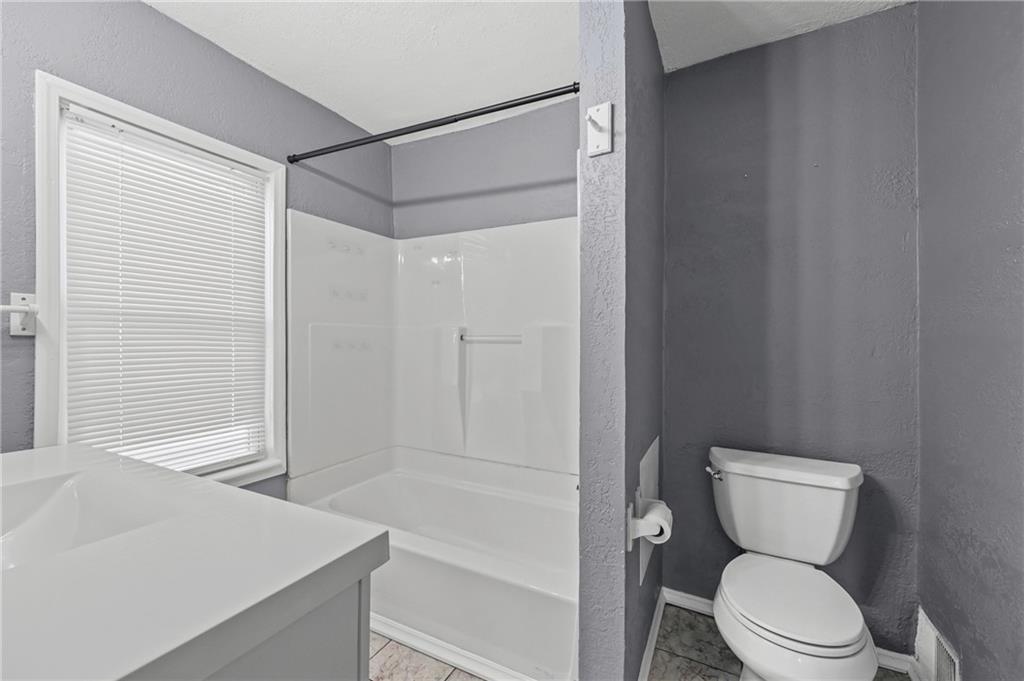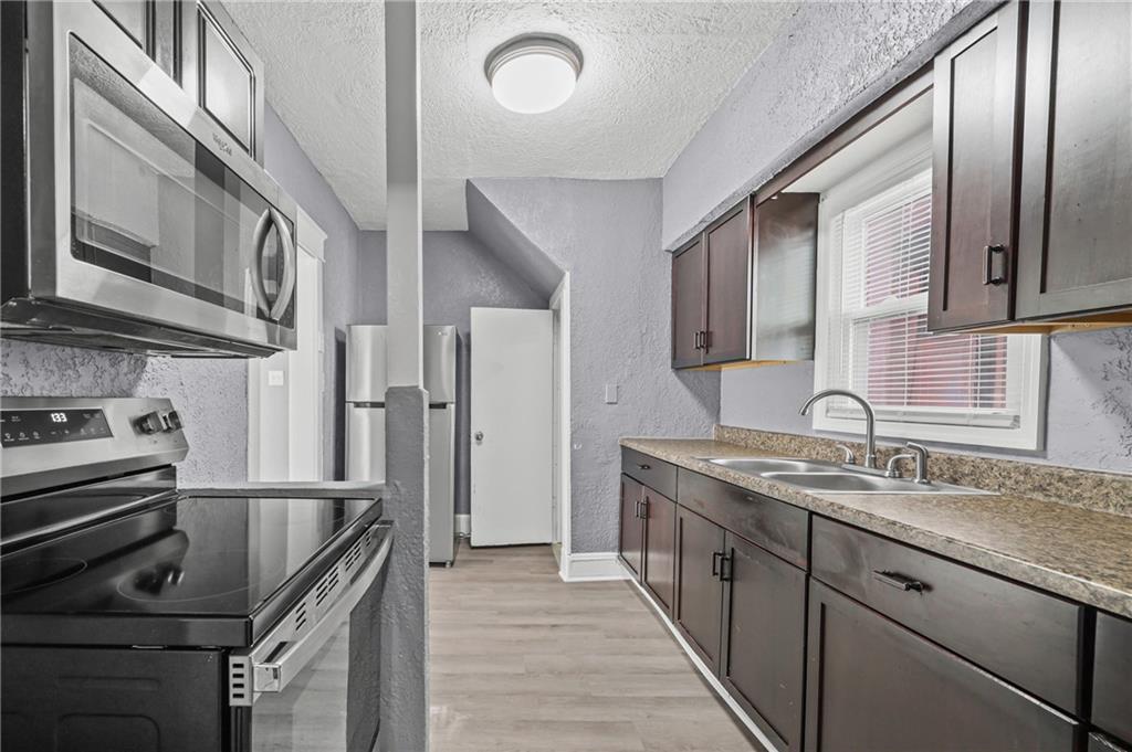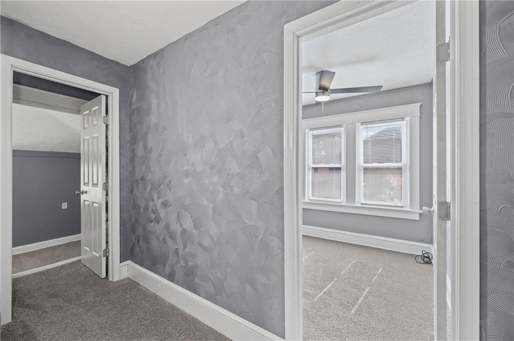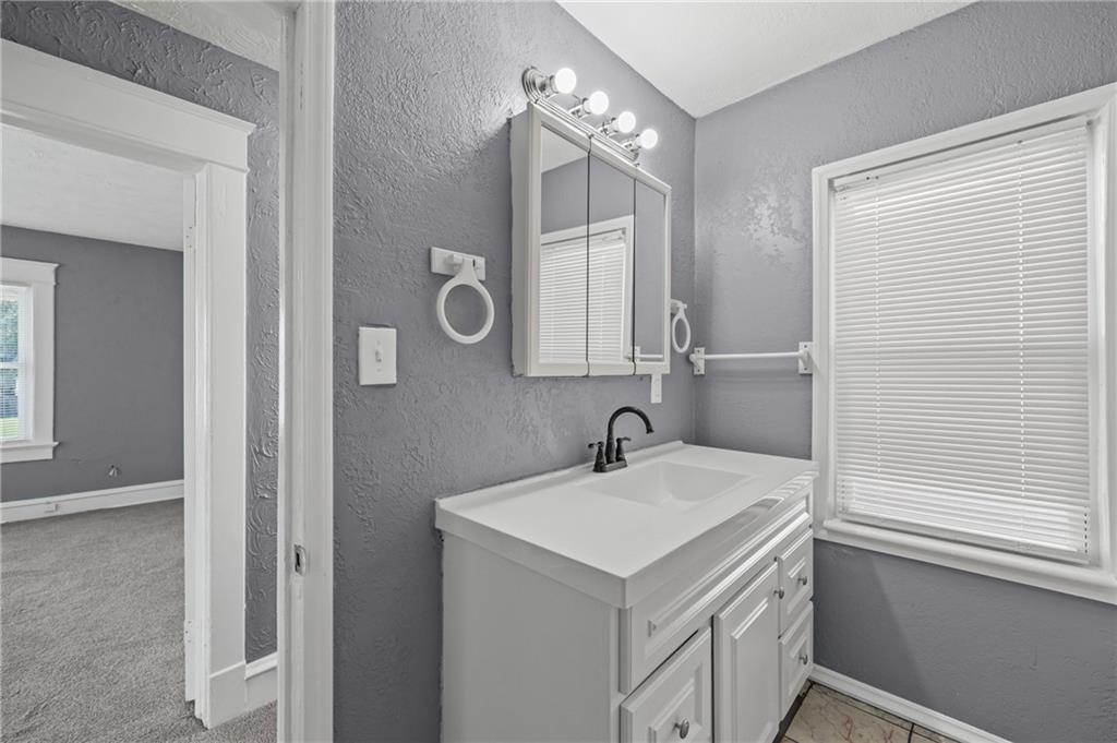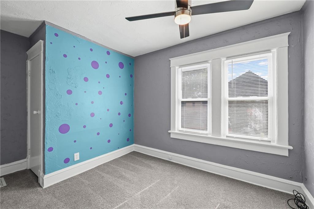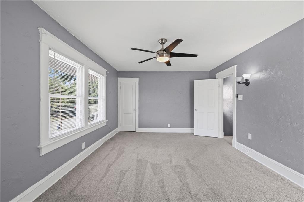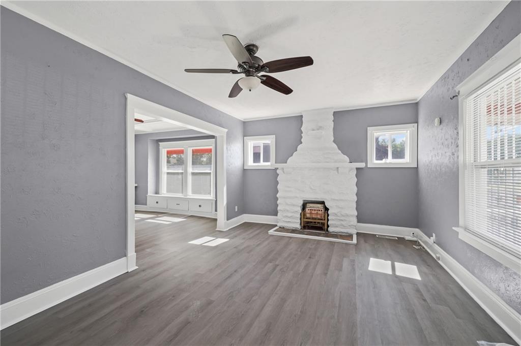 Discover the perfect blend of classic charm and modern convenience in this delightful 2-story home, located at 3427 Agnes Avenue in Kansas City. This property offers a welcoming atmosphere with its vibrant red exterior, complemented by a covered front porch featuring distinctive stone pillars. The home provides ample space for both relaxation and entertainment, with a functional and inviting layout. Upon entering, you are greeted by a spacious open-concept living and dining area, distinguished by elegant coffered ceilings and a decorative painted brick fireplace that serves as a beautiful focal point. The interior is freshly painted in a neutral gray with crisp white trim, creating a bright and airy feel throughout. Large windows allow for an abundance of natural light, enhancing the sense of space. The main living areas feature attractive and durable laminate flooring, providing a seamless flow from room to room. Thoughtful built-in cabinetry and a cozy window seat add to the home's character and provide practical storage solutions. The galley-style kitchen is well-equipped with dark wood cabinetry, offering plenty of storage, and is paired with stylish granite-look countertops. The kitchen comes complete with a refrigerator, stove, and microwave, making it ready for all your culinary endeavors. A convenient pantry provides additional storage space for your kitchen essentials. This home includes multiple comfortable bedrooms, each featuring ceiling fans and ample natural light. The updated bathroom is clean and modern, with a white tub and shower combination and contemporary fixtures. For outdoor enjoyment, a wooden deck at the rear of the house provides a private space for grilling and relaxing. The fenced backyard also includes two sheds for extra storage. With its combination of traditional architectural details and recent updates, this home is move-in ready and waiting for you to make it your own.