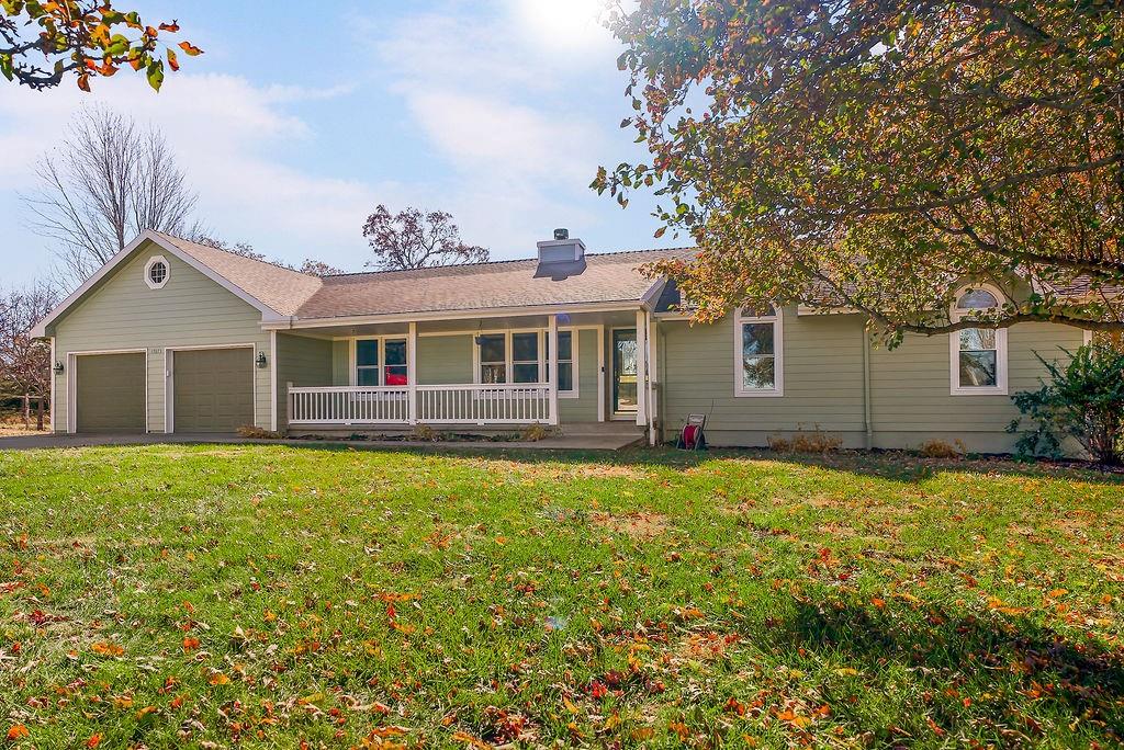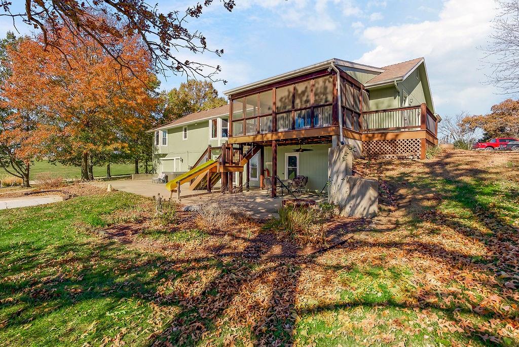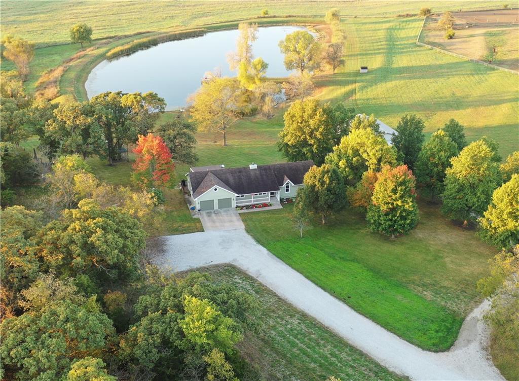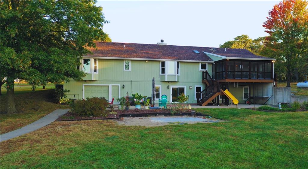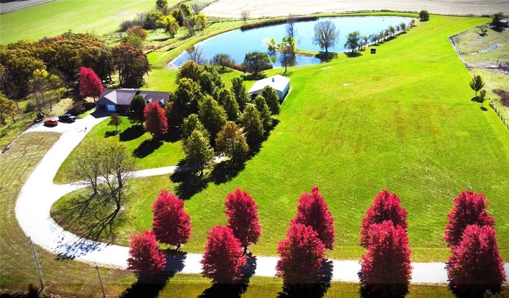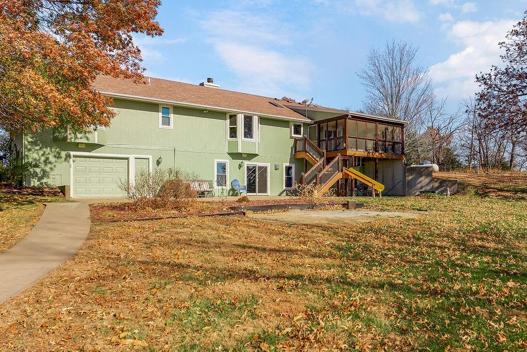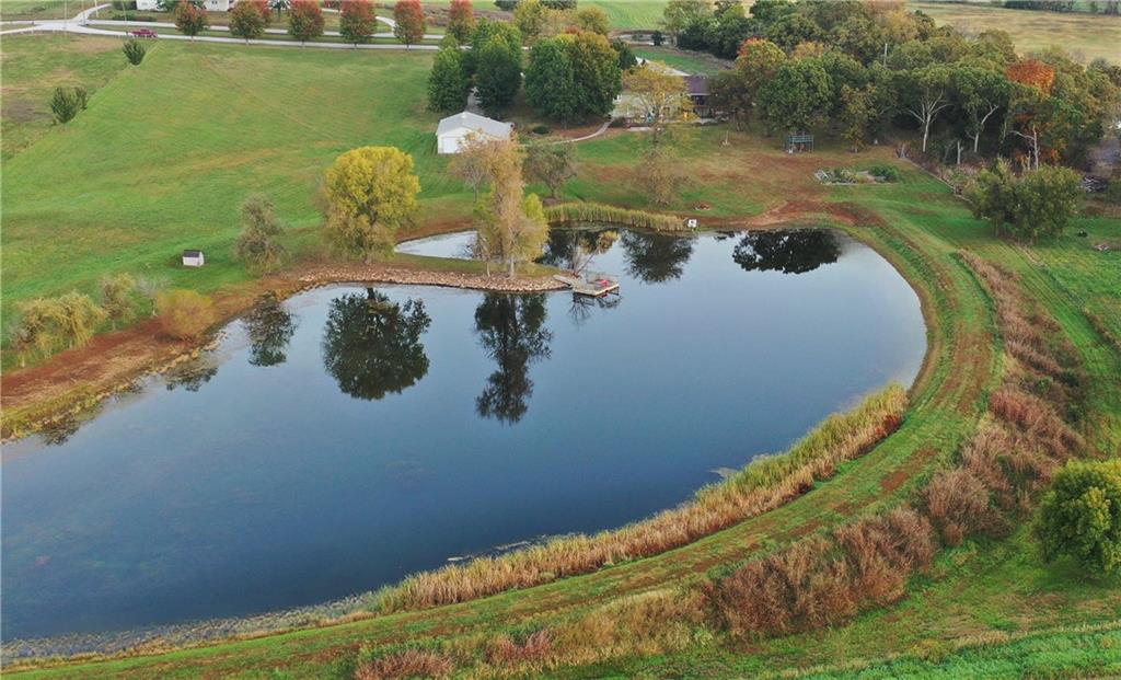 From the moment you turn onto the red maple lined drive, you're welcomed by a canopy of seasonal color that sets the tone for this tranquil country property. Nestled on 14.4 groomed acres, this 4-bedroom reverse ranch offers the space and setting to bring your rural lifestyle dreams to life—whether you're hosting extended family, entertaining the neighborhood, or exploring the possibilities of a hobby farm. The home has been thoughtfully updated with new exterior paint, exterior doors, updated flooring and carpet, lifetime warranty windows, and a remodeled kitchen featuring upscaled granite countertops. The elevated screened porch is a favorite spot to start or end your day—sip your morning coffee as the sun dances across the backyard pond or gather for evening chats enjoying the country air. Downstairs, the walk-out basement offers flexible space for entertaining, with an overhead door opening to a massive patio—ideal for hosting outdoor parties or family celebrations. A built-in slide adds fun for the kids, while adults can unwind in the hot tub or float in the seasonal above-ground pool. Whether you're casting a line in the stocked pond, watching wildlife, or teaching the next generation to fish, the pond is definitely a year-round source of fun & relaxation. Off the southwest corner of the home, the 30' x 50' insulated shop with pull-through overhead doors and a 12' x 50' lean-to that offers endless possibilities. Use it for equipment storage, a workshop, or convert it into a studio or gym. With power, insulation, and easy access, it’s ready to support all your hobbies, business ventures, or weekend projects. Located just minutes from Paola and with easy access to Kansas City, this property offers the peace of country living without sacrificing convenience. This is truly a place built for memory-making—and it's ready for the next chapter!
