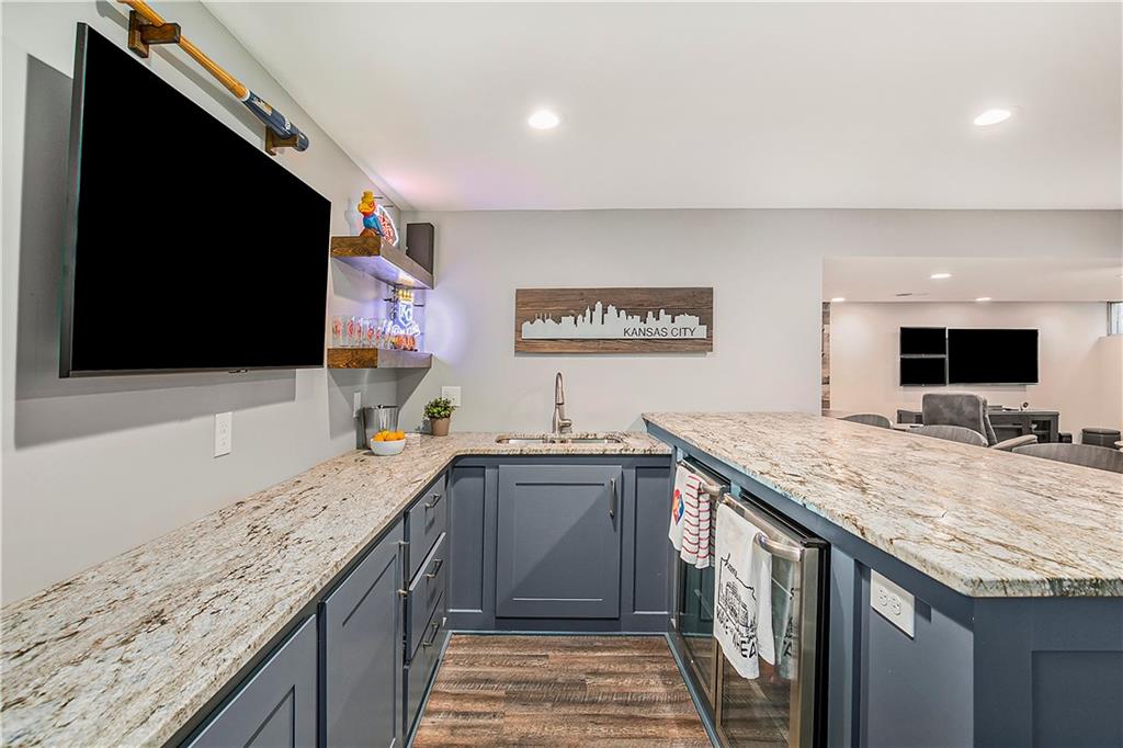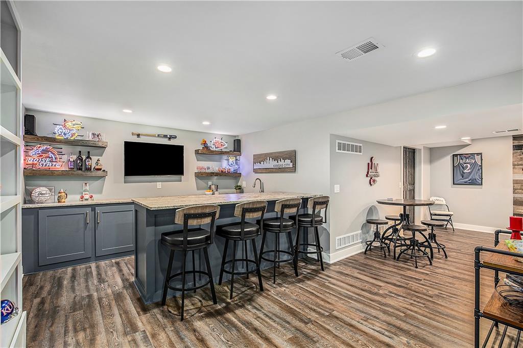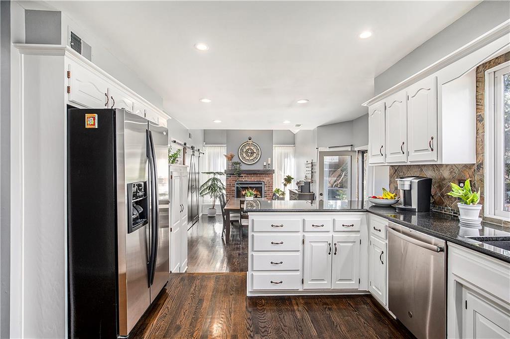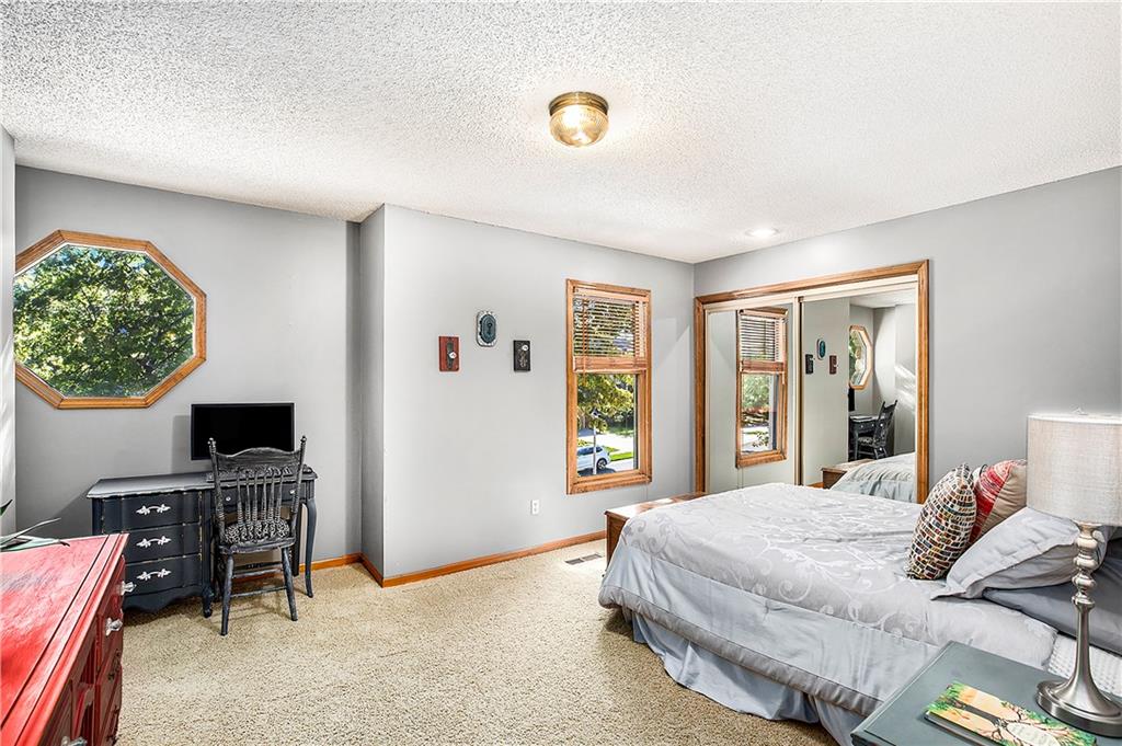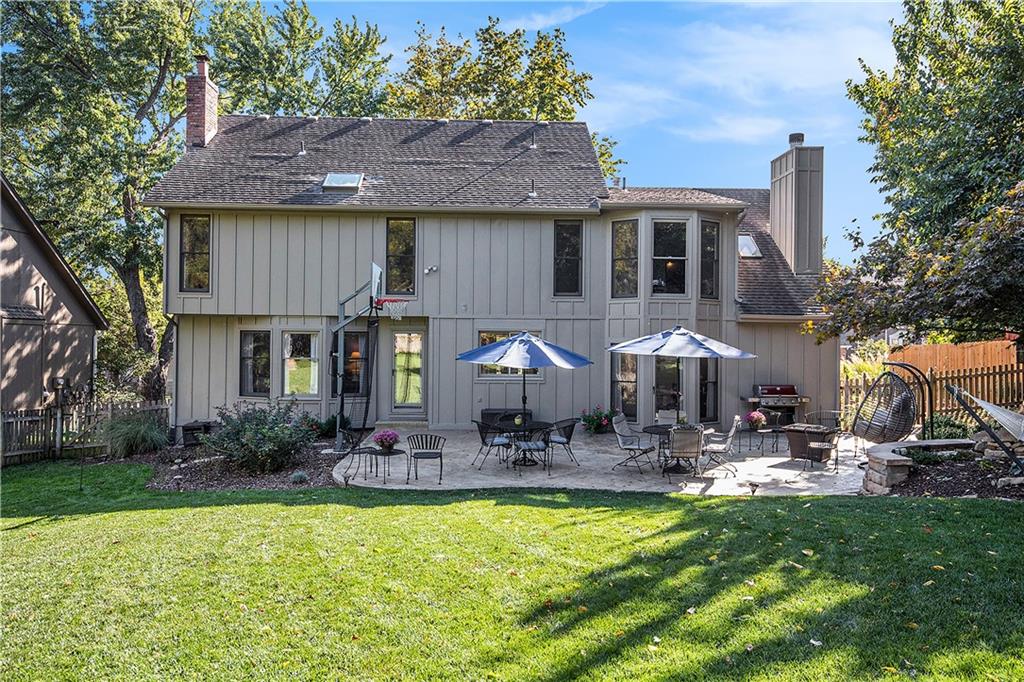 Celebrate the Holidays in Oak Tree Meadows Move in before the end of the year and enjoy the seasons ahead in this beautifully-updated home on a stunning park-like lot. This 4-bedroom, 2 1/2 -bath home in the desirable Oak Tree Meadows community of Overland Park offers the perfect blend of comfort, charm, and thoughtful design. Pride of ownership shines throughout with consistent updates including an updated roof, fresh exterior paint, and an updated kitchen that opens to the hearth room, dining room, and living room—all overlooking a spectacular backyard. The kitchen features painted cabinetry, granite counters, stainless steel appliances, and an eat-in hearth area accented by a brick fireplace and a clever barn-door drop zone for everyday organization. The living room boasts a stone fireplace framed by built-ins and rich hardwood floors that bring warmth and character to the main level. Step outside to your own private oasis—a lush, level .39-acre treed lot with a stamped concrete patio, tranquil water feature, and ample space for entertaining or quiet evenings under the trees. Upstairs, the spacious primary suite includes a sitting area, updated ensuite bath with granite double vanity, walk-in shower, jacuzzi tub, and generous walk-in closet. Secondary bedrooms are equally spacious and share a hall bath with painted vanity and skylight. The finished lower level is designed for fun and function—featuring a family room, wet bar, exercise space, and a stylish barn door accent. Nestled in a quiet, established neighborhood with access to Stoll Park, a private neighborhood lake, and just minutes from shopping, dining, and major highways (I-35, 435, and 69)—this home perfectly balances comfort, convenience, and community.