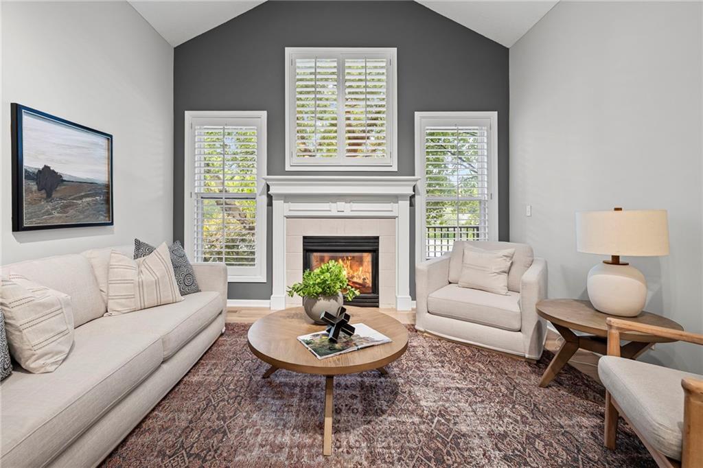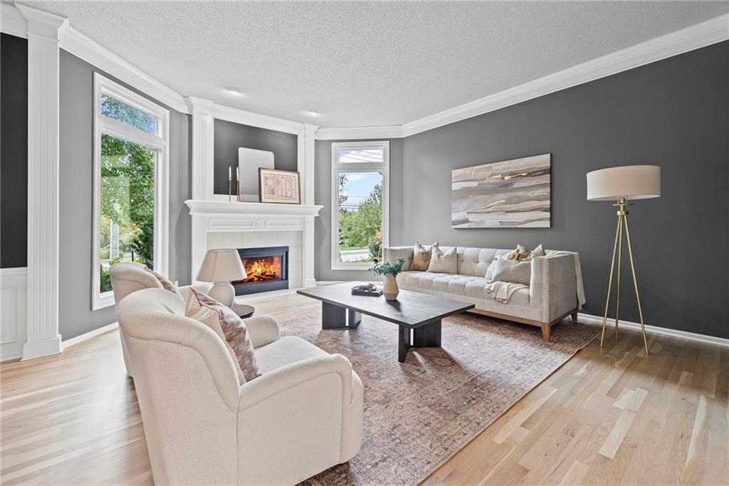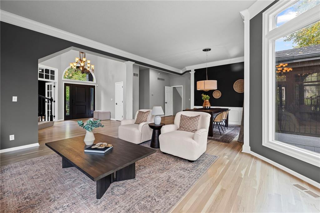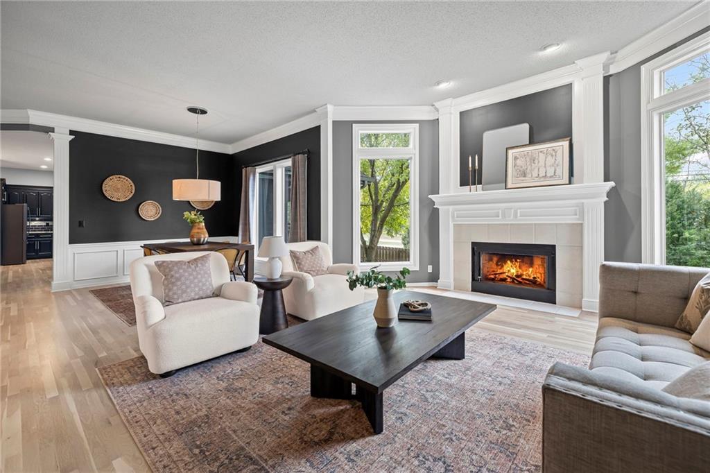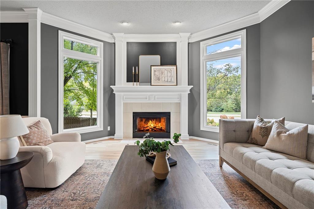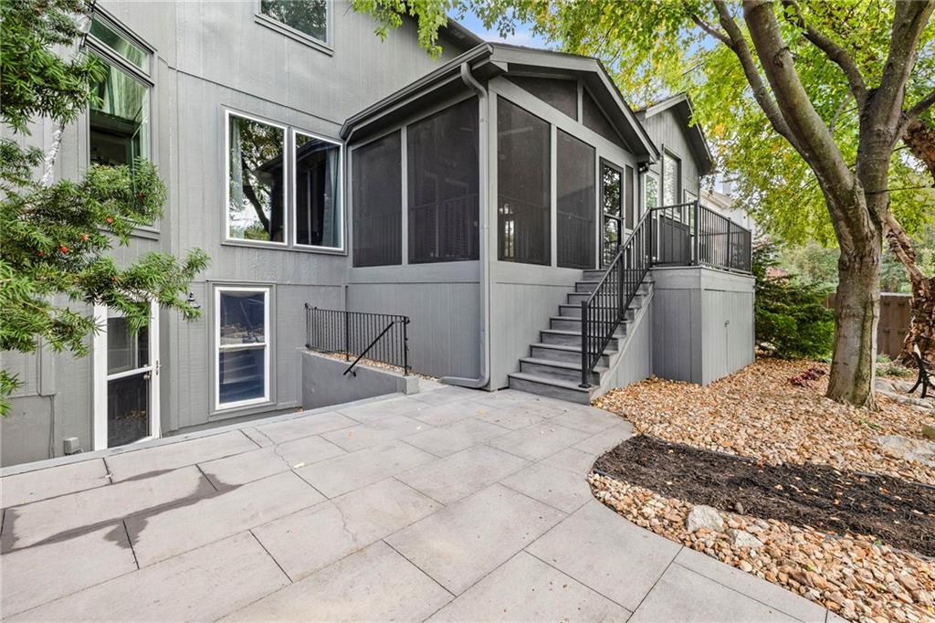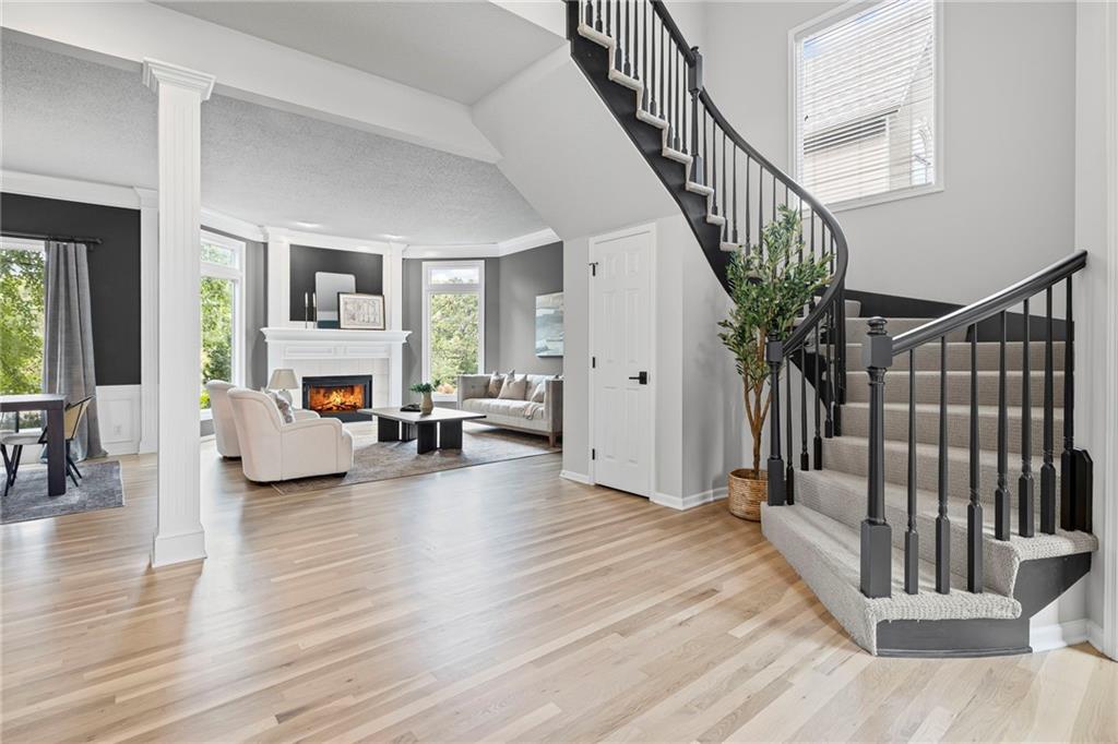 Welcome to this stylish, move-in ready 2-story home nestled in the heart of Overland Park. This generous residence offers 4 bedrooms, 3 full baths, and 2 half baths, ensuring plenty of space for comfortable living. As you enter, a vaulted entryway with a striking curved staircase captures your attention, enhanced by newly refinished hardwood floors. The freshly painted walls and trim, paired with elegant plantation shutters, create a pristine, inviting atmosphere. This home boasts an open floor plan designed for modern living and entertaining. Expansive living and dining areas welcome you with an abundance of natural light. The main level includes a dedicated home office along with a half bath. At the heart of the home, the eat-in kitchen stands as a true centerpiece, featuring a large island with ample bar seating. Adjacent to the kitchen, a cozy hearth room with a fireplace provides a warm and inviting retreat, perfect for relaxation. The spacious primary suite offers a beautifully updated bath, complete with heated floors, including the shower, for a spa-like retreat. It also features a custom closet and a cozy fireplace. Upstairs, you will find three additional large bedrooms, one with its own private bath and the other two sharing a convenient Jack and Jill bath. The second-floor laundry room adds to the home's functionality and convenience. The finished walk-out basement includes a large recreation room with a wet bar and a custom cherry wood bar top with 2 beverage refrigerators. A 5th non-conforming bedroom or office, plus ample unfinished storage, makes the lower level versatile and functional. The screened-in porch is an outdoor living haven complete with a heater and a ceiling fan. The beautifully landscaped, fully fenced backyard features a large patio for a second outdoor living area. Don't miss your opportunity to own this exquisite home in a sought-after location.