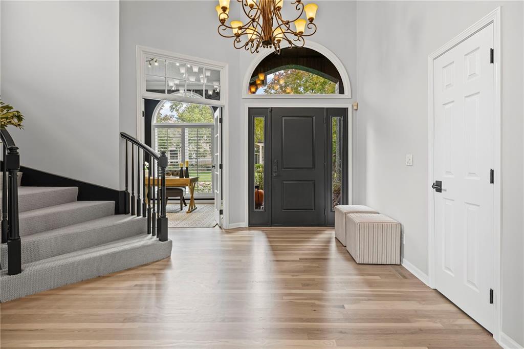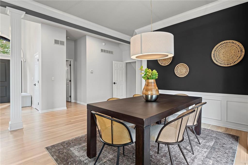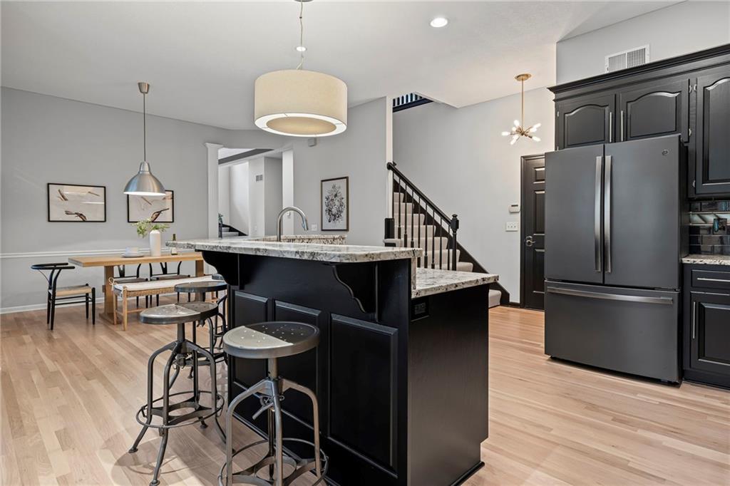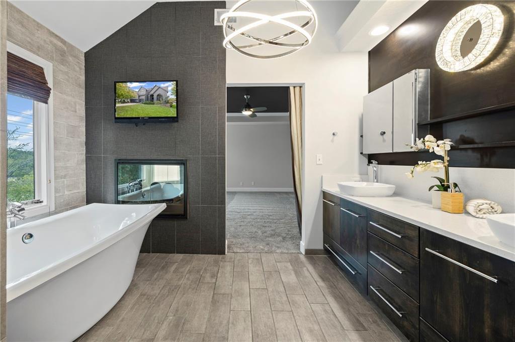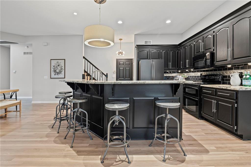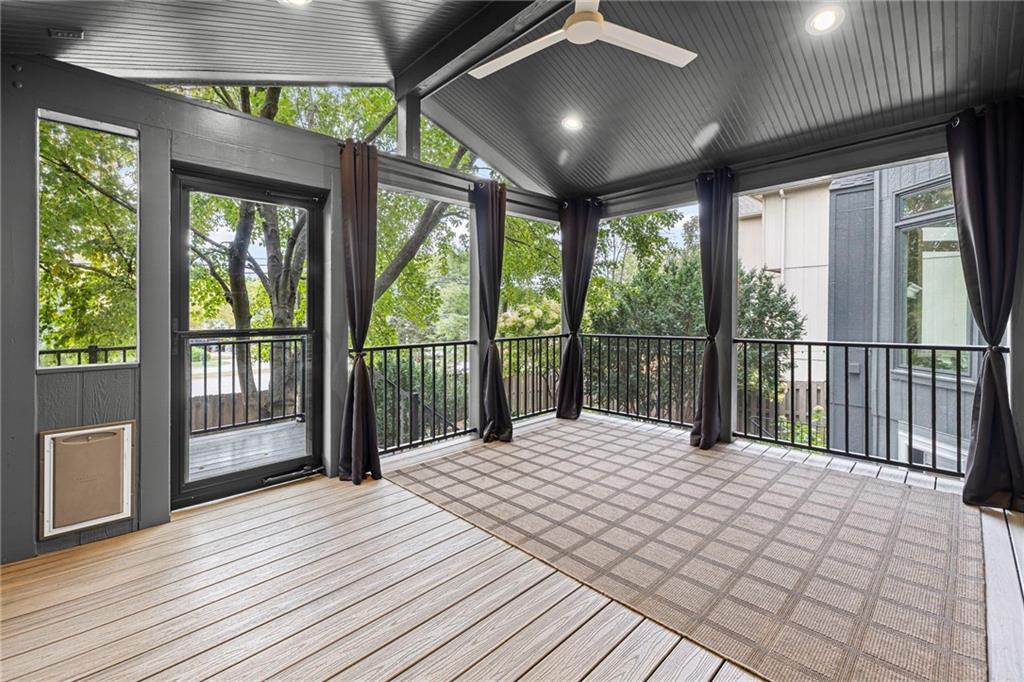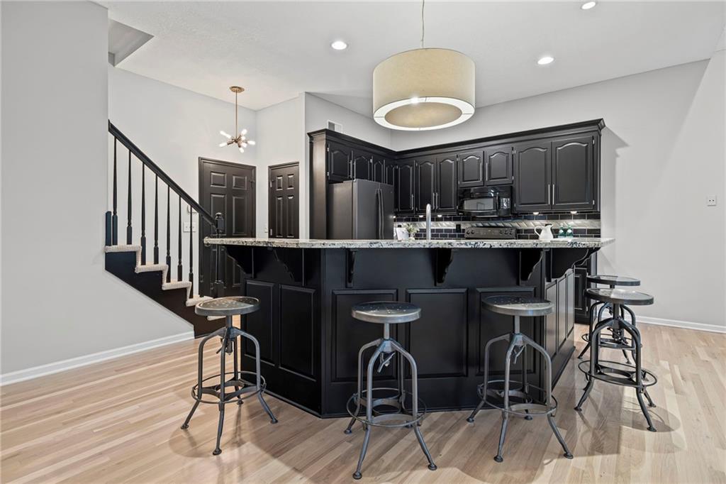 Welcome to this stylish, move-in ready 2-story home nestled in the heart of Overland Park. This generous residence offers 4 bedrooms, 3 full baths, and 2 half baths, ensuring plenty of space for comfortable living. As you enter, a vaulted entryway with a striking curved staircase captures your attention, enhanced by newly refinished hardwood floors. The freshly painted walls and trim, paired with elegant plantation shutters, create a pristine, inviting atmosphere. This home boasts an open floor plan designed for modern living and entertaining. Expansive living and dining areas welcome you with an abundance of natural light. The main level includes a dedicated home office along with a half bath. At the heart of the home, the eat-in kitchen stands as a true centerpiece, featuring a large island with ample bar seating. Adjacent to the kitchen, a cozy hearth room with a fireplace provides a warm and inviting retreat, perfect for relaxation. The spacious primary suite offers a beautifully updated bath, complete with heated floors, including the shower, for a spa-like retreat. It also features a custom closet and a cozy fireplace. Upstairs, you will find three additional large bedrooms, one with its own private bath and the other two sharing a convenient Jack and Jill bath. The second-floor laundry room adds to the home's functionality and convenience. The finished walk-out basement includes a large recreation room with a wet bar and a custom cherry wood bar top with 2 beverage refrigerators. A 5th non-conforming bedroom or office, plus ample unfinished storage, makes the lower level versatile and functional. The screened-in porch is an outdoor living haven complete with a heater and a ceiling fan. The beautifully landscaped, fully fenced backyard features a large patio for a second outdoor living area. Don't miss your opportunity to own this exquisite home in a sought-after location.
