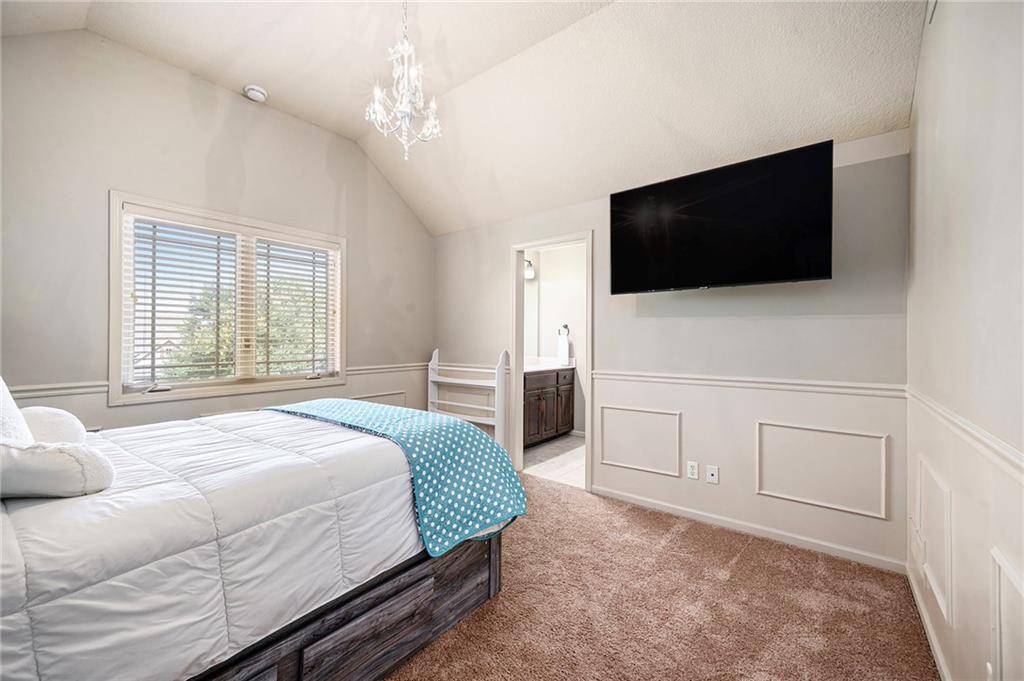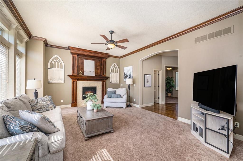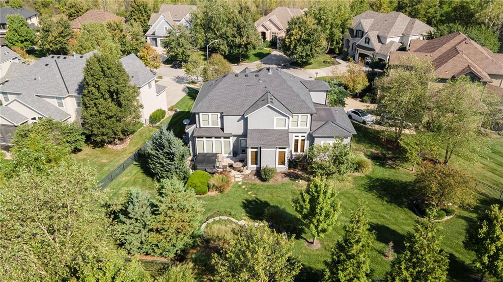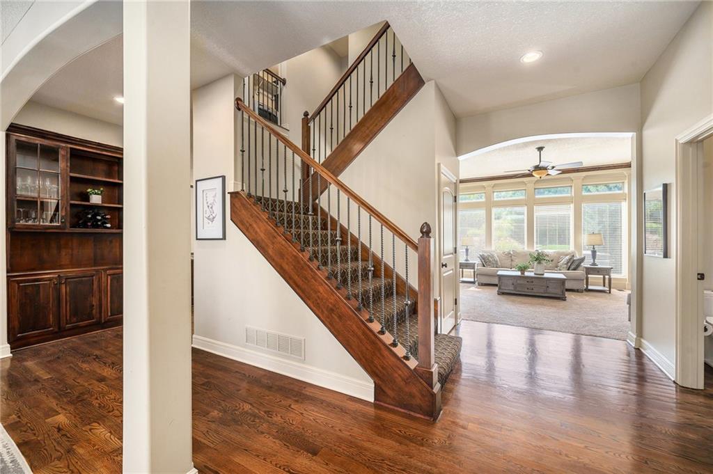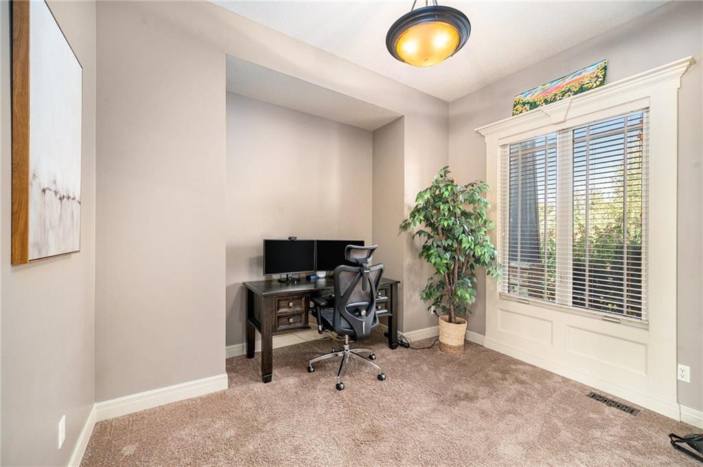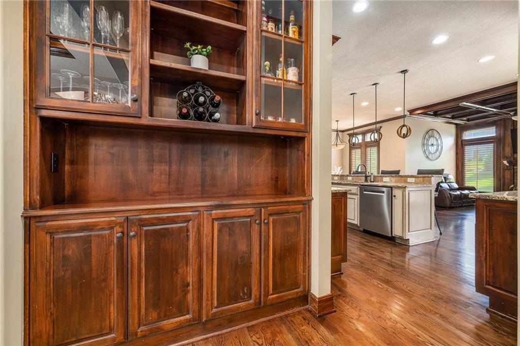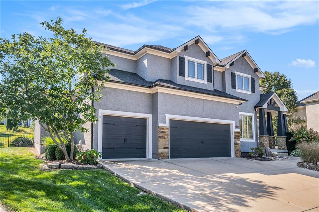 Eyes instantly draw up to the rich tone of the beamed ceilings in the formal dining room and hearth. A fireplace anchors both the living room and hearth adding a cozy touch to both entertaining spaces. Delightful details like a stacked stone accent wall, plantation shutters, double staircase, laundry at bedroom level and basement, a main floor office & two primary bedroom options make this residence both stylish and functional. The open concept great room that encompasses both the kitchen and hearth is anchored by a large kitchen island with seating–perfect for a quick morning breakfast. Newer stainless steel appliances include the oven, stove and dishwasher. Upstairs bedrooms all have walk-in closets including the oversized primary closet that would allow for a center island, maximizing organization, and also connects to the laundry room. The finished basement has a bedroom, full bath and is perfect for hosting watch parties–you won’t miss a minute of the action with food and drink stocked at the wet bar! Landscaping runs along the curve of the back patio elevating it into a picturesque and private setting for entertaining or unwinding in the hot tub. Well-maintained with a new roof, exterior paint, and hot water heater replacement within the last five years. The Coffee Creek Crossing community enjoys the prestigious Blue Valley School District as well as dining, shops and recreation at the new Blu Hawk development. Neighborhood amenities include a zero entry swimming pool, play ground, volleyball court and walking trails.