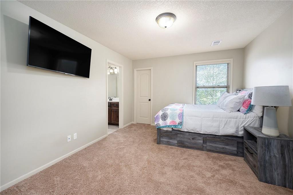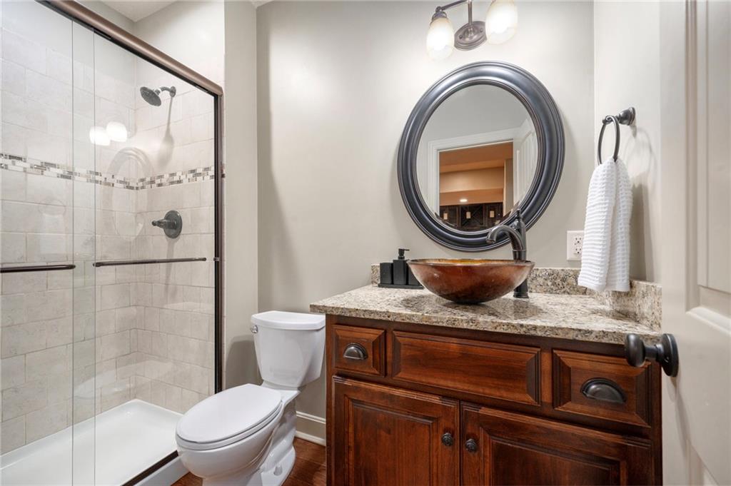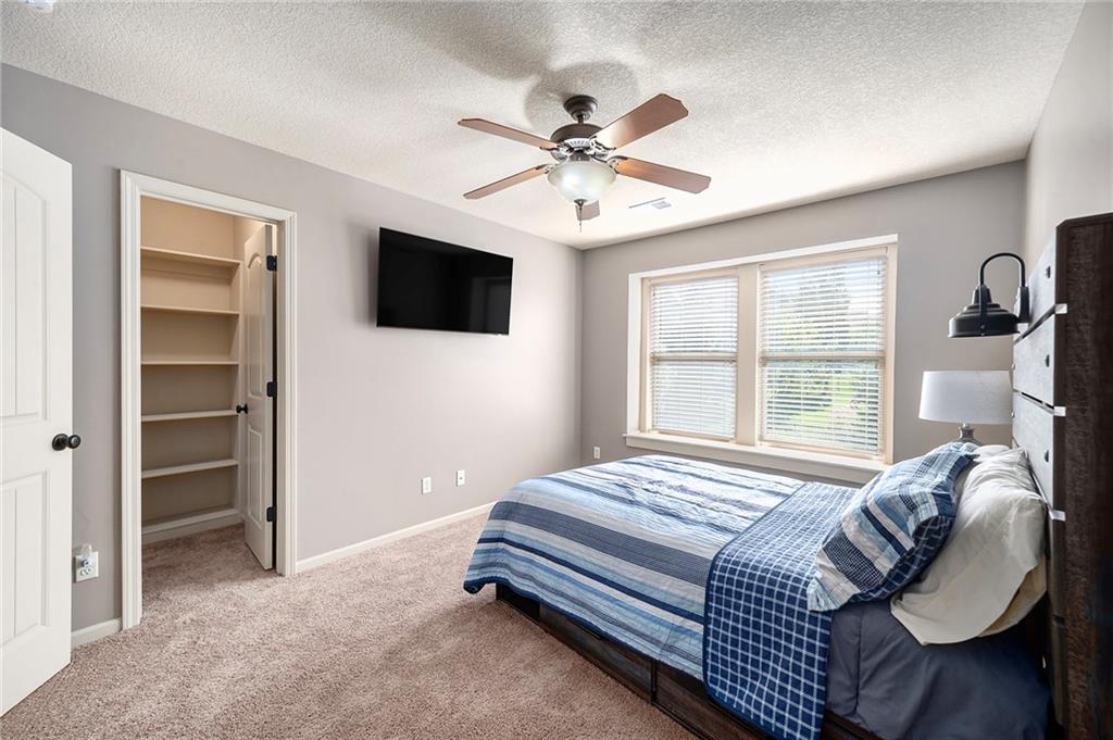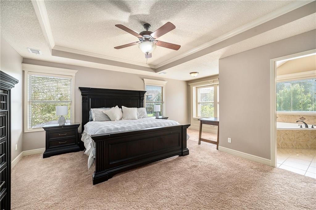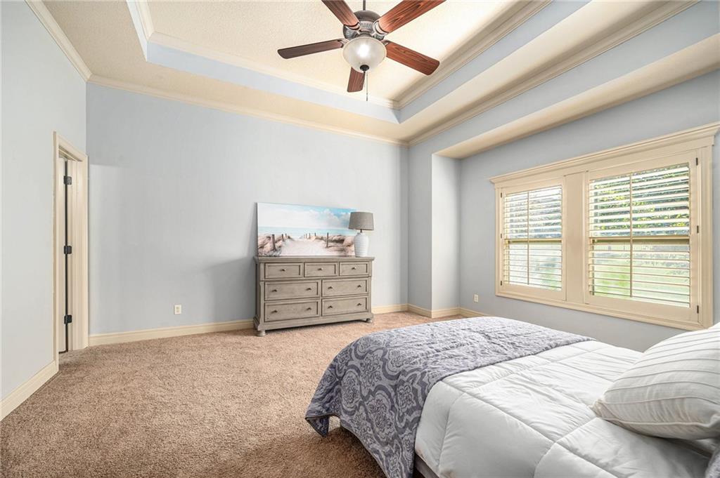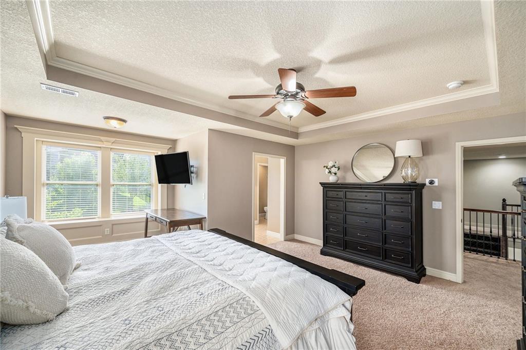 Eyes instantly draw up to the rich tone of the beamed ceilings in the formal dining room and hearth. A fireplace anchors both the living room and hearth adding a cozy touch to both entertaining spaces. Delightful details like a stacked stone accent wall, plantation shutters, double staircase, laundry at bedroom level and basement, a main floor office & two primary bedroom options make this residence both stylish and functional. The open concept great room that encompasses both the kitchen and hearth is anchored by a large kitchen island with seating–perfect for a quick morning breakfast. Newer stainless steel appliances include the oven, stove and dishwasher. Upstairs bedrooms all have walk-in closets including the oversized primary closet that would allow for a center island, maximizing organization, and also connects to the laundry room. The finished basement has a bedroom, full bath and is perfect for hosting watch parties–you won’t miss a minute of the action with food and drink stocked at the wet bar! Landscaping runs along the curve of the back patio elevating it into a picturesque and private setting for entertaining or unwinding in the hot tub. Well-maintained with a new roof, exterior paint, and hot water heater replacement within the last five years. The Coffee Creek Crossing community enjoys the prestigious Blue Valley School District as well as dining, shops and recreation at the new Blu Hawk development. Neighborhood amenities include a zero entry swimming pool, play ground, volleyball court and walking trails.