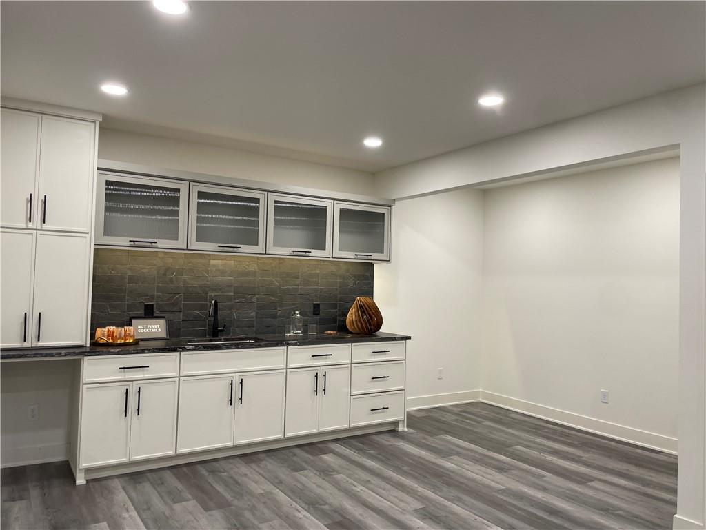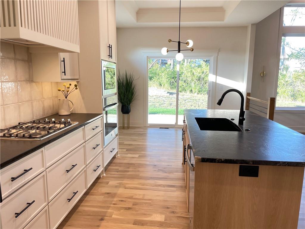 WaterCrest Landing | Sunset Views. Elevated Living. Discover the Brookside at WaterCrest Landing - by Spiess Custom Homes: an architectural statement poised on a quiet, tree-lined lot. This brand-new, Rev 1.5 Story offers a seamless blend of expert craftsmanship and tranquil natural surroundings. Spanning 2,707 finished square feet, the home's interiors are defined by impeccable details and superior finishes. The kitchen is a chef's delight, showcasing custom cabinetry, a generous island, and rich wood flooring that flows throughout the main level. The great room features a vaulted ceiling, creating an airy, light-filled space for gathering. The design effortlessly extends to the outdoors with a spacious covered patio, an ideal extension of the living area for relaxation or hosting. The lower level is built for entertainment, featuring a full wet bar anchoring the expansive recreation room. This prime location places you directly across from Lake Lenexa and Black Hoof Park, granting immediate access to scenic trails and water activities. Enjoy the carefree lifestyle of WaterCrest Landing, complete with a community pool and included maintenance services. This is a distinctive property, offering a refined, comfortable life. Make the Brookside your own.