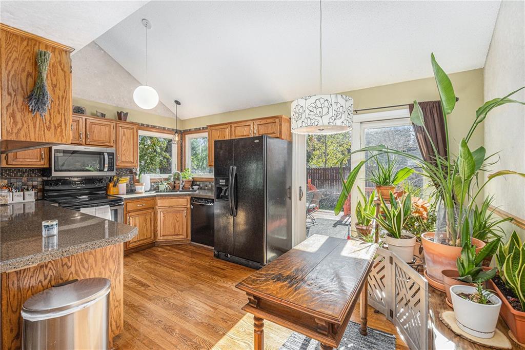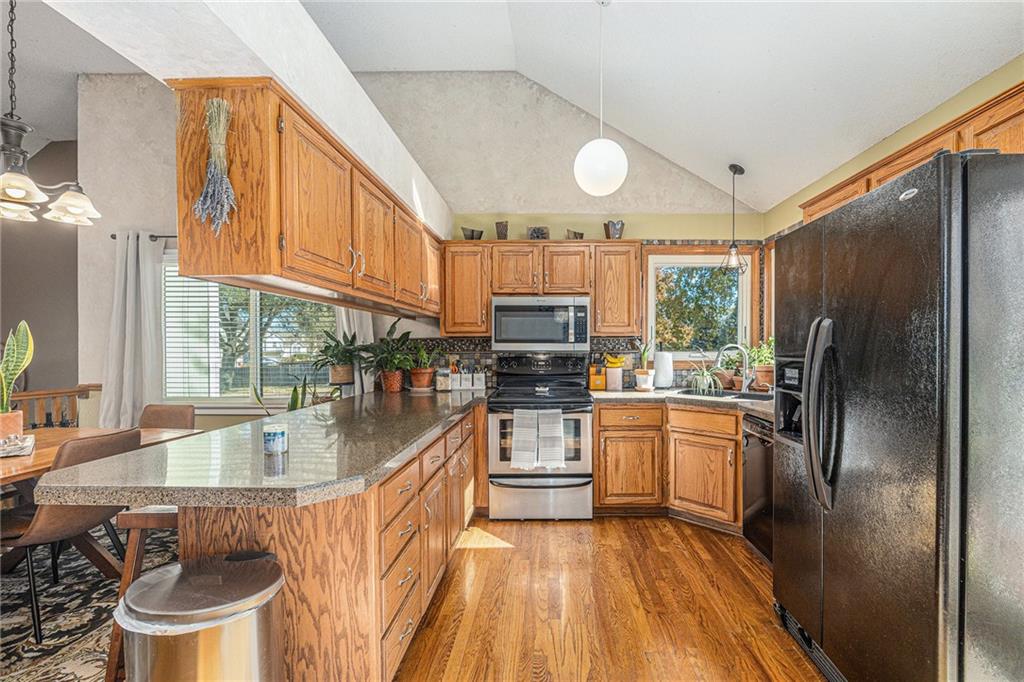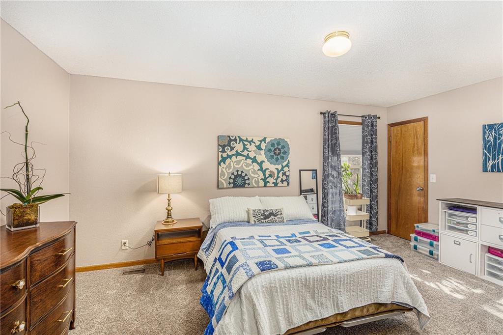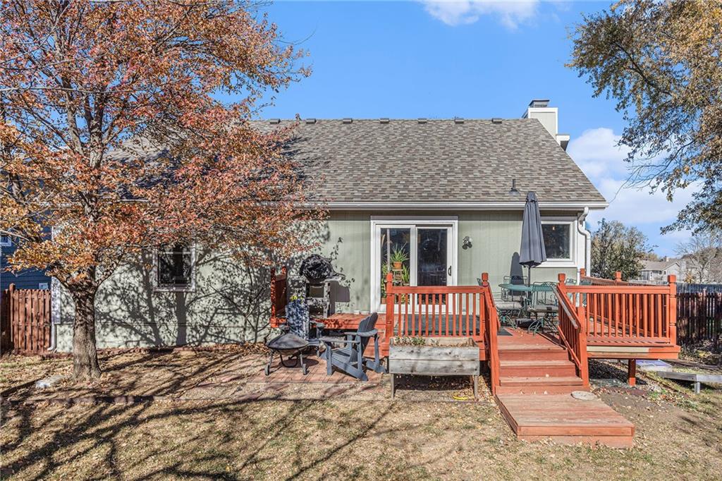 This beautiful home in the Blue Valley School District is close to award winning schools, parks, shopping, and more! Outside you are greeted by mature trees and landscaping and a welcoming front porch. Walk in to a spacious living room with soaring ceilings, a ceiling fan, a cozy fireplace with gas logs, an adorable accent wall, and brand-new carpet. The second level has hardwood floors throughout. A spacious dining room has room for your large table, is convenient to the kitchen, and overlooks the living room. The eat-in kitchen boasts granite counters, a tile backsplash, and handy bar seating. Also on the second level are two large bedrooms with carpet and walk-in closets, a laundry area, and a tiled bathroom with a shower/tub combo. Up a short set of stairs is an amazing primary suite with huge, gorgeous windows, double closets, soaring ceilings, and a ceiling fan. The updated primary bathroom features beautiful tile work, a separate tub and shower, and a double vanity. The basement level has a non-conforming 4th bedroom with a built-in desk, a walk-in closet, and a third full bathroom with tile and shower. The downstairs family room is huge! It is light and bright and boasts brand-new paint and carpet! The two-car garage has a handy work bench area and newer floor utility tiles. Walk out of the kitchen to a deck and a large, fully fenced backyard! The home features so many newer big-ticket items - a brand-new composite roof, durable cement board siding on the front and newer siding on the sides, newer Anderson windows, a newer hot water heater, and more! Don't miss out on this incredible opportunity!