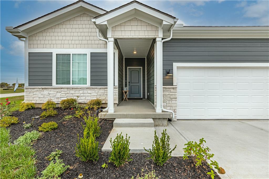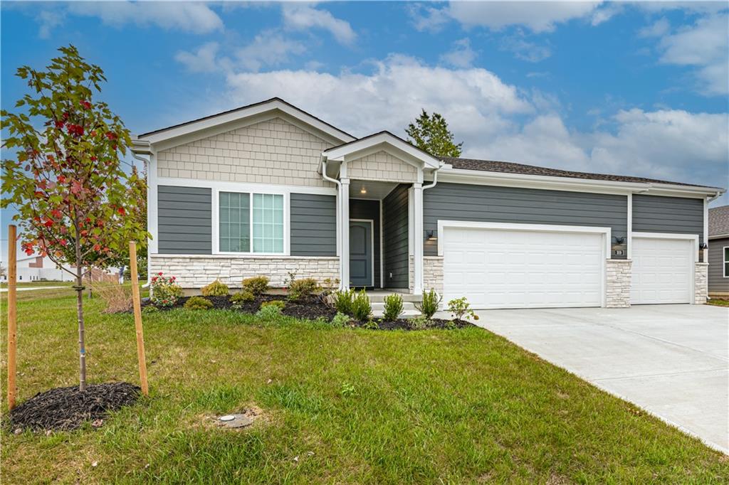 Welcome home to modern comfort and thoughtful design in this newly built home. Sitting gracefully on a corner lot within a cul-de-sac and accented with charming stone details, this 3-bedroom, 2-bath home feels bright, open, and inviting from the moment you step inside. Luxury vinyl plank flooring extends throughout the main living spaces, leading you into a spacious open-concept layout that’s perfect for everyday living and easy entertaining. The kitchen, dining, and living areas flow seamlessly together, creating the ideal spot to gather with friends, share a meal, or catch the next Chiefs game by the cozy fireplace. The kitchen itself shines with quartz countertops, crisp white cabinetry, a generous center island, and a walk-in pantry that makes staying organized effortless. Set apart at the rear of the home, the primary suite serves as your personal haven, featuring a roomy layout, walk-in closet, and a sleek en-suite bath with a walk-in shower. The two additional bedrooms at the front of the home offer endless possibilities — from a cozy guest retreat to a quiet home office or flex space for whatever your days demand. You’ll also appreciate the spacious laundry room, conveniently located near the bedrooms yet tucked out of sight, keeping household chores practical without disrupting the home’s flow. A 3-car garage provides plenty of storage, while the exterior’s curb appeal and quality craftsmanship make this home stand out. Come see how this beautifully designed home blends comfort, style, and functionality — it just might be exactly what you’ve been looking for. *Taxes in MLS was based off raw land. Taxes will be higher, but we don't know what that number is yet.
