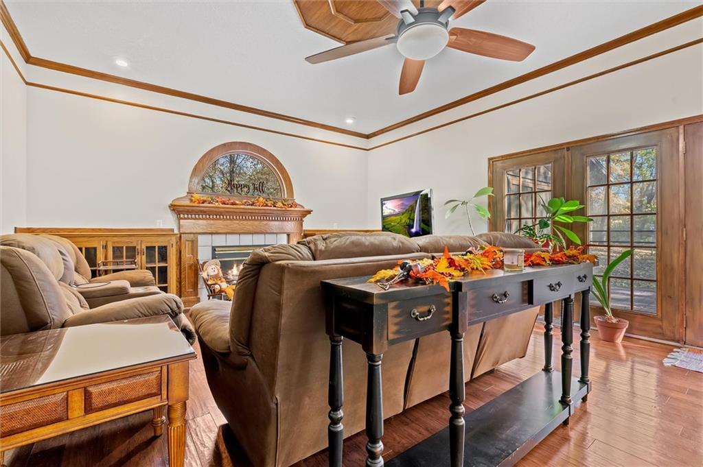 Welcome to this Picture-Perfect home, nestled in a park like setting on 3.35 acres. This 4-bedroom 4bath home is located in the highly sought-after Kearney School District. The extra-large kitchen is a chefs dream with a gas/electric range and two ovens. Above and under cabinet lighting shows off the beautiful cabinetry. Enjoy hosting family and friends in the formal dining room with a pass through from the kitchen. A cozy fireplace calls the living room home. The oversized master suite includes a large walk-in closet, double sinks, shower and a jacuzzi tub. Bring the family to stay in the two additional bedroom suites each with a full bath and walk in closet. This home boasts with an abundance of natural lighting. Entertaining is made easy in one or both of the screened in porches or on the extra-large deck. An oversized double car garage in the front, a full concrete basement with workshop and third garage leads to a second driveway. Storage was a priority when designing this custom-built home with a unique floor plan. New roof, new gutter and new paint. This home won't last long.