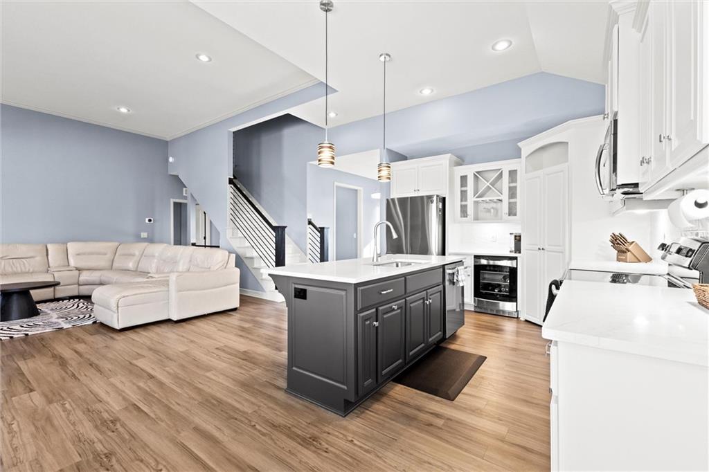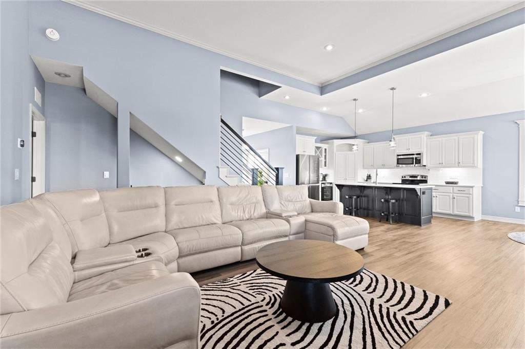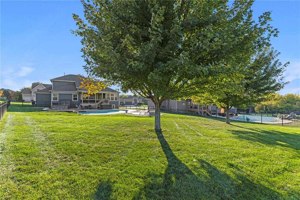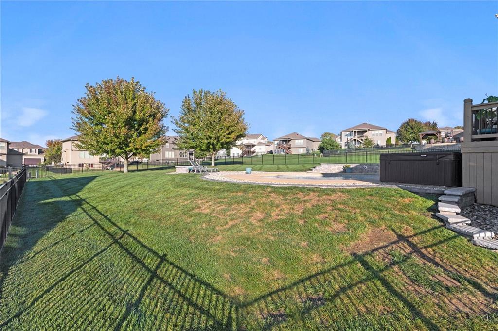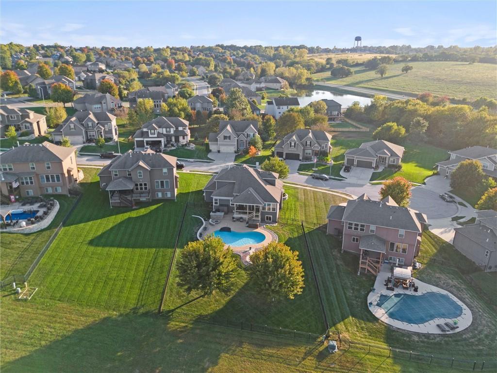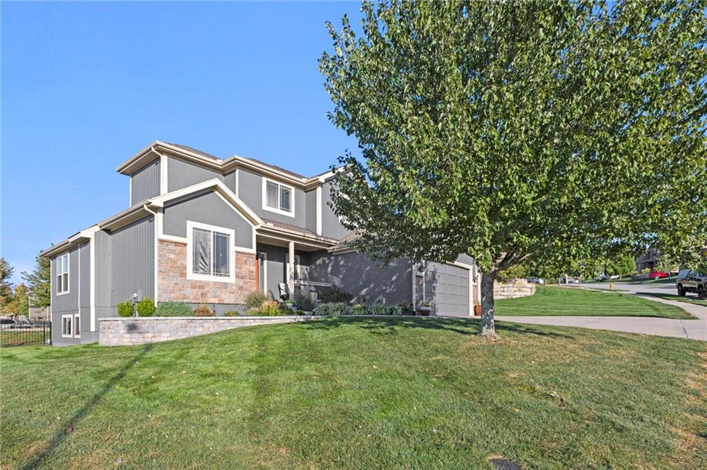 Welcome to your private retreat in Raymore! This beautifully updated 1.5 story home sits on a quiet cul-de-sac street and offers the perfect blend of modern upgrades and resort-style living. Step inside to find new LVP flooring, fresh paint, stylish lighting and plumbing fixtures, and countless thoughtful touches throughout. The main level features a flex room that can serve as a home office or formal dining space. The kitchen and living areas have tall ceilings, large windows, and flow seamlessly, perfect for entertaining or everyday comfort. Also, the spacious primary suite has a luxurious new bathroom, includingh a double vanity with quartz counter, a custom tiled walk-in shower with rainhead, a premium bidet toilet, and walk-in closet that connects to the laundry room. Upstairs, you’ll find 3 generous secondary bedrooms, with 2 sharing a Jack & Jill bathroom and the 3 bedroom with en-suite bathroom. The finished daylight basement expands your living space with a large rec room, stained concrete floors, full bar, and a private gym. Step outside to your backyard oasis featuring a saltwater pool, hot tub, outdoor bar with a concrete countertop and space for a built-in kegerator and grill, a gas firepit, and Gemstone permanent lighting that brings the exterior to life at night year round. The large fenced yard backs to common area for extra privacy and space. This home truly has it all, modern updates, incredible outdoor living, and a quiet location close to everything Raymore has to offer.