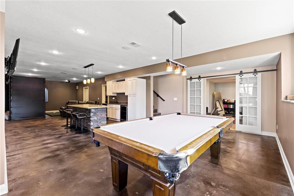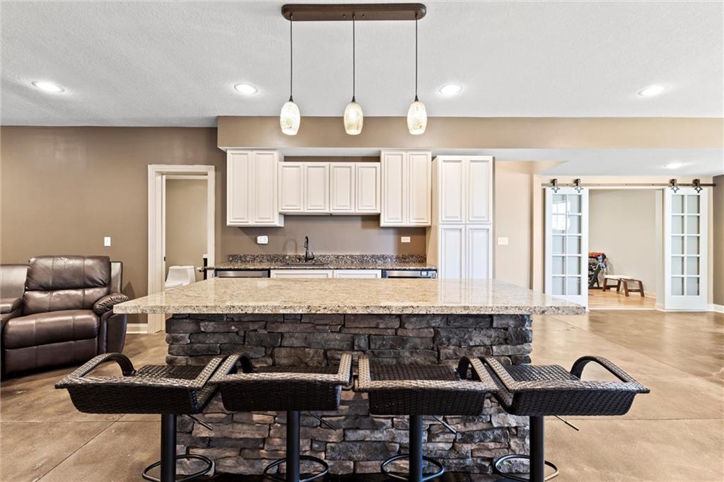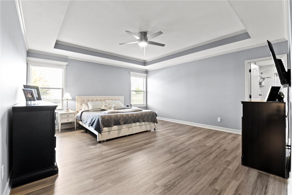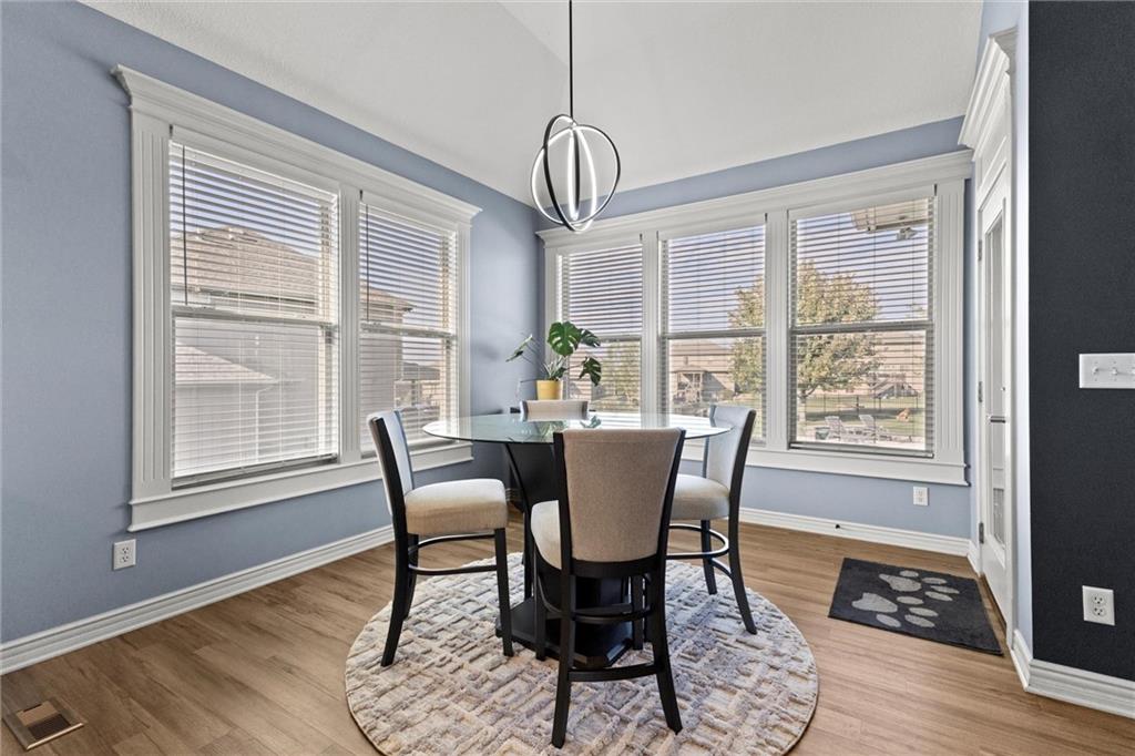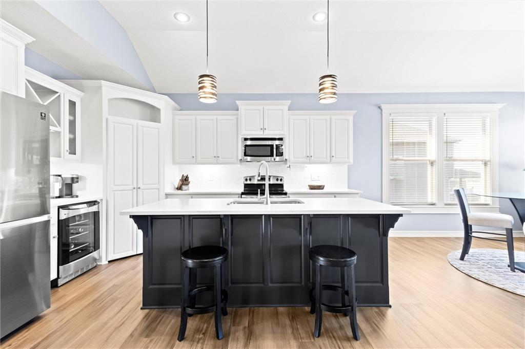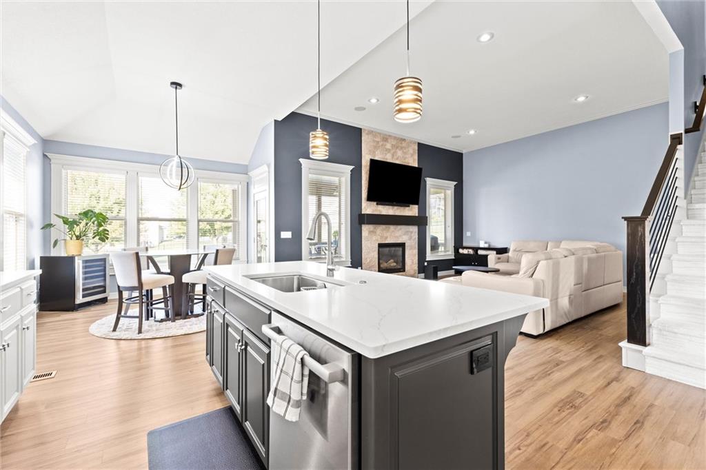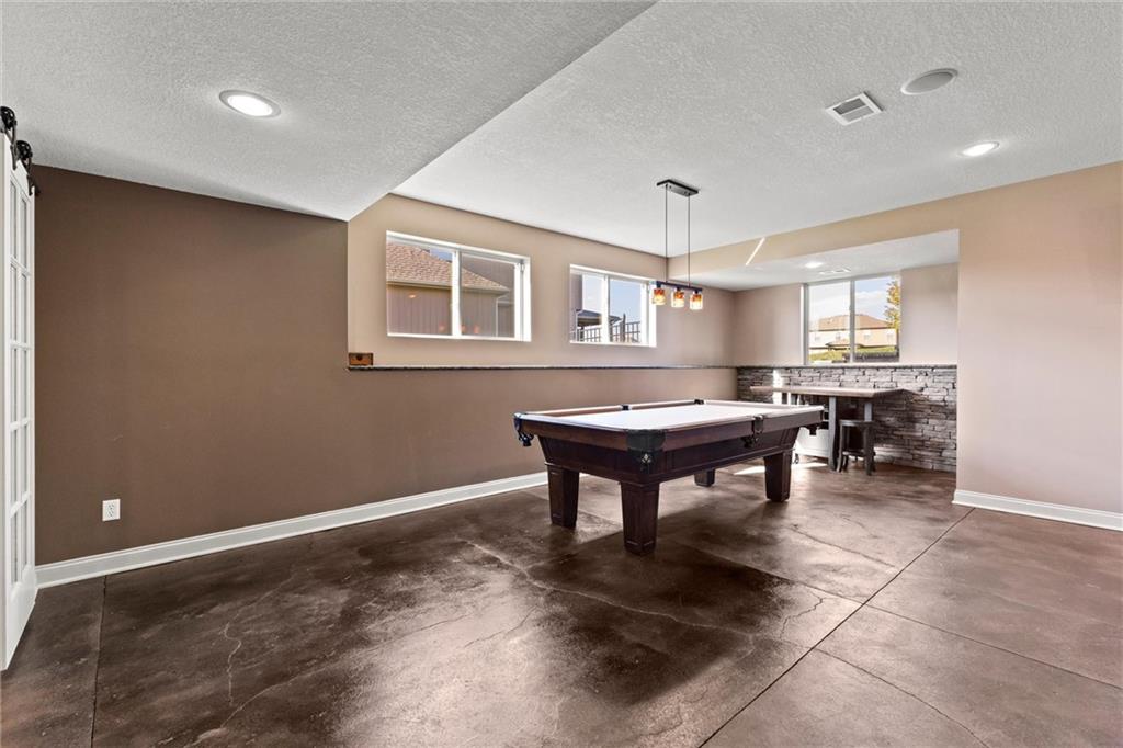 Welcome to your private retreat in Raymore! This beautifully updated 1.5 story home sits on a quiet cul-de-sac street and offers the perfect blend of modern upgrades and resort-style living. Step inside to find new LVP flooring, fresh paint, stylish lighting and plumbing fixtures, and countless thoughtful touches throughout. The main level features a flex room that can serve as a home office or formal dining space. The kitchen and living areas have tall ceilings, large windows, and flow seamlessly, perfect for entertaining or everyday comfort. Also, the spacious primary suite has a luxurious new bathroom, includingh a double vanity with quartz counter, a custom tiled walk-in shower with rainhead, a premium bidet toilet, and walk-in closet that connects to the laundry room. Upstairs, you’ll find 3 generous secondary bedrooms, with 2 sharing a Jack & Jill bathroom and the 3 bedroom with en-suite bathroom. The finished daylight basement expands your living space with a large rec room, stained concrete floors, full bar, and a private gym. Step outside to your backyard oasis featuring a saltwater pool, hot tub, outdoor bar with a concrete countertop and space for a built-in kegerator and grill, a gas firepit, and Gemstone permanent lighting that brings the exterior to life at night year round. The large fenced yard backs to common area for extra privacy and space. This home truly has it all, modern updates, incredible outdoor living, and a quiet location close to everything Raymore has to offer.
