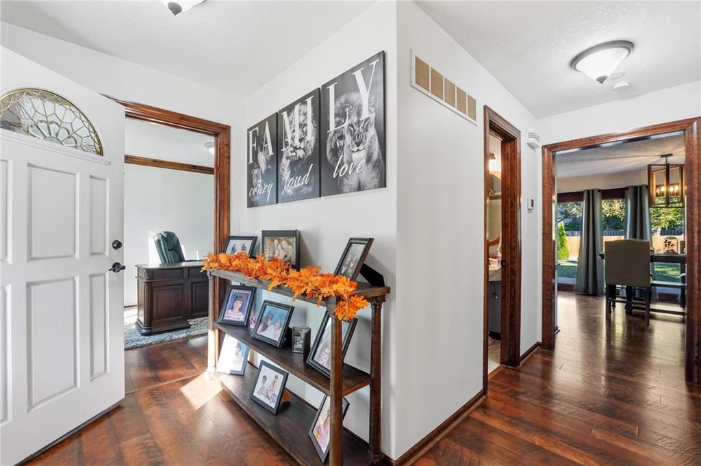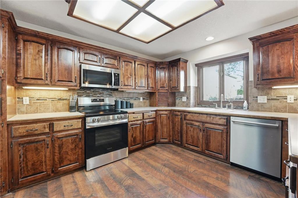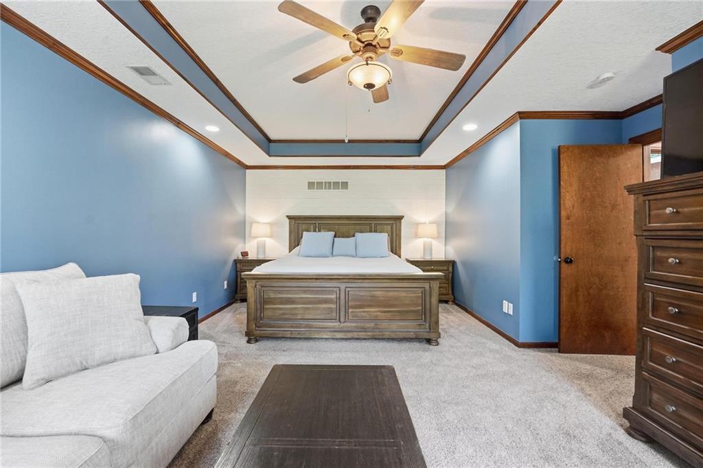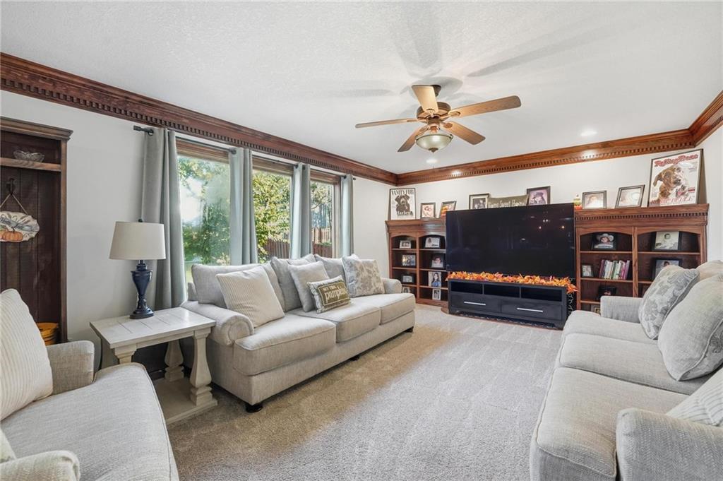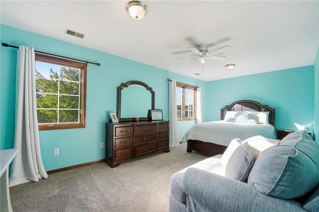 Gorgeous 2 story with new exterior paint, interior paint, carpet! The bedrooms on the 2nd level are HUGE, with walk-in closets. Welcoming front porch opens to a beautiful entry with wide plank floors that extend through to dining, kitchen & flex room on main level (could be 4th bedroom). The kitchen is a dream, tons of counter space, abundance of cabinets, upgraded s/s appliances, custom tile backsplash. Dining area has new fixture, large windows & full glass door out to composite deck, level backyard with newer privacy fence. The great room is open to the dining & kitchen, ideal for entertaining. Extensive crown molding, custom built-ins on either side of a gas fireplace, large windows overlooking backyard. A FULL bathroom on this level gives flexibility for the use of the main level room that could also be an office. Upstairs, the primary suite has a large sitting room space, luxury bath with updated tile flooring, double vanity, large jetted tub & separate shower, vaulted ceiling & skylight. Large walk-in closet, too! Spacious bedroom level laundry room has great storage, folding counter. 2 additional bedrooms are much larger than normal 2 story home, offering great walk-in closets & ceiling fans! Both bedrooms have private access to the shared bathroom! Lower level has 9' finished ceilings in the family room. Built-ins, custom lighting and over 700 sqft make it perfect for home theater space! Tons of unfinished storage space remains. High efficiency HVAC with humidifier is zoned for comfort summer or winter months. Central vac & 2 large electrical panels offer plenty of room for future expansion! The 3 car garage is much larger than most, 23' deep, 30' wide & 10' ceilings, lot of electrical outlets for charging tools, adding a workbench area.