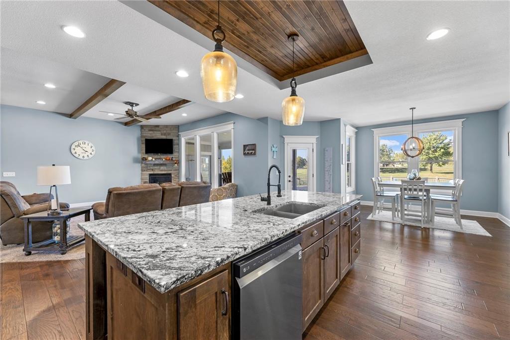 You'll be thoroughly impressed by this stunning custom-built ranch home in the sought-after Bur Oak Estates, perfectly situated on 1.21 acres with picturesque views overlooking Lake Miola. This 4-5 bedroom, 3.5-bath residence is a flawless fusion of high-end upgrades and modern elegance, offering a spacious, open floor plan that ensures an ideal flow for both daily life and hosting. The heart of the home is the showstopper gourmet kitchen, featuring custom cabinetry, a generous island, granite countertops, and a massive walk-in pantry, all flowing into the inviting great room. The great room is a masterpiece of design, showcasing expansive windows, vaulted beamed ceilings, and a beautiful rock gas fireplace, setting the stage for ultimate relaxation. Retreat to the luxurious primary en-suite, which boasts a tray ceiling, a huge tiled shower, an elegant freestanding tub, double vanities, a walk-in closet, and private access to the deck for a seamless indoor/outdoor escape. The main level also provides two additional spacious bedrooms, a full bathroom, and a dedicated office. Downstairs, the finished lower level is an entertainer's paradise with a large family room anchored by an impressive Wet Bar with granite countertops, plus a comfortable fourth bedroom and a fifth nonconforming one, while the converted fourth-car garage now serves as a dedicated workout gym. Outside, the estate is an entertainer's dream-the fenced 1.21-acre lot features a fiberglass saltwater heated pool surrounded by a huge patio with a firepit, a composite deck, and lush landscaping, offering the complete luxury package. Also enjoy all the amenities Lake Miola offers, including boating, swimming, trails, and camping.