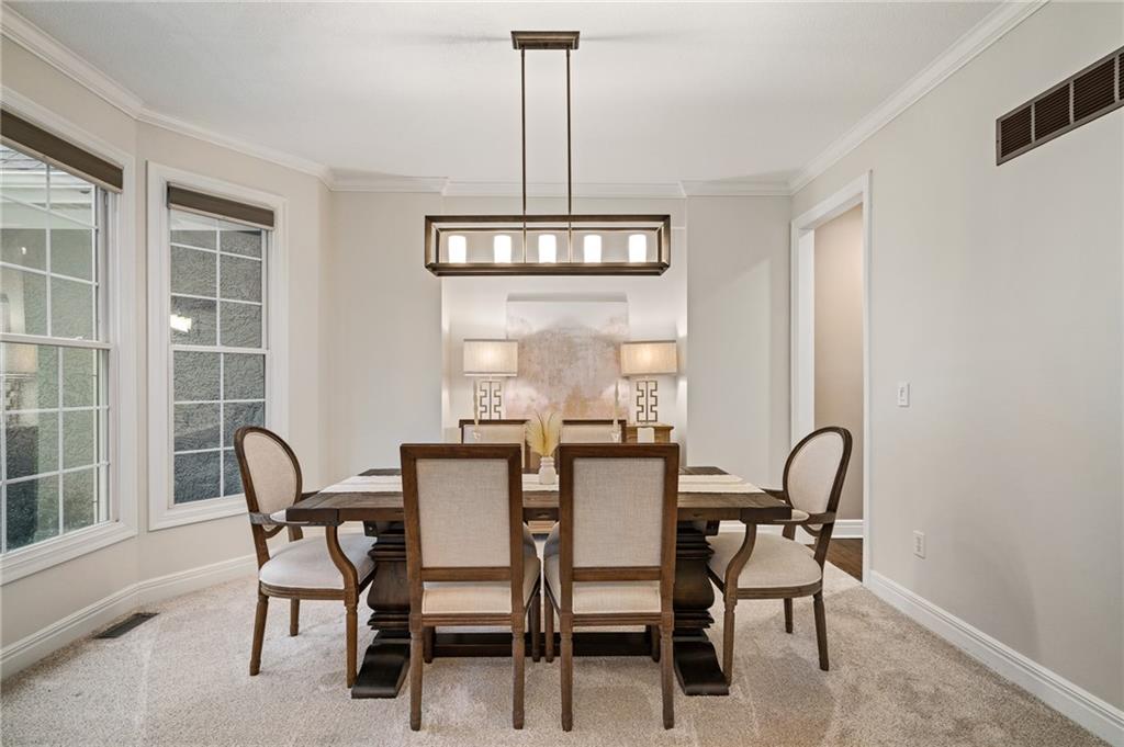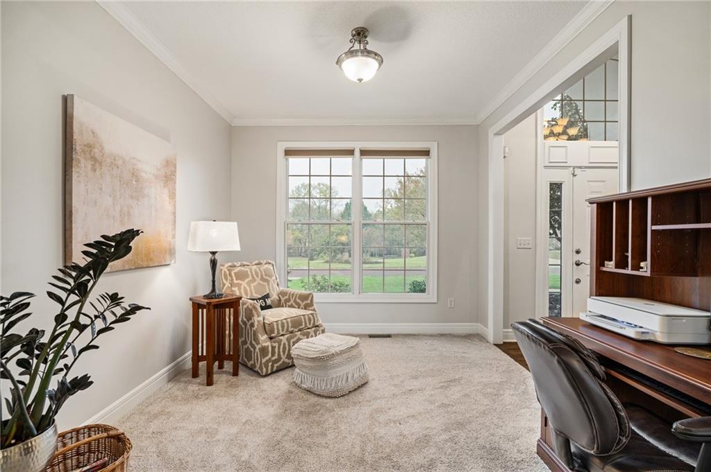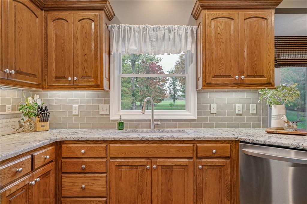 Morse Village Estates stunner! Picturesque setting on 1.1 acre lot surrounded with views of private, treed oasis. Main level flows seamlessly from the kitchen to the great room, den/study and entry or just a few steps outside to the expansive backyard patio. Primary bedroom offers a true retreat with sitting room, serene bathroom and oversized primary closet. Five car garage spaces including the must see 29'x38' detached garage for car or hobby enthusiasts, storage, sports, entertain/party or attic offers potential for added space, endless options! Roomy secondary bedrooms and closets. Secondary bedroom with wow-factor loft/bunk space. Lower level offers game room, media space, wet bar, half bath and cozy sitting area. New roof, full-yard irrigation system, updated kitchen counters, fresh paint, squeaky clean and beautifully maintained. Lot has space for pool, sport court and room to spare. Blue Valley Schools, trails, parks, restaurants, entertainment and highway access are all nearby.