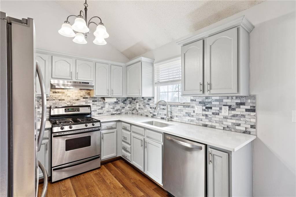 Wow! Check out the curb appeal, mature trees and large corner, cul-de-sac lot when you pull up to this home! As you walk inside, you'll immediately notice the tall, vaulted ceilings and warm, cozy fireplace in your spacious living room! Then, venture into the completely UPDATED kitchen with quartz countertops, painted cabinets, under cabinet lighting and pantry with pull-out shelves! All stainless steel appliances stay! Updated smart switch lighting throughout main level! Enjoy extra family space in your finished lower level family room with half bath! Relax outside on your large deck overlooking the fenced backyard and green space beyond that! And, to top it off, look at these big ticket items that are already done for you: Furnace and Air Conditioner only 3 years old! Roof and gutters only 2 years old! Garage door openers only 2 years old! Hurry! Don't miss your opportunity to get into this beautiful home in Liberty school district!