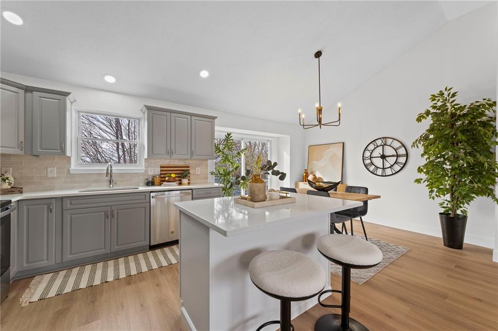 This beautifully updated 3-bedroom, 2-bath home offers 1,686 square feet of modern comfort in the desirable Line Creek Meadows subdivision. The bright and open floor plan features a fully updated kitchen with freshly painted cabinetry, quartz countertops, stainless steel appliances, and a brand-new center island designed for everyday living and entertaining. The adjoining dining area opens through sliding glass doors to a spacious deck, creating an ideal indoor–outdoor flow. The inviting family room includes a gas fireplace that serves as a warm focal point for the main living space. The primary bedroom offers a private, updated bath with a new vanity, new flooring, a beautifully tiled shower, and modern lighting. The main bathroom has also been refreshed with new flooring, updated lighting, and contemporary finishes. New flooring is found throughout the home, and the exterior has been freshly painted to enhance curb appeal. The walkout basement features new luxury vinyl plank flooring, an updated laundry area with the washer and dryer included, and direct access to a second deck that overlooks the backyard. A small storage shed is located at the rear of the property, offering additional convenience for tools and outdoor equipment. This home is located in the Platte County R-III School District and is served by Barry Elementary School, Platte Purchase Middle School, and Platte County High School. Buyers are encouraged to verify school boundaries with the district. Convenient access to major highways including 152, I-29, and MO-9 makes commuting easy, and nearby attractions include Line Creek Park and Ice Arena, Line Creek Trail, the Barry Road retail corridor, and the Zona Rosa shopping and entertainment district. With modern updates, multiple outdoor living spaces, and a prime Northland location, this move-in-ready home is ready to impress. Schedule your showing today.