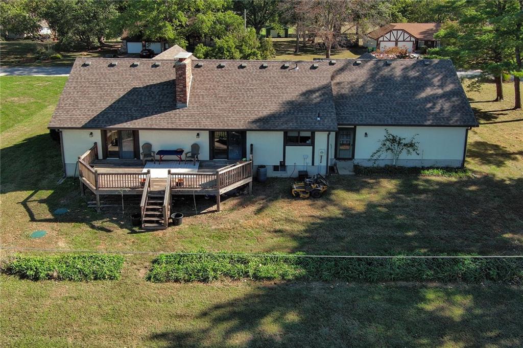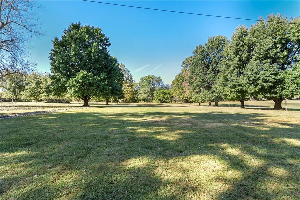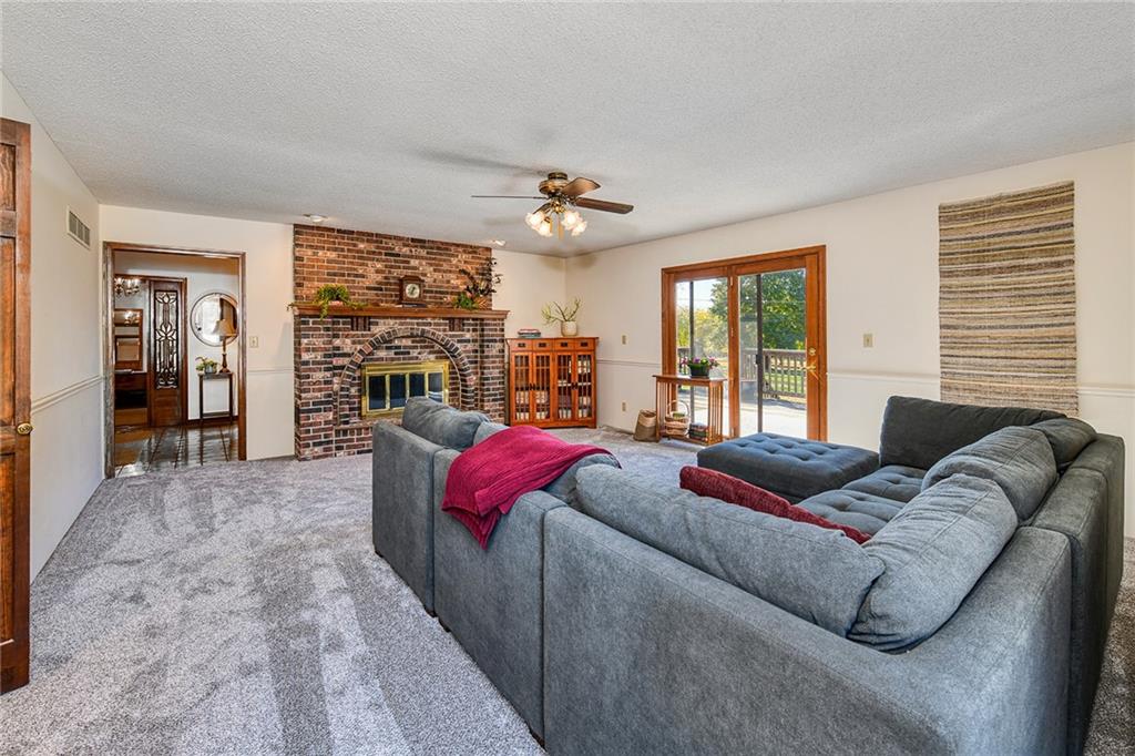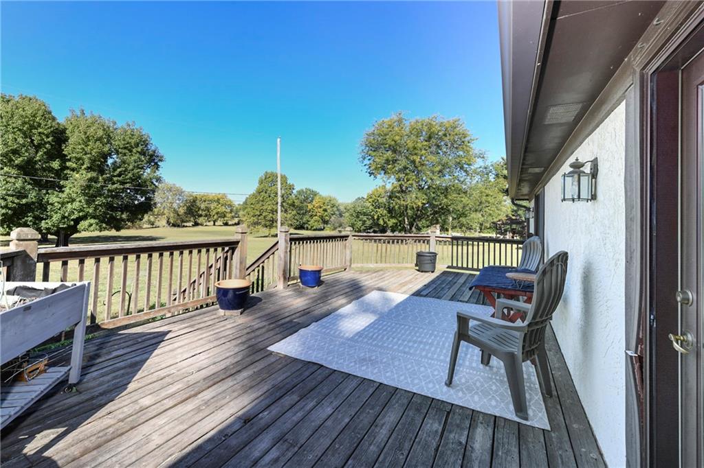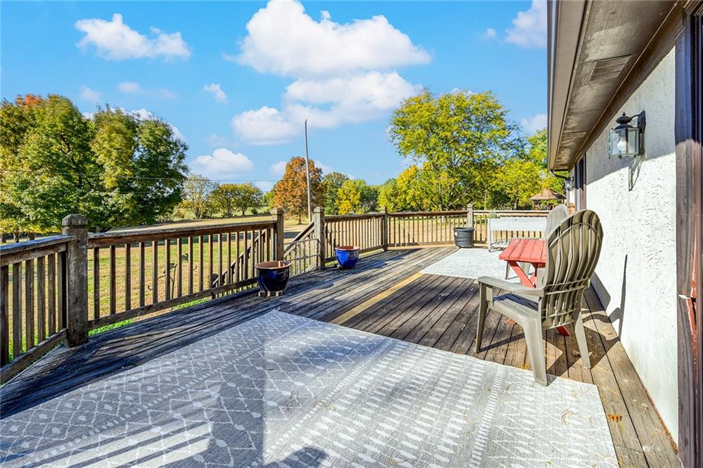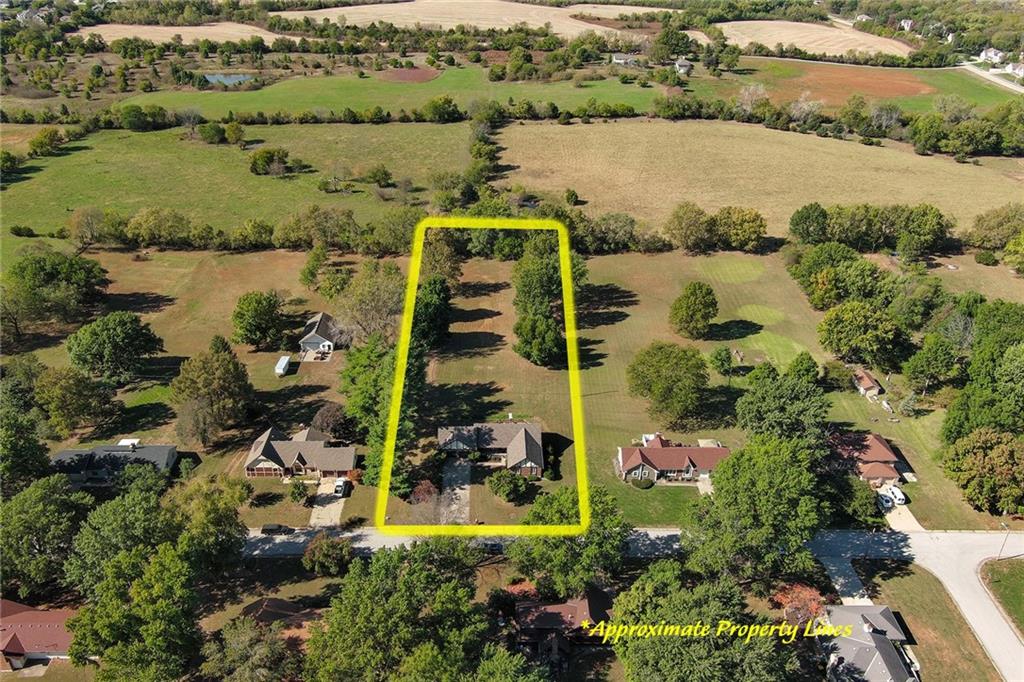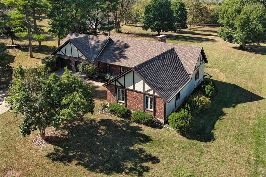 Looking for small acreage with excellent access to city conveniences and NO HOA? You may have just found your dream home! This spacious, brick-front true ranch home sits on close to 2 acres on a tranquil tree-lined street just minutes from the Legends! This home begins with great curb appeal including a large covered front porch and a beautiful beveled glass front door which ushers you in to a spacious foyer with custom tile floor and built in bookcase. On your left, the large formal dining room shines with parquet floor and beveled glass sidelights. The kitchen offers abundant cabinet space, a beamed ceiling, built-in desk, gas cooking, double oven, and a center island with butcher block countertop. The adjoining hearth room features a custom brick fireplace with built-in grill and French doors leading to the deck. It's the great room that steals the show, though, showcasing a second brick fireplace with sitting hearth, a wet bar, tons of windows and a sliding door which leads out to the deck for easy entertaining. The thoughtfully designed floor plan tucks all three bedrooms and two full baths away in a private wing of the house, separate from the main living areas. Fresh carpet and paint throughout and recent updates including hardware make it move-in ready. Additional highlights include a convenient laundry room and half bath off the kitchen, an oversized garage with direct backyard access, and a HUGE basement with tons of storage which could easily be finished into additional living space. With 3-year old ROOF & gutters, Pella windows, and a Dry Basement warranty, this home offers both comfort and peace of mind. The beautiful, manicured acreage provides level play space and plenty of room for your toys, a pool, or possible outbuilding. Located in the sought-after Piper School District, this home checks all the boxes - rural tranquility, modern convenience, and room to grow!