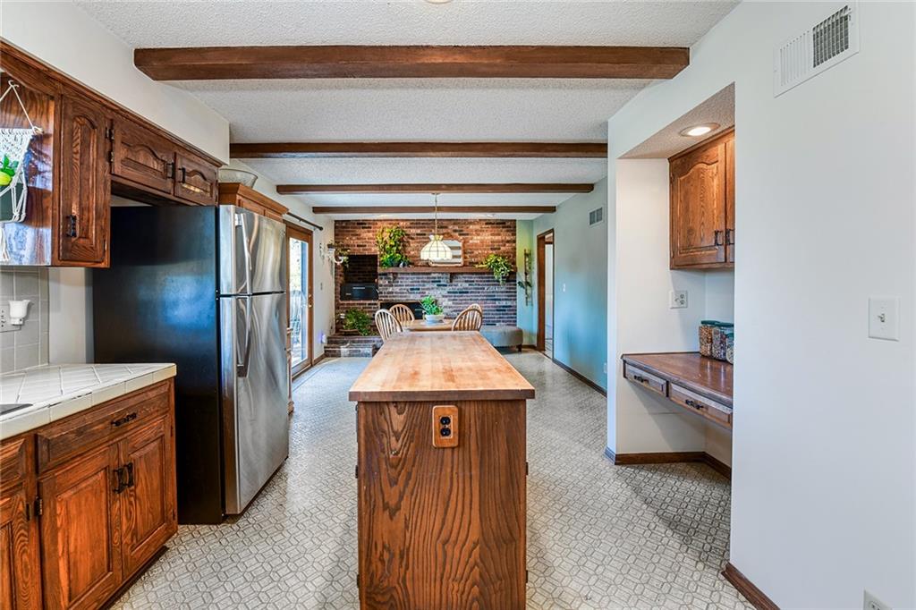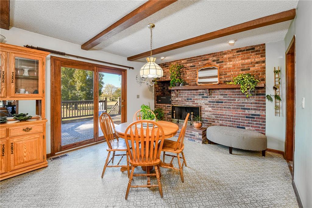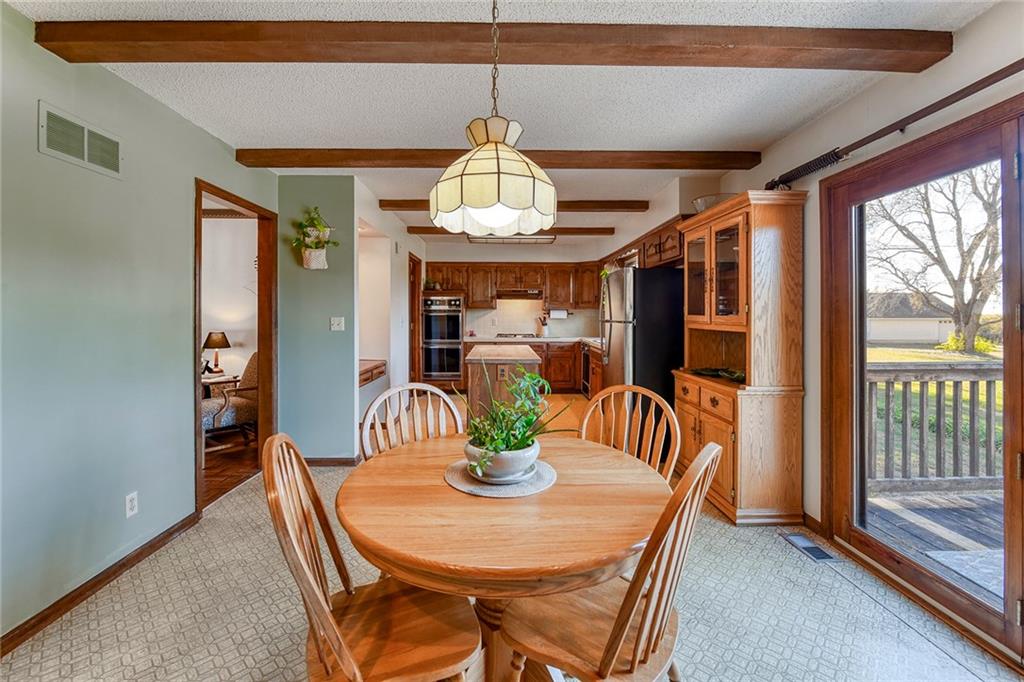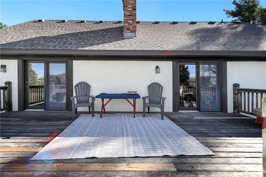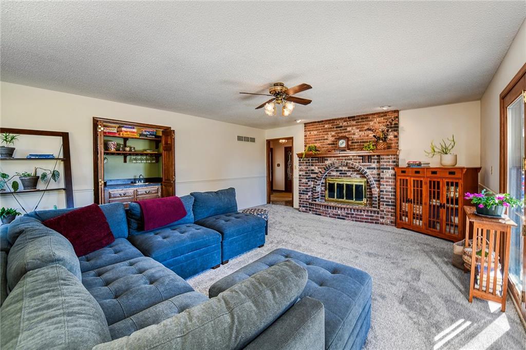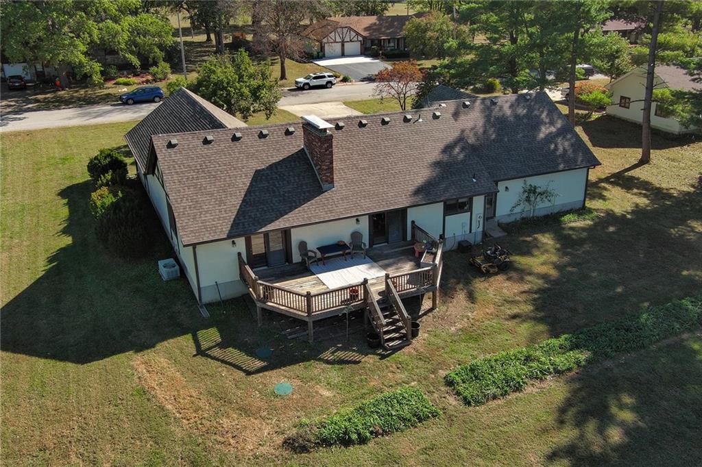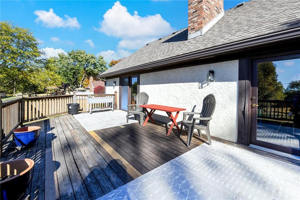 Looking for small acreage with excellent access to city conveniences and NO HOA? You may have just found your dream home! This spacious, brick-front true ranch home sits on close to 2 acres on a tranquil tree-lined street just minutes from the Legends! This home begins with great curb appeal including a large covered front porch and a beautiful beveled glass front door which ushers you in to a spacious foyer with custom tile floor and built in bookcase. On your left, the large formal dining room shines with parquet floor and beveled glass sidelights. The kitchen offers abundant cabinet space, a beamed ceiling, built-in desk, gas cooking, double oven, and a center island with butcher block countertop. The adjoining hearth room features a custom brick fireplace with built-in grill and French doors leading to the deck. It's the great room that steals the show, though, showcasing a second brick fireplace with sitting hearth, a wet bar, tons of windows and a sliding door which leads out to the deck for easy entertaining. The thoughtfully designed floor plan tucks all three bedrooms and two full baths away in a private wing of the house, separate from the main living areas. Fresh carpet and paint throughout and recent updates including hardware make it move-in ready. Additional highlights include a convenient laundry room and half bath off the kitchen, an oversized garage with direct backyard access, and a HUGE basement with tons of storage which could easily be finished into additional living space. With 3-year old ROOF & gutters, Pella windows, and a Dry Basement warranty, this home offers both comfort and peace of mind. The beautiful, manicured acreage provides level play space and plenty of room for your toys, a pool, or possible outbuilding. Located in the sought-after Piper School District, this home checks all the boxes - rural tranquility, modern convenience, and room to grow!