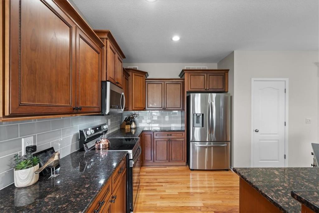 Stunning Two-Story in Award-Winning Blue Valley Schools! This beautifully updated home offers a perfect blend of comfort, style, and functionality in an unbeatable location. Over the past five years, updates include new interior and exterior paint, new carpet throughout the first and second floors, a new stamped concrete patio, updated kitchen backsplash and fireplace surround, a new furnace, 220V EV outlet, and more. The spacious, open floor plan is ideal for entertaining with a hearth room, formal dining room, and inviting living room. A main-floor bedroom with a full bath also makes the perfect guest suite, home office or flex space. Upstairs, the primary suite is a true retreat featuring a cozy sitting room, luxurious ensuite bath, and a huge walk-in closet. All secondary bedrooms are generously sized, include walk in closets and have convenient access to bathrooms. The finished basement provides additional living space, a full bath, and the potential to easily add a sixth bedroom if desired. The expansive patio is perfect for outdoor gatherings. Located just minutes from top-rated Blue Valley schools, shopping, dining, and major highways—this home truly has it all!