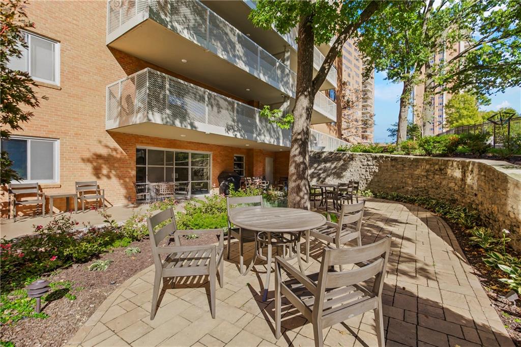 Absolutely stunning South facing unit offers open fl plan with beautiful cherry floors. well-designed open kitchen with quartz countertops, center island and stainless appliances, under cabinet lighting and electric outlets for sleek backsplash, Walk in pantry, cabinet roll outs, soft close drawers, newer windows & sliding door leads to large treed balcony with Hunter Douglas blinds to allow light and privacy. beautiful built in's living rm, french doors from liv to bedroom/dining room w/enormous wall of closets, walk-in closet in primary bedroom, large walk-in shower in primary bath,. Laundry room, party room and exercise room in common areas. leisurely walk to Plaza, Loose Park, entertainment, restaurants and more. **BEST PRICE PER SQUARE FOOT ON THE PLAZA. HOA TOTAL OF $1815 INCLUDES ALL PROPERTY TAXES, WATER, HEAT AND A/C!!! AS WELL AS THE IN DOOR HEATED $100 PARKING FEE **