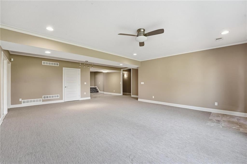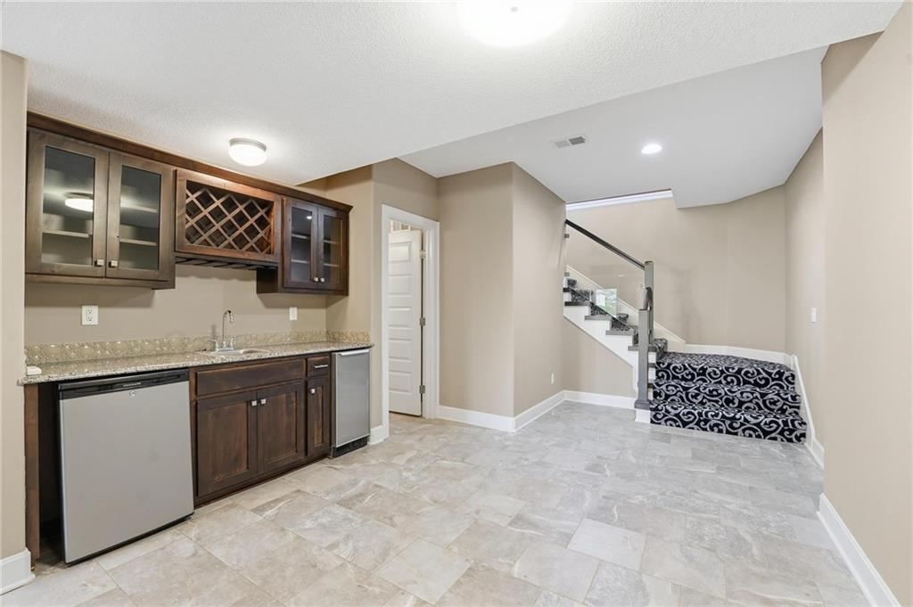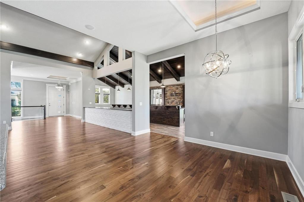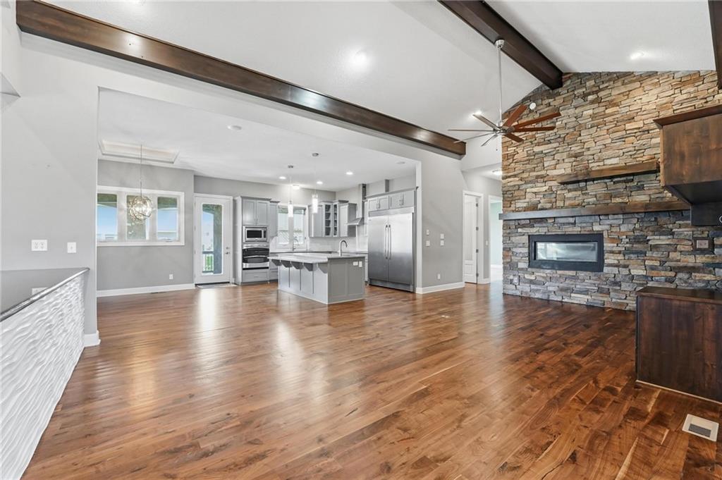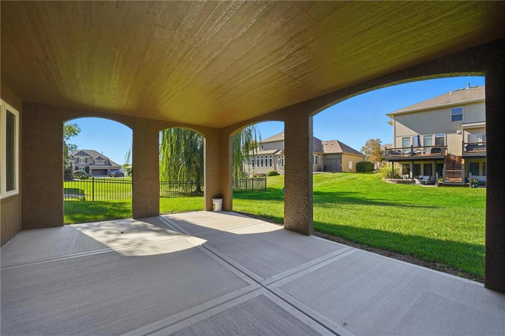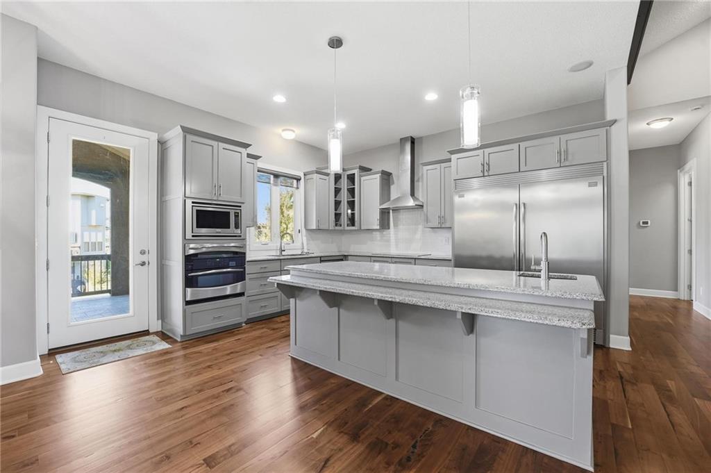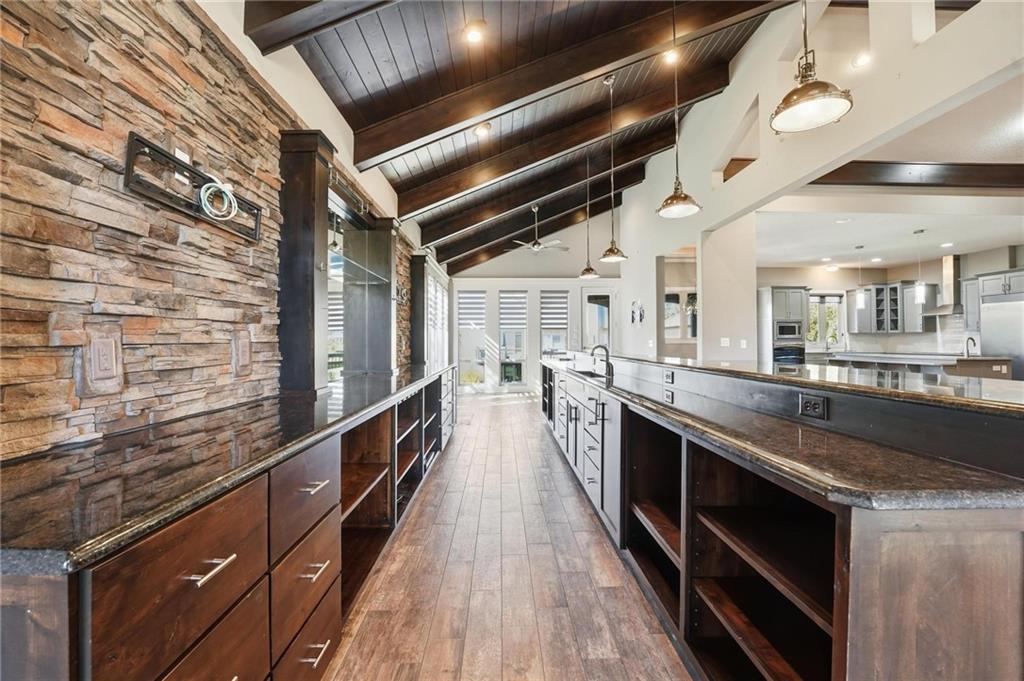 Exceptional custom home designed with entertaining in mind. Stunning walnut floors from the gracious entry, through the great room, kitchen & breakfast room. Great room has vaulted ceiling, gas fireplace in stone accent wall, built-ins & floating shelves. Kitchen has large island, top of the line appliances including built-in Frigidaire Professional refrigerator/freezer, cooktop with vented hood, dbl oven, microwave & dishwasher. Pantry is 5x16 with built in desk under window, tons of shelf space. Breakfast nook is ideal for banquet, full glass door out to Lanai, vaulted ceiling, ceiling fan. Bonus main level family room has 19' bar w/custom cabinets, granite counters, stone walls behind bar, 2nd 15' long serving bar with tons of storage, granite countertop & mid century design. Family room has 15' vaulted ceiling with tongue & groove ceiling & beams. A beautiful den space, or room for baby grand piano, under the beautiful fixture plus additional dining space surrounded by windows & door out to large covered Lanai with tile floor. The primary suite is large with vaulted ceiling & luxury bath with separate vanities, very large tiled shower, dream 10x18 walk-in closet with large dresser island, walks through to laundry. Staircase to lower level with custom glass panel railing, large windows flooding the stairway with natural light. Large family room with wet bar area with tiled floor. 1 guest suite with bath & large walk-in closet, 2 additional bedrooms have walk-in closets, each with private vanity spaces, share shower. 1 bedroom has a secret passageway through built-in bookcase, to 8x9 storm area/storage under front porch! New covered patio off lower level family room is 20x13. Car lovers, a bonus 4th garage, has driveway from main level, is 22'd x 19'w. The main level 3 car garage is oversized, 31'wide, with 11' ceiling, 2 car side is 24'deep, 1 car side 29'deep with 9' wide door. North Shore is Cass County, Lee's Summit Schools.
