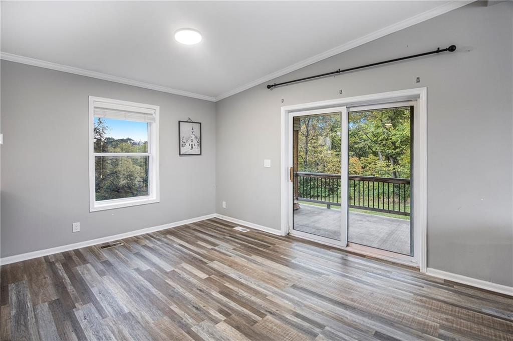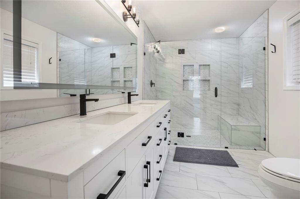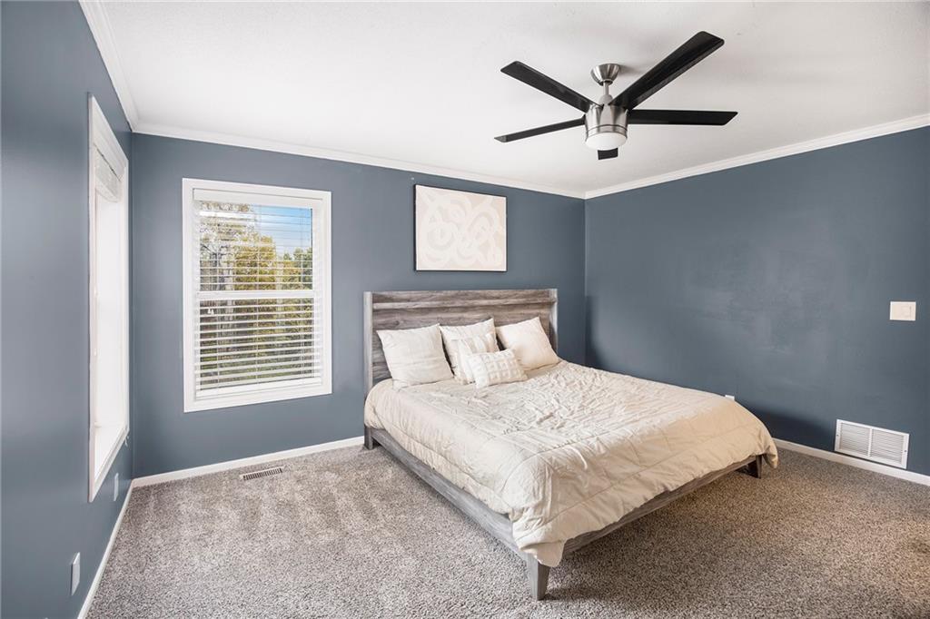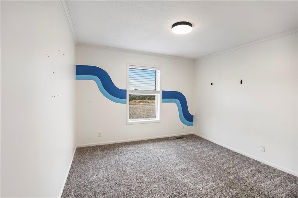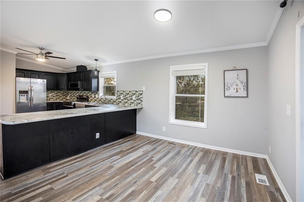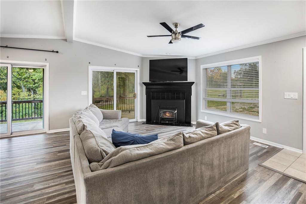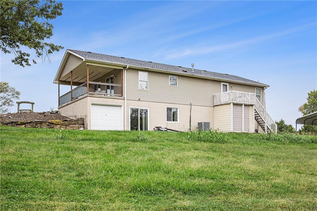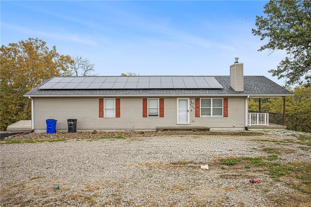 Experience the perfect blend of space, style, and comfort in this beautifully updated 3-bedroom, 2-bath home set on 2.7 peaceful acres. The property backs to a picturesque neighboring pond an incredible setting that must be seen to be fully appreciated. The spacious living area features luxury vinyl plank flooring, neutral tones, and a striking black fireplace as the centerpiece. The updated kitchen shines with sleek black cabinetry, stainless steel appliances, a custom backsplash, and a large peninsula for casual dining. The adjoining dining area opens to a covered patio—ideal for relaxing or entertaining while overlooking the expansive yard. The private primary suite offers a serene retreat with a walk-in closet and spa-like ensuite featuring dual vanities and a glass-enclosed shower. Two additional bedrooms and an updated hall bath provide space for family, guests, or a home office. A large finished basement adds even more versatility—perfect for a rec room, home gym, or media space. The laundry room includes cabinetry and modern finishes for convenience. Outside, enjoy the quiet country setting with mature trees and plenty of room to roam. The roof includes solar panels that can be connected if the buyer wishes, offering the option for energy savings and sustainability. Move-in ready and full of thoughtful updates, this property combines modern living with the tranquility of acreage living—just minutes from town amenities.