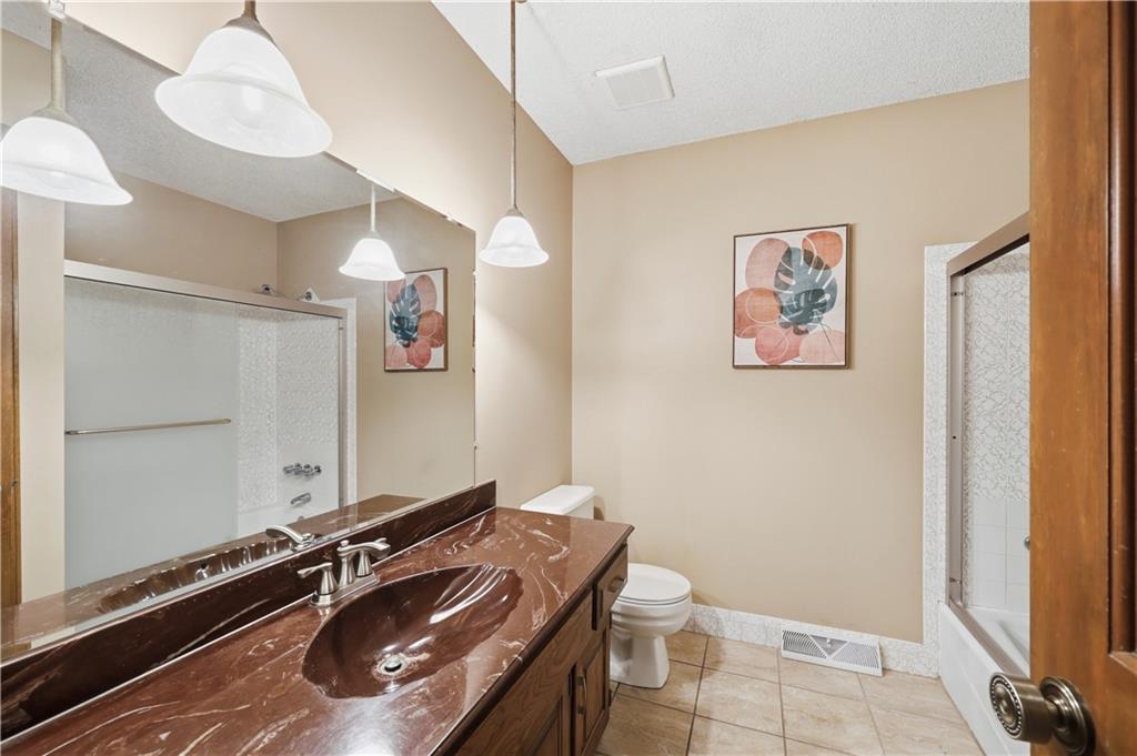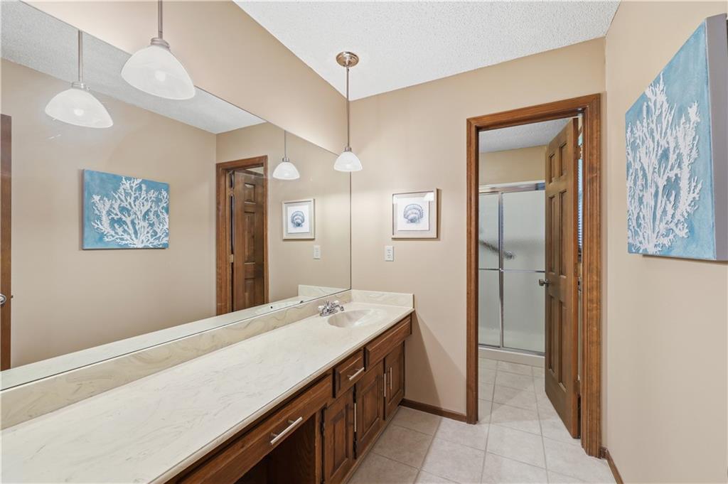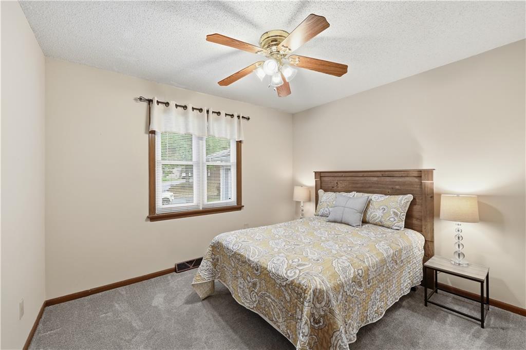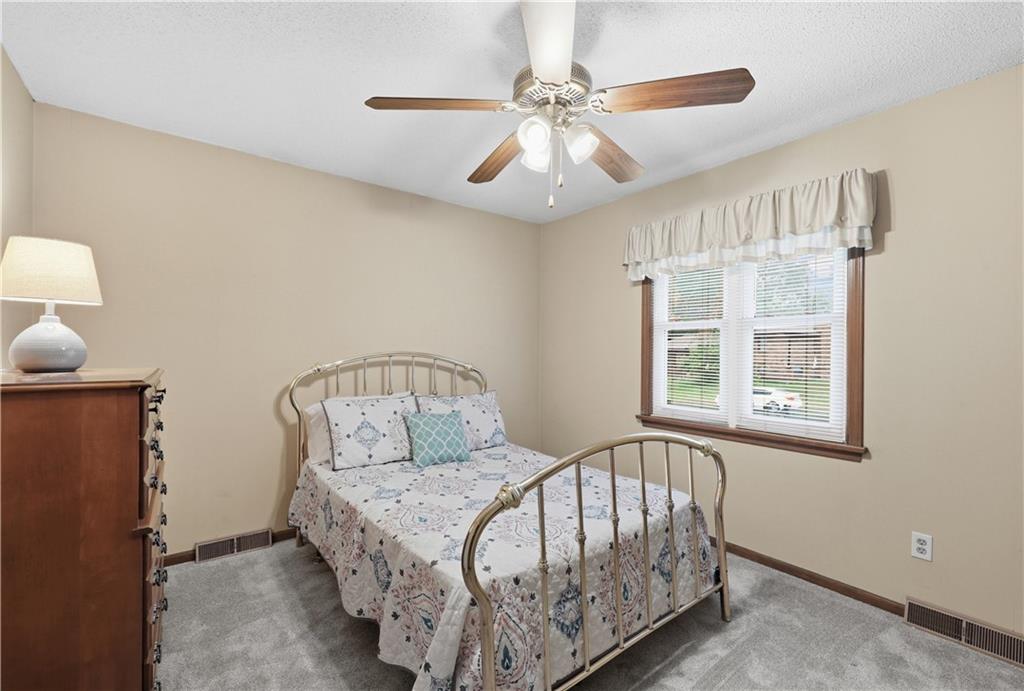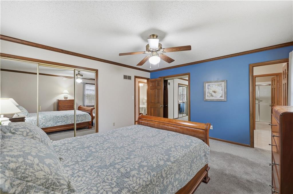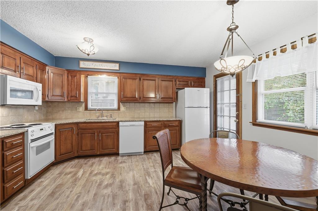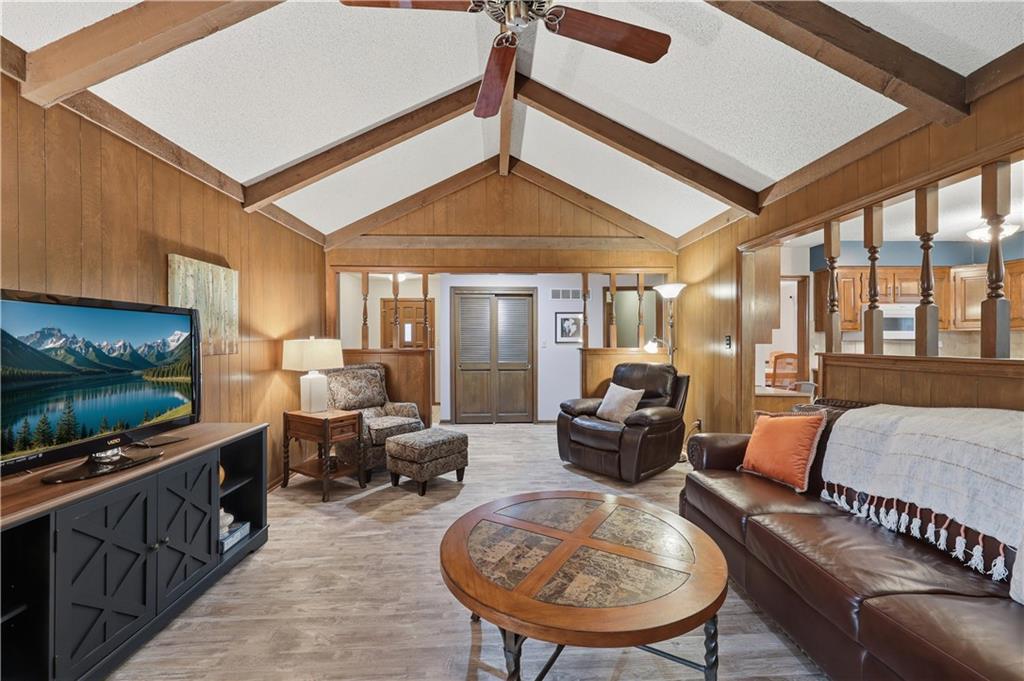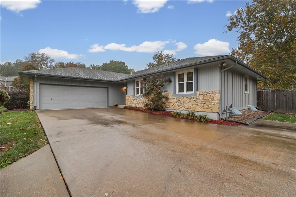 Beautifully maintained, move-in ready full ranch in the established Castle Woods neighborhood of Independence. This 3-bedroom, 2.5-bath home offers comfortable main floor living in a quiet community with convenient access to highways, shopping, and dining. Step inside to find a spacious entry that leads to an impressive great room with vaulted ceilings, exposed beams, built-ins, and a dramatic fireplace that creates a warm and inviting gathering space. The eat-in kitchen features granite countertops, updated backsplash, and a formal dining area perfect for entertaining. The main level is one-step entry from garage, and includes a separate laundry room with extra storage. The primary suite offers dual closets with built-in organization and shelving to maximize storage, along with a private en-suite bath. Downstairs, the fully finished lower level provides a wide open recreation room with a fireplace, a non-conforming bedroom, and abundant storage space. Recent updates include new refrigerator, new luxury vinyl plank flooring, newer carpet, a newer furnace (Jan 2024), new hot water heater, and Maytag washer and dryer. Outdoor features include an oversized patio, privacy-fenced backyard, and a large storage shed with ramp access. The backyard is private and peaceful, and with the shed, ideal for pets, hobbies, or outdoor entertaining. Over the years, the sellers have made thoughtful improvements such as updated windows, driveway, kitchen and bath hardware, light fixtures, granite countertops, backsplash, and easy-care landscaping. This home has been meticulously cared for and reflects true pride of ownership throughout.