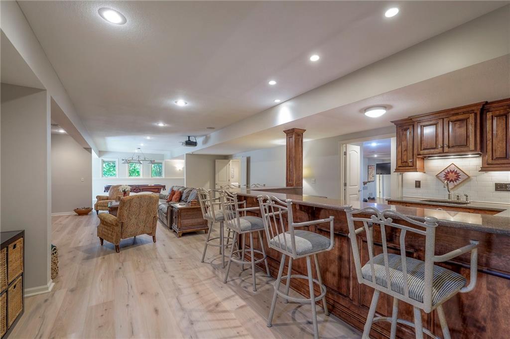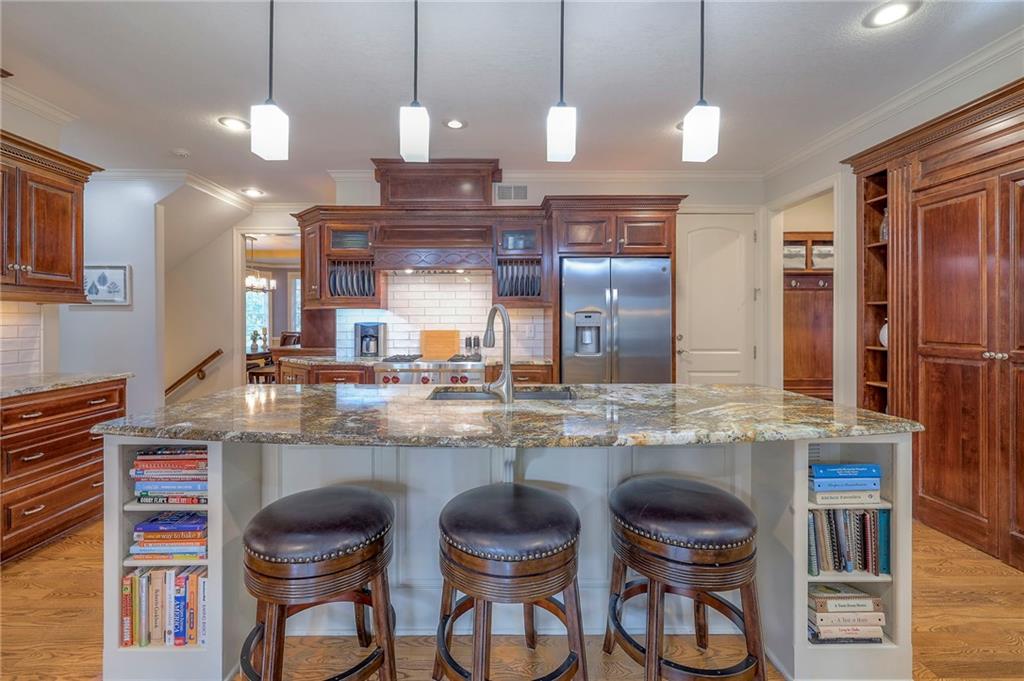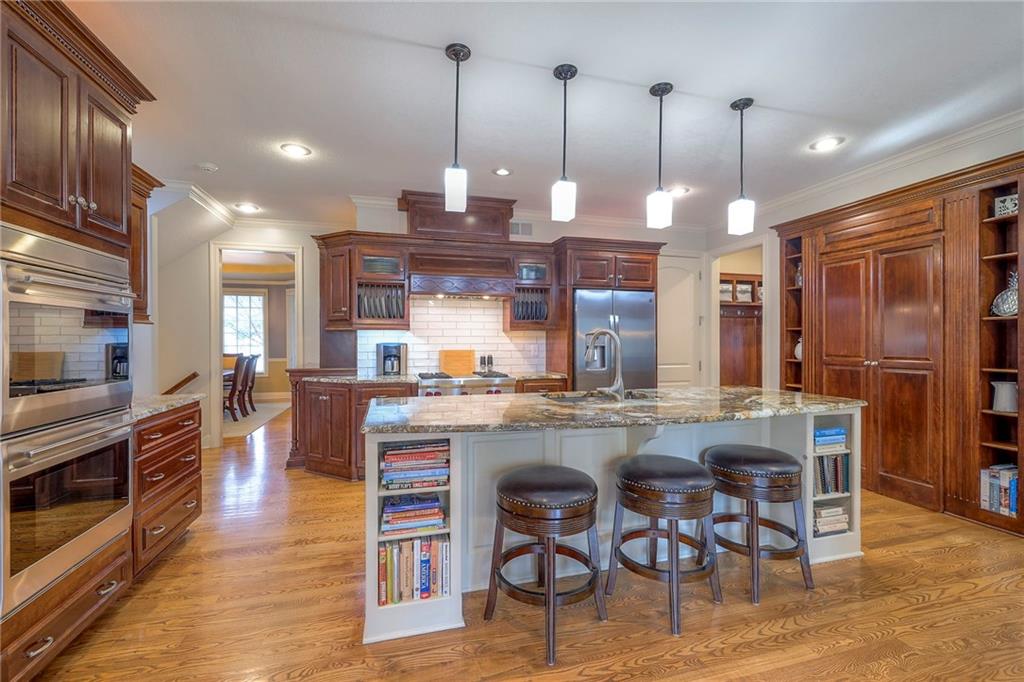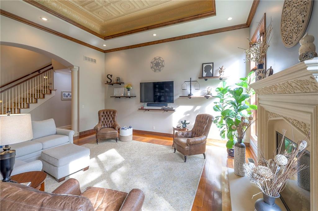 Welcome home to this stunning custom-built 1.5-story residence offering over 6,400 sq. ft. of beautifully designed living space in one of Overland Park’s most desirable neighborhoods. Step through the grand double-door entry into a welcoming foyer that sets the tone for what’s ahead. The oversized formal dining room is ideal for holiday gatherings and entertaining. The main-level living room impresses with its tall ceilings, elegant fireplace, built-in bookshelves, and incredible natural light—it’s a space you simply have to see in person. The gourmet kitchen is fabulous, featuring an oversized hearth room, a Wolf gas cooktop, a beverage fridge, a large kitchen island with seating, abundant cabinetry, and ample counter space—perfect for everyday living or hosting friends and family. The laundry room is conveniently located on the main level and offers plenty of extra space for functionality. The primary suite is a retreat of its own, complete with tray-vaulted ceilings, gorgeous hardwood floors, and a newly remodeled spa-like bathroom featuring a freestanding soaking tub, walk-in sauna, walk-in shower, and an expansive closet. Upstairs, you’ll find three spacious secondary bedrooms, each with fantastic closet space, plus a bonus loft area ideal for a reading nook, study space, or playroom. The finished lower level is an entertainer’s dream—boasting a large rec room with fireplace, second kitchen and bar area, room for a pool table, kids’ play area, and a dedicated exercise room. The home also features a suspended garage, providing an abundance of extra storage space, and the walk-up/walk-out design adds both light and convenience. Step outside to a fully fenced backyard featuring black metal fencing, a composite deck, and a large patio—the perfect setting for outdoor relaxation or entertaining. This home truly has it all—incredible design, comfort, and craftsmanship—and must be seen in person to be fully appreciated!