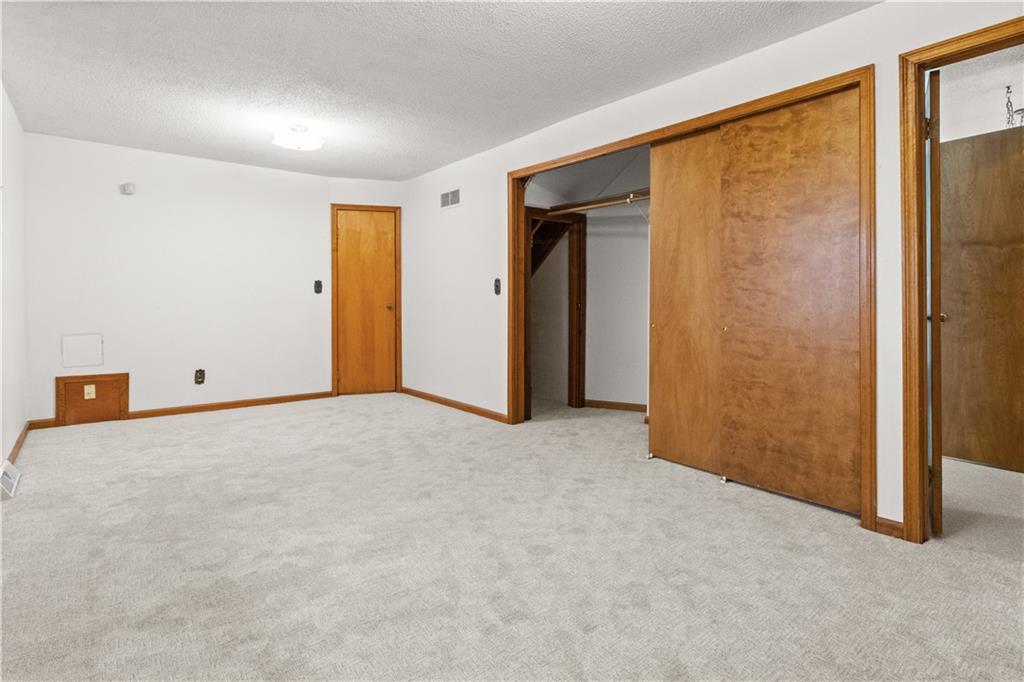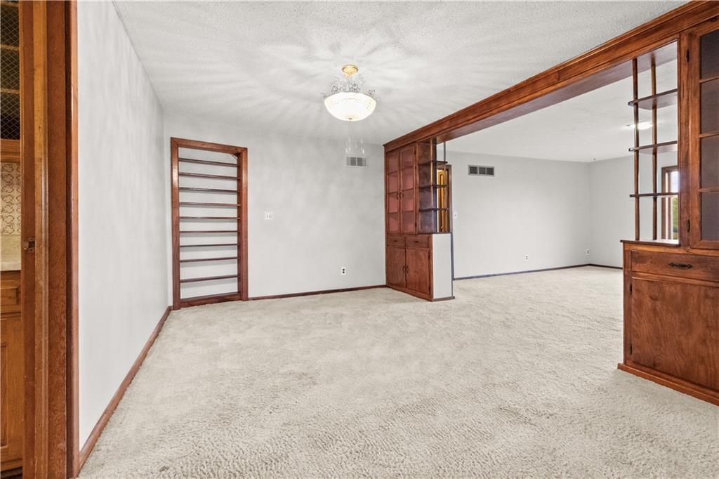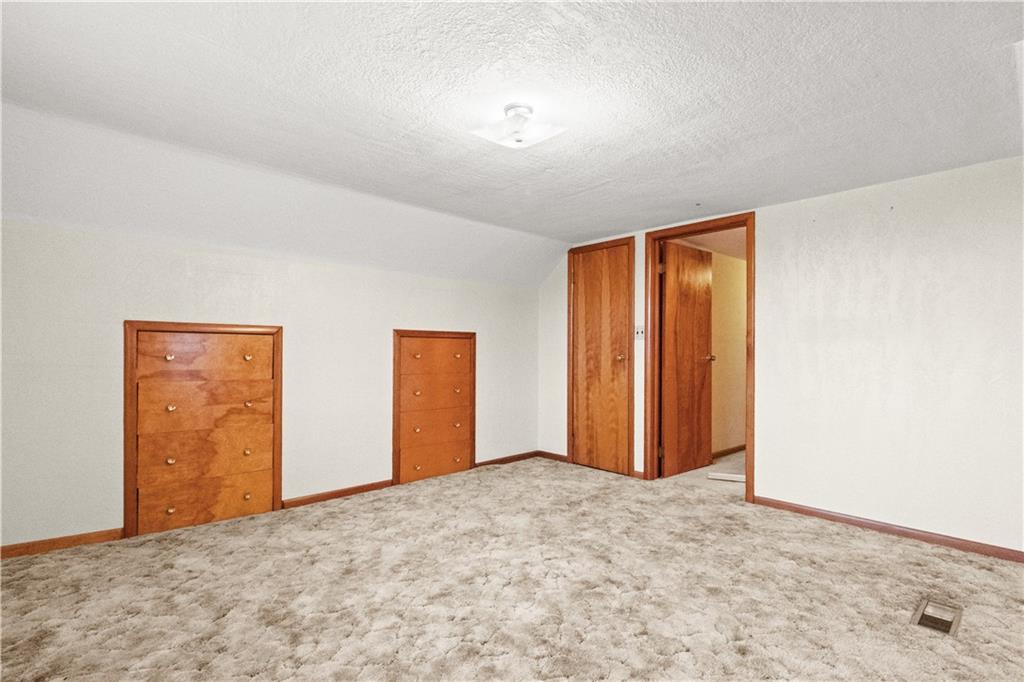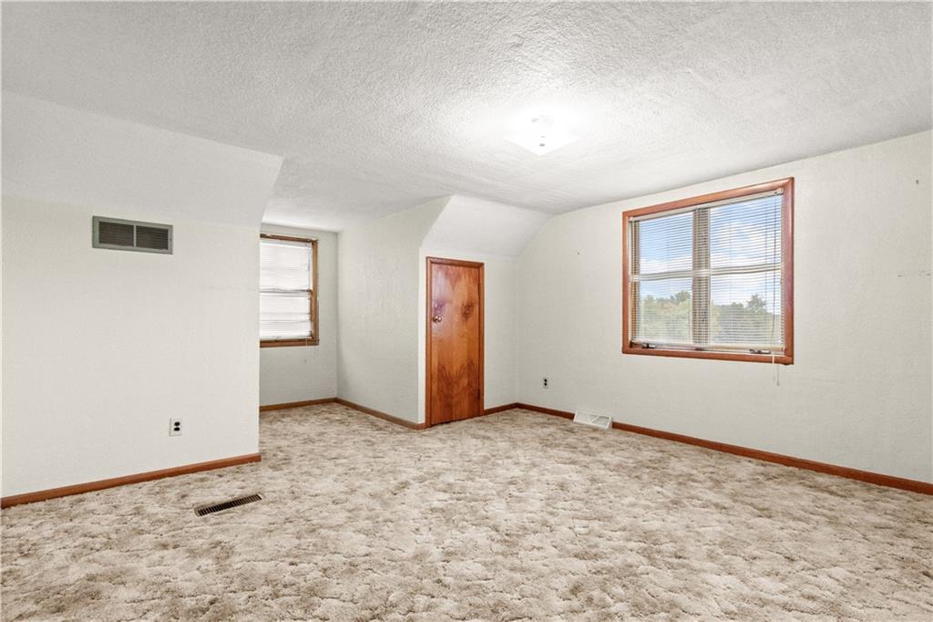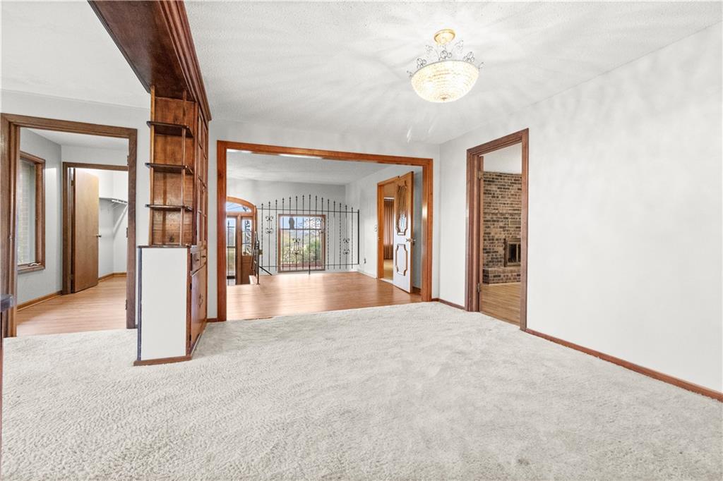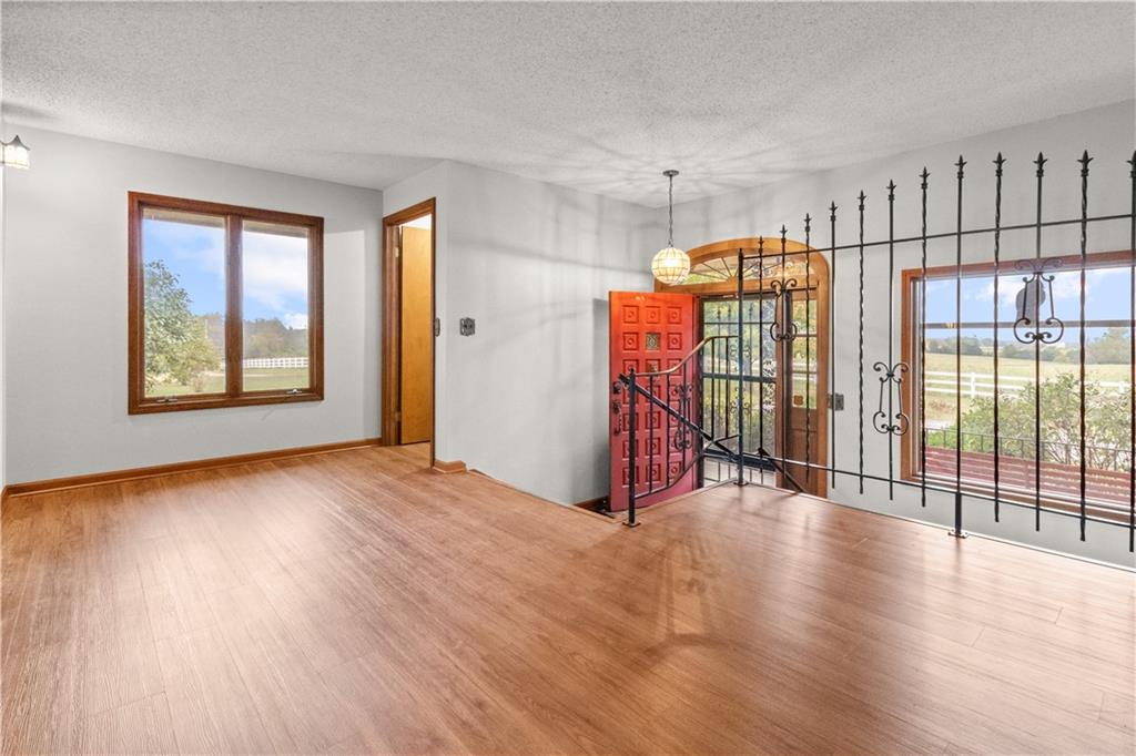 5-Acre Private Estate with Classic Farmhouse Charm! Discover the tranquility of country living with this classic two-story residence, perfectly situated on 5 expansive acres of lush, rolling green space. The home features a timeless exterior defined by rich red brick construction and a dark shingle roof, accented by charming dormer windows that hint at the generous living space inside. The sprawling acreage offers privacy, beautiful views, and endless potential for gardening, recreation, or equestrian pursuits, framed by mature trees and fencing. Traditional Interiors with Warm Wood Accents! Step inside to find voluminous, light-filled rooms with an abundance of original, character-filled details. The main level features a large living area centered around an impressive, floor-to-ceiling brick fireplace, providing a cozy focal point and architectural separation from the kitchen. This area is finished with soft, neutral carpeting and contrasting natural wood trim. The heart of the home is a wide-open kitchen and dining area boasting beautiful hardwood flooring. It is appointed with ample natural oak cabinetry and features a classic tiled backsplash, ready for the chef's touch. A built-in oven and microwave unit completes the functional layout. Upstairs offers substantial bedrooms and a unique bonus space. A standout feature is this large vaulted room, which showcases stunning exposed wood beams across the ceiling, giving it a dramatic, rustic-chic atmosphere—perfect for a studio, or recreation room. Additional bedrooms are generously sized, featuring plush carpeting, bright windows, and the potential for personalization. This property provides the perfect blend of private, expansive outdoor living and a warm, classic interior with excellent "bones" awaiting your personal upgrades and style!