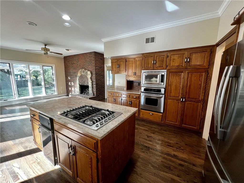 Fabulous Saul Ellis custom built 2-story home in cul-de-sac. This house is perfect for entertaining with its very generous sized rooms. Wet bar with built-ins in the LR along with a gas log fireplace. Dining room with more built-ins. Beautiful panelled library with lots of book shelves. Warm and inviting kitchen and hearth room with gas log fireplace. Two half baths on first floor. Master bedroom and three other bedrooms on 2nd floor all with walk-in closets. Great patio and spacious backyard. This home is ready for your vision of paint colors and carpet.