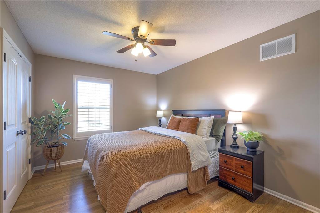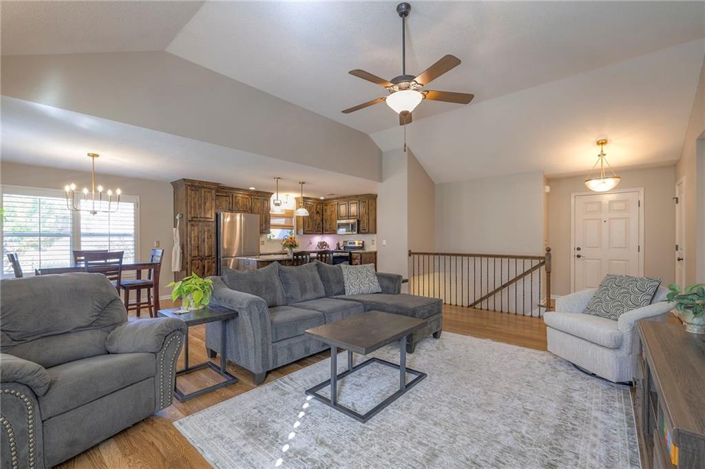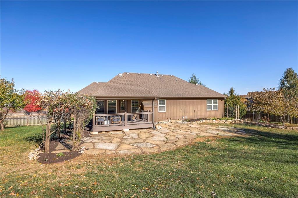 Lovely ranch home perfectly situated on an oversized .54-acre corner lot in Shawnee! Step inside to discover beautifully refinished hardwood floors throughout the main level, fresh interior paint, and new light fixtures that make the home feel bright and updated. The open layout seamlessly connects the living room, kitchen, and dining area for effortless everyday living. The living room features a vaulted ceiling, plantation shutters, a cozy fireplace, and wonderful natural light, creating a warm and peaceful space to relax. The kitchen is equally impressive, featuring granite countertops, stainless steel appliances, a large island, and ample pantry space—perfect for both cooking and entertaining. Step outside to a covered deck overlooking your large, fenced backyard, which backs onto a private, treed area. Whether you’re hosting gatherings or enjoying your morning coffee, this outdoor setting offers beauty and tranquility. The primary suite features a vaulted ceiling, a walk-in closet, and an en-suite bath with a double vanity, shower, and a large soaking tub. Two additional main-level bedrooms include hardwood floors and generous closet space. The finished basement expands your living space with a spacious rec room ideal for movie nights, watch parties, or game days. A fourth bedroom with a huge walk-in closet and updated full bath, plus a bonus office or workout room, offers even more flexibility. There’s also abundant storage or workshop space for all your extras. Laundry hookups are available on both the main level and in the basement for added convenience. The three-car garage features tall ceilings and ample space, even accommodating a full-size truck. Fantastic location close to Shawnee Mission Parkway amenities, City Center’s new development at 87th Street, and zoned for the De Soto School District, including Mill Valley High School. Enjoy the tree-filled scenery that makes this part of Shawnee so special. Make this beautifully updated ranch home yours