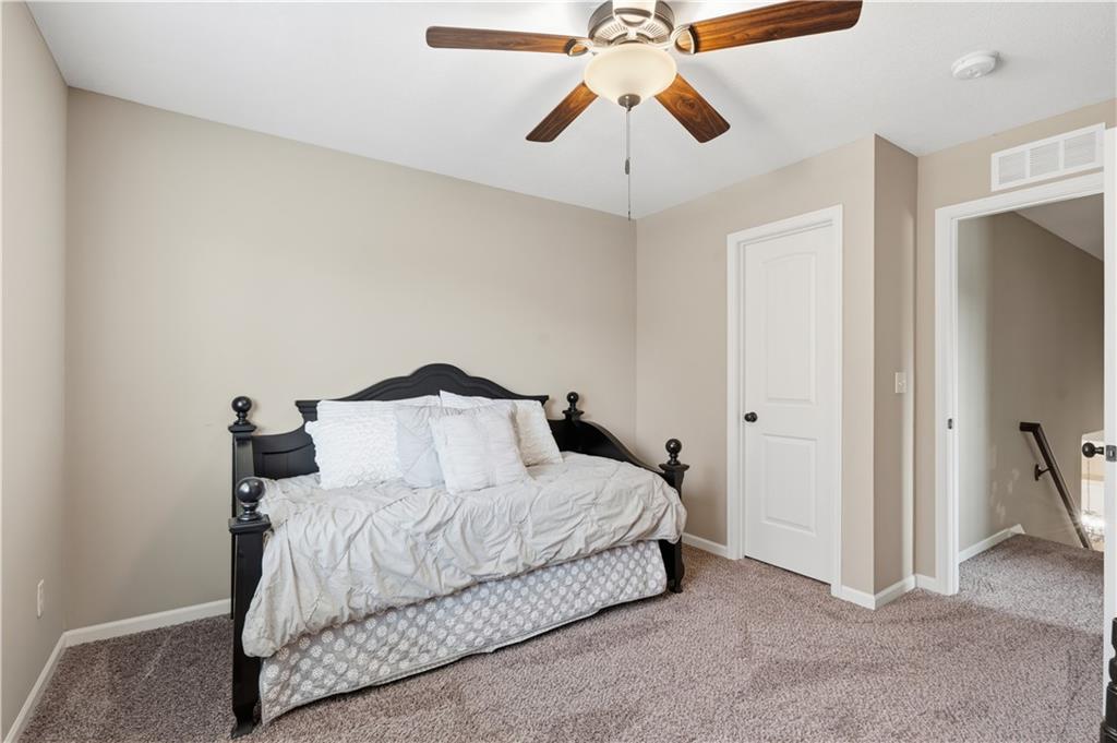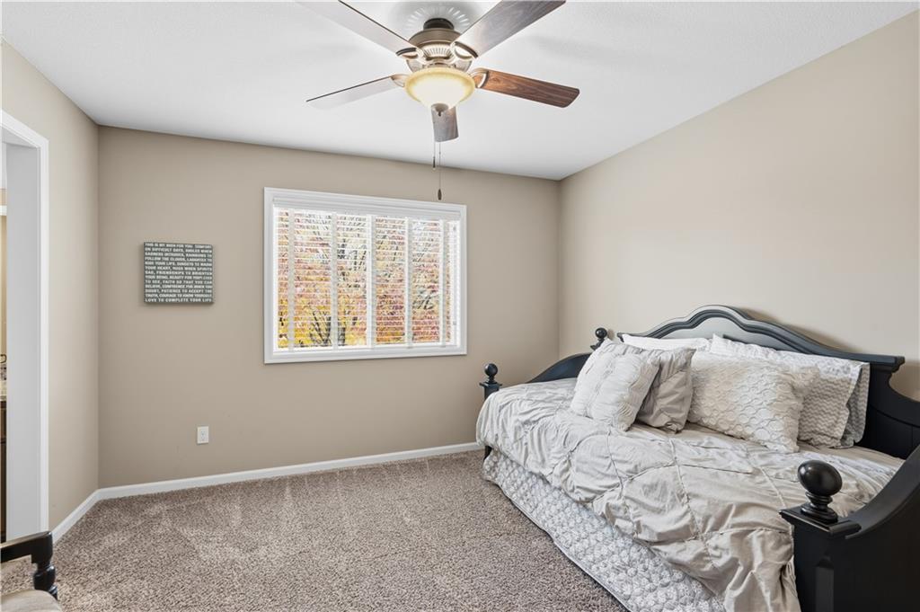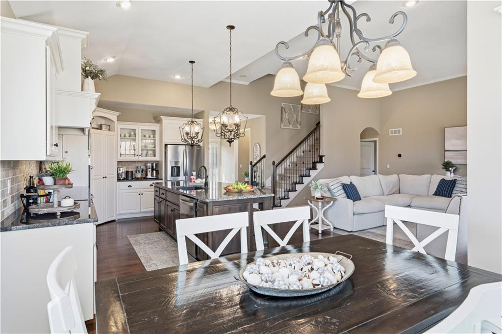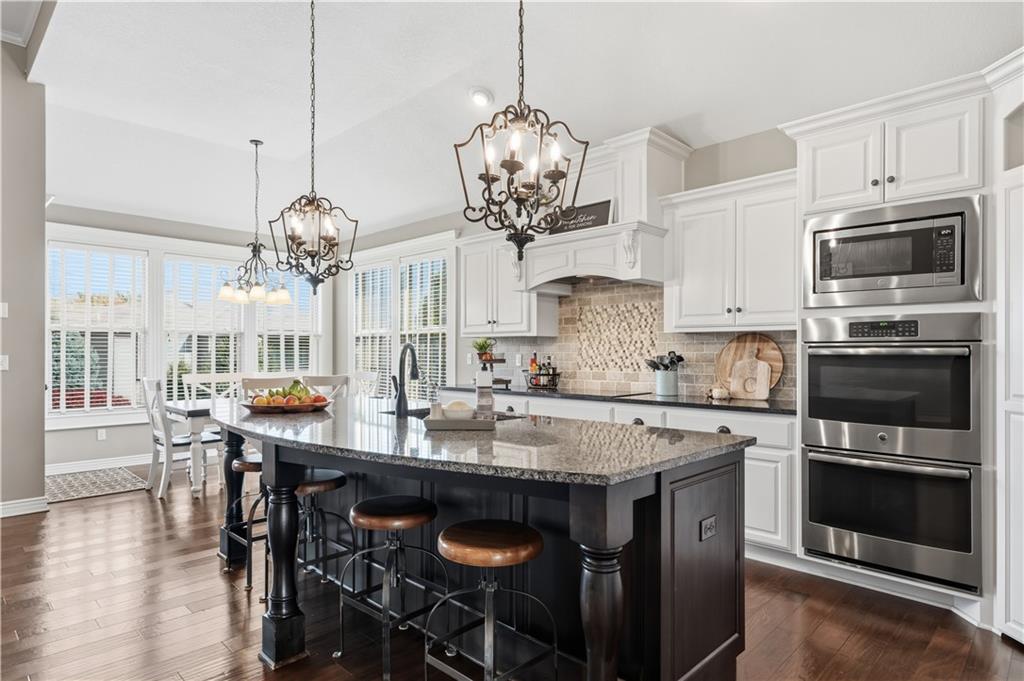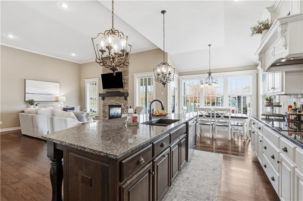 Beautiful "Cherry Creek II" plan by Summit Custom Homes. This 1.5 story plan in Falcon Valley features a spacious primary bedroom & bath on the main level. Also, on the main level you'll find the kitchen, vaulted great room w/see through fireplace, breakfast room, an office, laundry room, and all of this charm steps out onto a covered patio w/tons of beautiful landscaping to enjoy & relax within. Upstairs, there are (3) ample sized bedrooms w/2 full baths. In the lower level, you'll get to experience the comfortable ambience of the beautiful rec room w/Bar as well as a (5th) bedroom and 4th full bath. This home has been lovingly maintained and lived in by the original owners. Exterior was just painted, new carpeting on the stairs and in main level office. This gorgeous house sits upon a cul de sac lot w/access to the sidewalks for walking your dog or just taking a leisurely stroll. Great location in Lenexa. Close to highways, schools, dining and more.