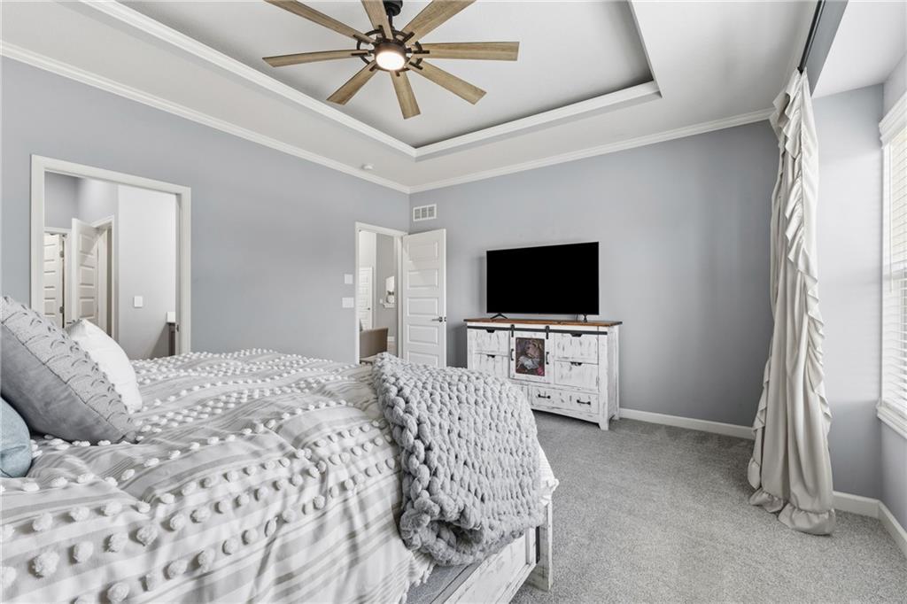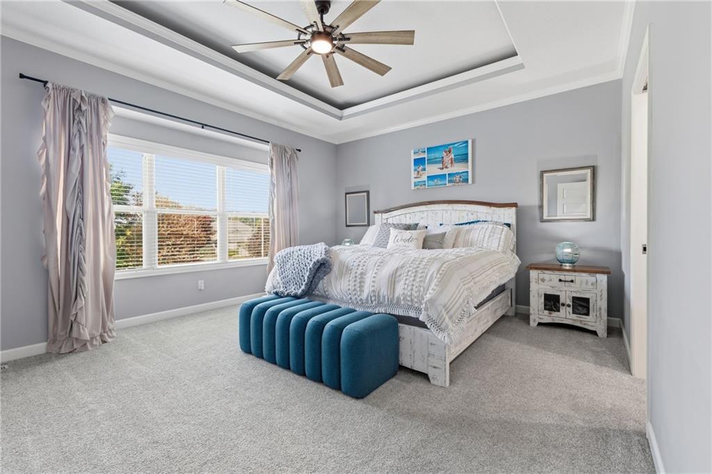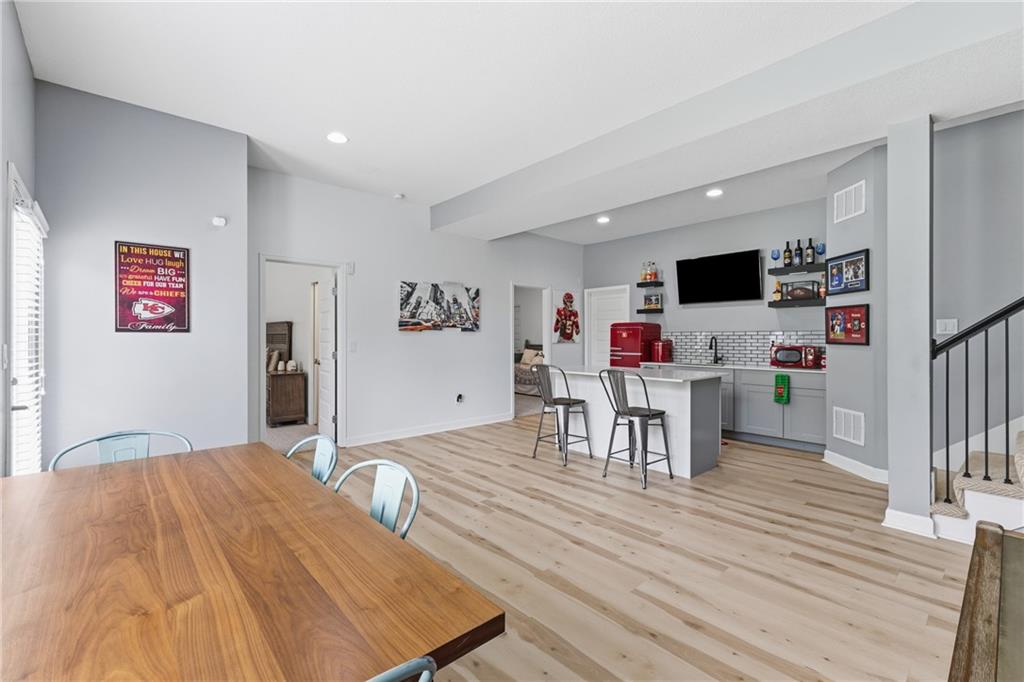 Welcome to this spacious 3,845 sq. ft. home situated on a .47-acre cul-de-sac corner lot in the highly sought-after Staley Farms Subdivision. This home combines elegance and functionality with soaring ceilings, updated lighting throughout, and refinished hardwood floors. The exterior received fresh paint in 2022, new landscaping in 2025, updated front door and the main-level full bath has been beautifully remodeled. (new roof will be installed prior to closing) Enjoy your evenings and weekends catching games on the TV on covered back deck. The main level offers 3 bedrooms, including a luxurious master suite with a large two-headed shower and a walk-in closet. The finished basement features high ceilings 2 additional bedrooms with a Jack-and-Jill bath, a full bath off the family room, and a wet bar with an island for entertaining. Equipped with a 4th-car garage perfect for storage or a golf cart. Extra features include abundant storage and a built-in safe room ideal for valuables or shelter. Add a hot tub to the back porch, the home is already wired for it. Enjoy all the neighborhood amenities Staley Farms has to offer: a zero-entry pool, lap pool, gym, basketball and tennis courts, volleyball court, and a children’s play area. Perfect for family living and entertaining, this home offers comfort, style, and endless possibilities.