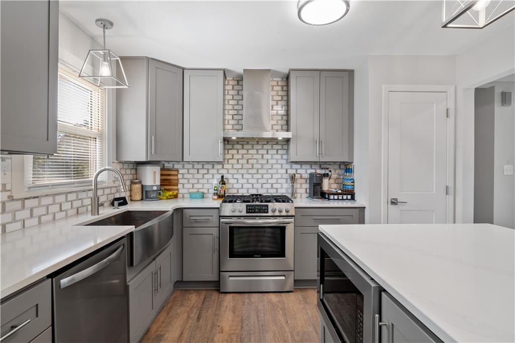 Meticulously maintained 4-bedroom, 2 bath, nestled near the heart of Parkville. This clean, move-in-ready home features nearly 1842 square feet of living space. Open- concept living room with cozy fireplace flows into the stunning eat-in kitchen with new cabinetry, oversized center island with built in microwave, new stainless-steel appliances, and tile backsplash. Primary bedroom includes private en-suite with tiled shower. Two additional bedrooms share a second full bath. Walk-out lower level offers a fourth bedroom AND a bonus rec room for entertaining. Detached outdoor deck perfect for grilling and relaxing. Rear-entry 2-car garage with abundant driveway parking. Neighborhood Park with-in walking distance. Easy access to top-rated schools, shopping and dining, you will enjoy the best of suburban living with the vibrant KC lifestyle just a stone's throw away.